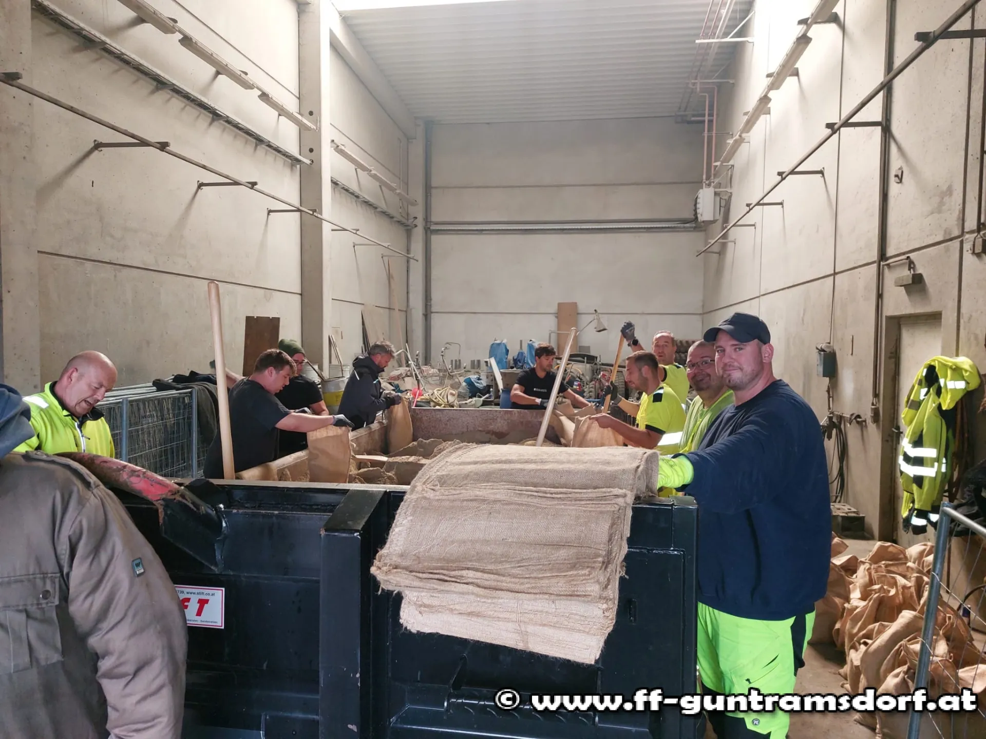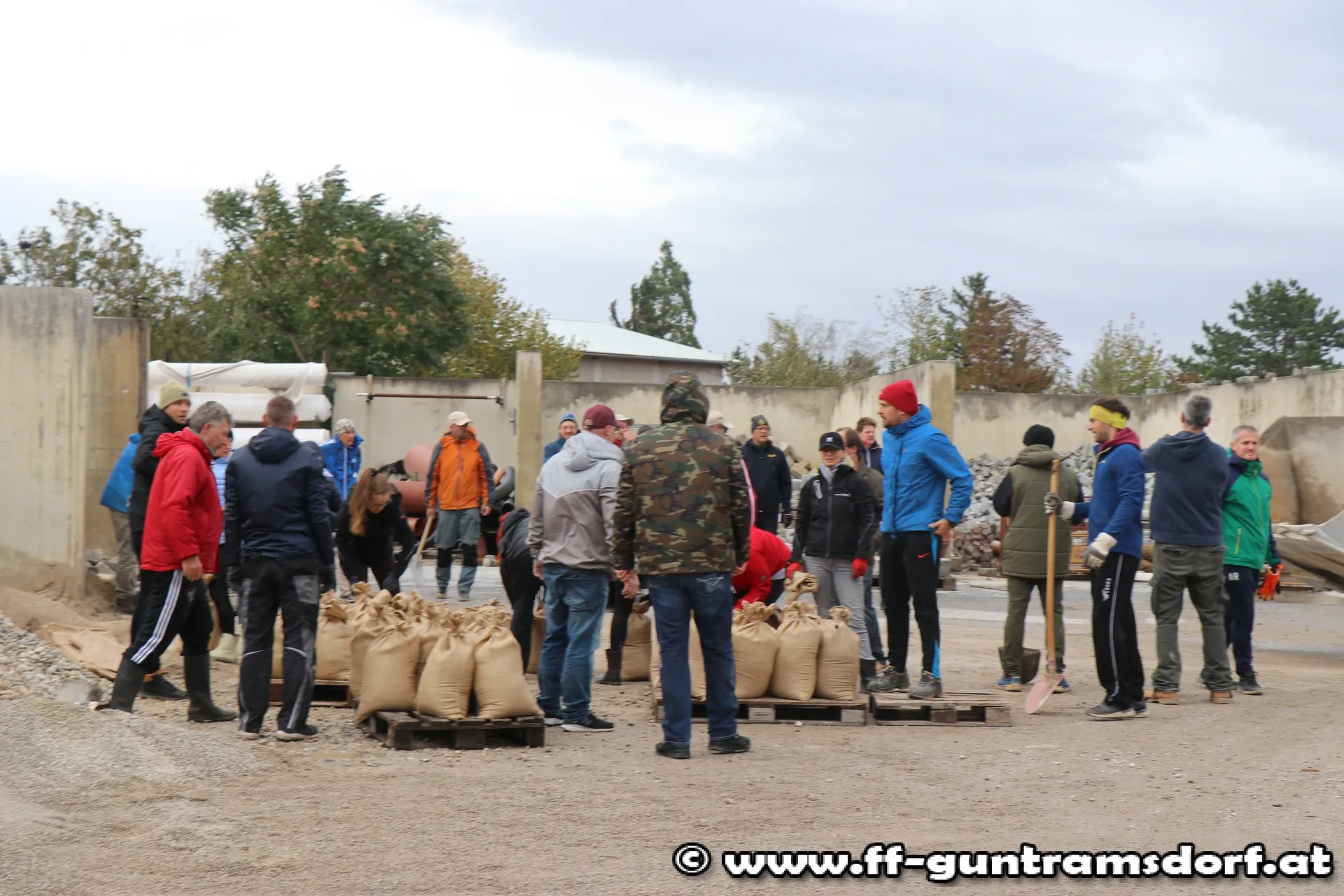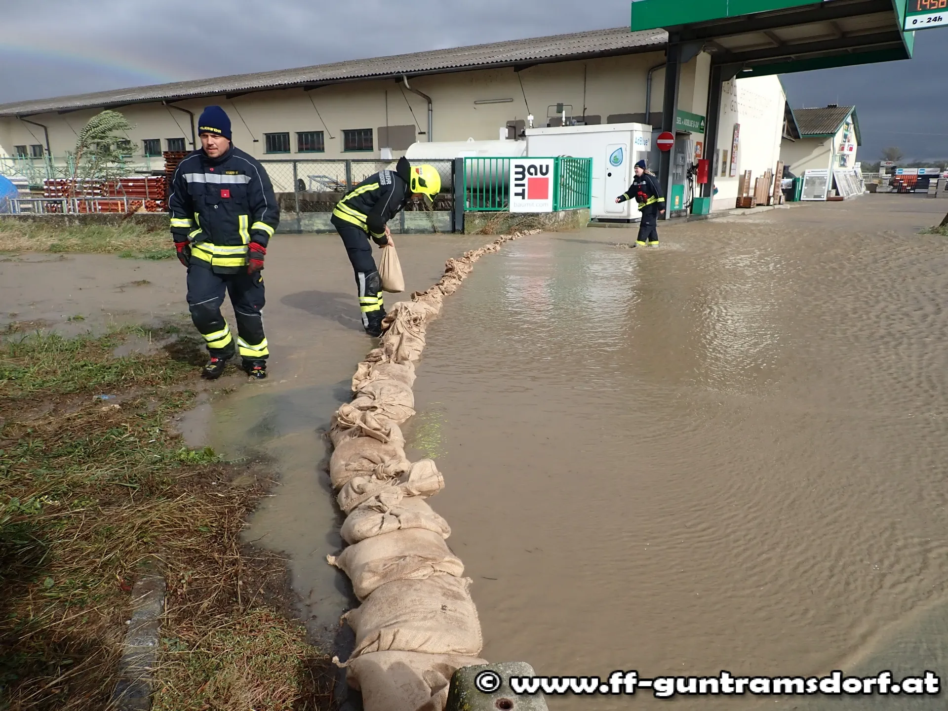 In Zusammenarbeit mit Freiwilligen aus der Zivilbevölkerung, der Kirchengemeinde St. Jakobus Neu-Guntramsdorf sowie dem Kleingartenverein Guntramsdorf und Gemeindearbeitern werden im Akkord Sandsäcke gefüllt und zu den betroffenen Arealen ausgeliefert.