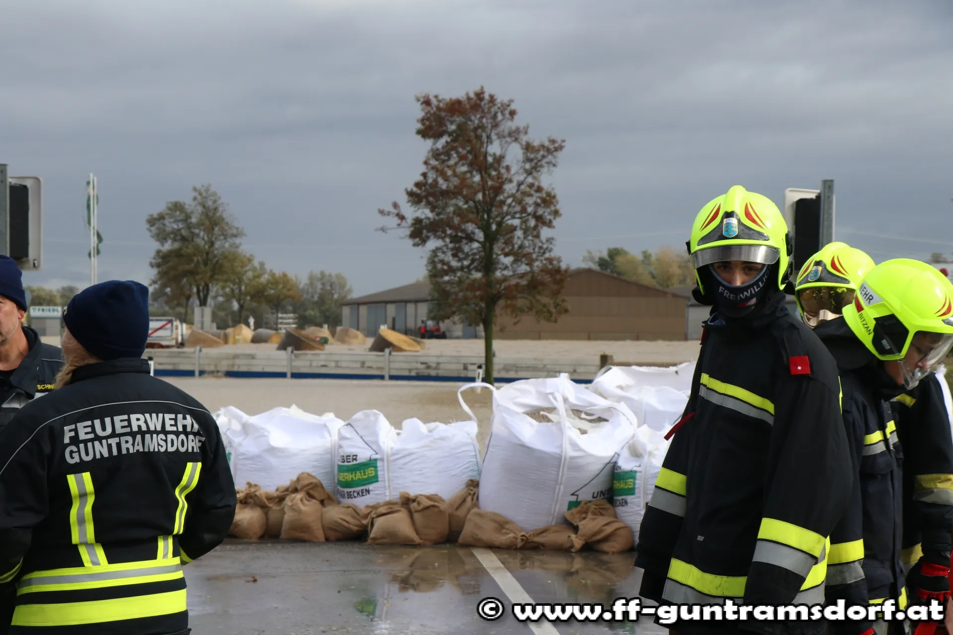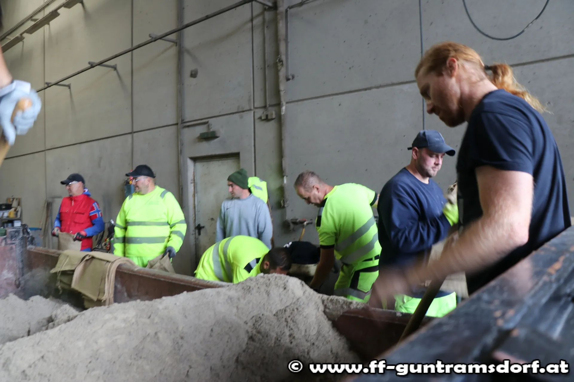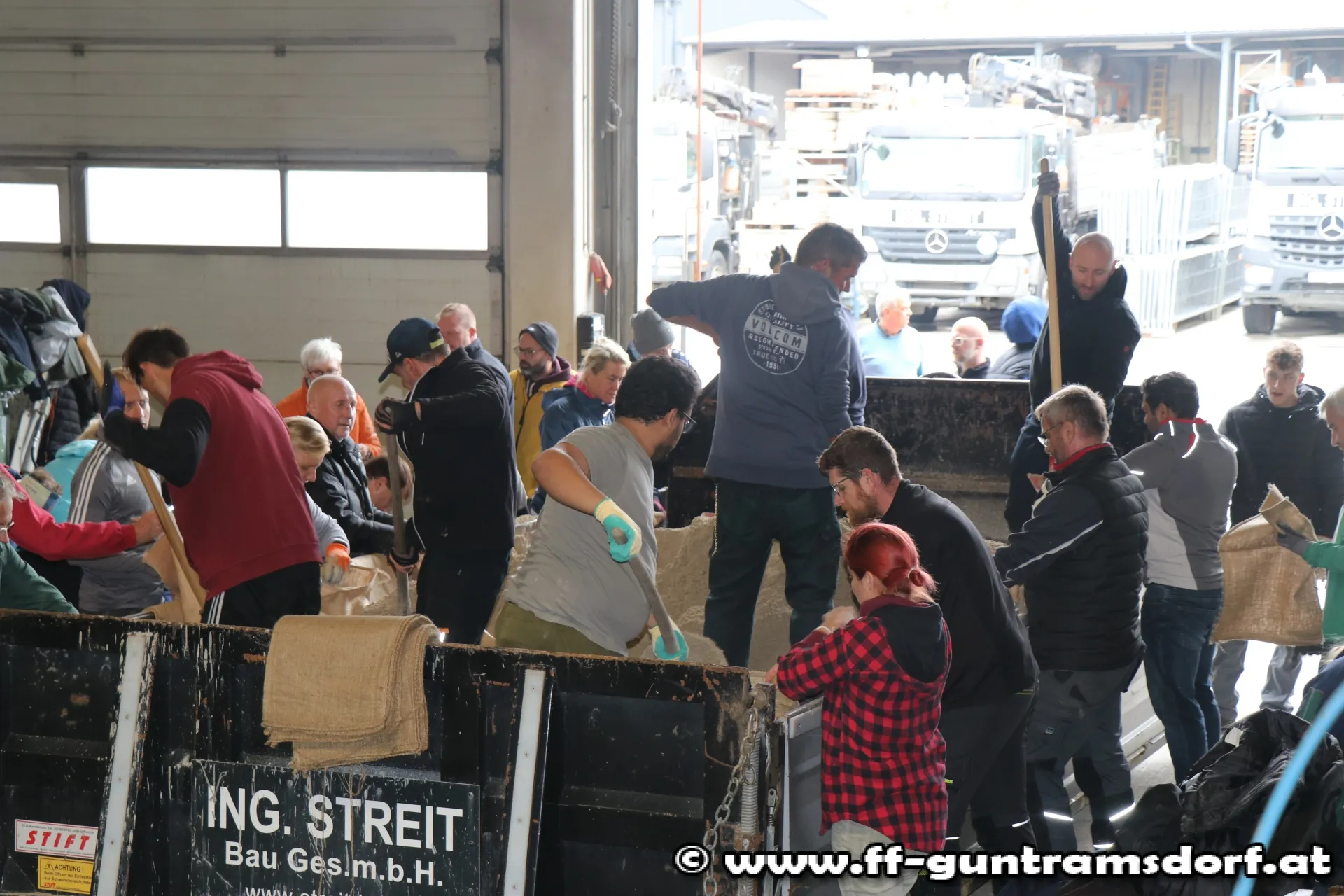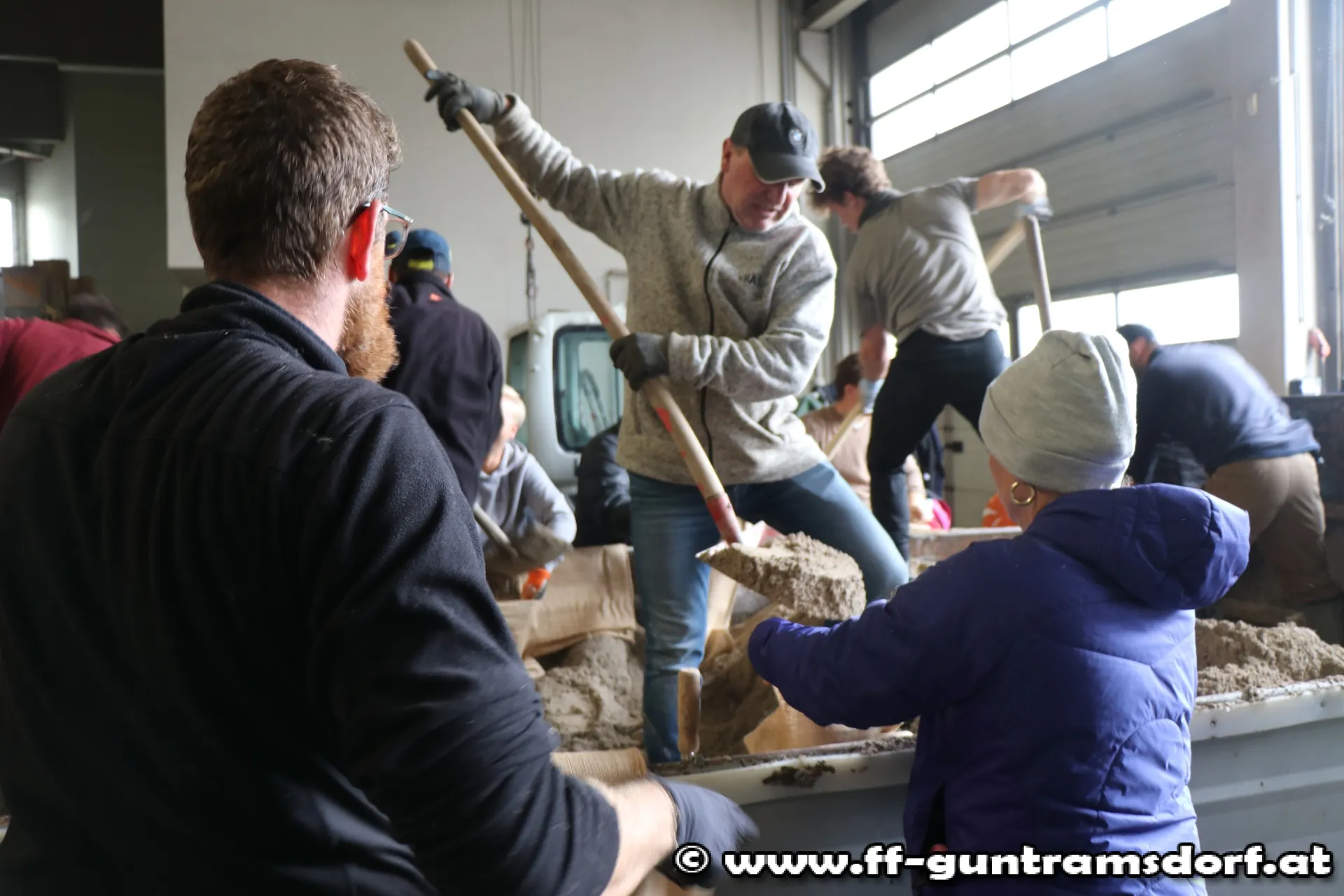 In Zusammenarbeit mit Freiwilligen aus der Zivilbevölkerung, der Kirchengemeinde St. Jakobus Neu-Guntramsdorf sowie dem Kleingartenverein Guntramsdorf und Gemeindearbeitern werden im Akkord Sandsäcke gefüllt und zu den betroffenen Arealen ausgeliefert.