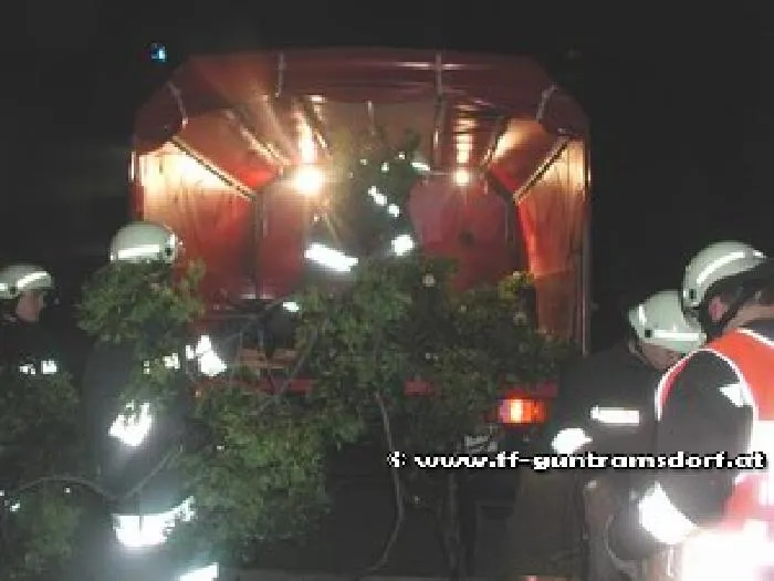 In der Zwischenzeit wurde der Stamm in kleinere Stücke geschnitten, die mit Hilfe des Krans des Schweren Rüstfahrzeuges auf einem Grünstreifen gelagert wurden. Wenig später war der Last wieder zur Stelle, sodass die restlichen Äste aufgeladen werden konnten. Damit war die Anningerstraße in diesem Bereich wieder passierbar.