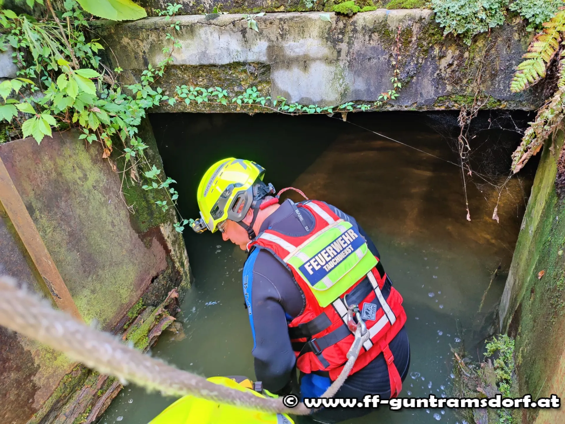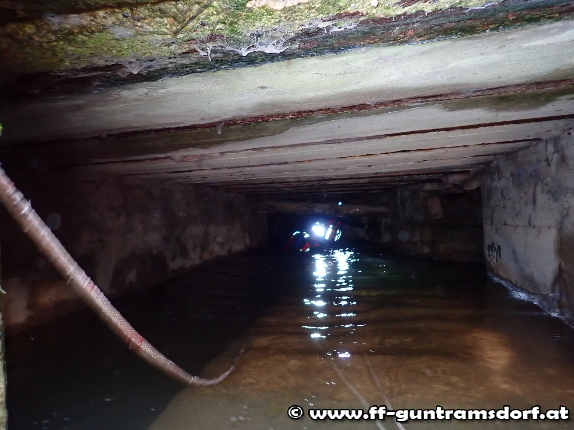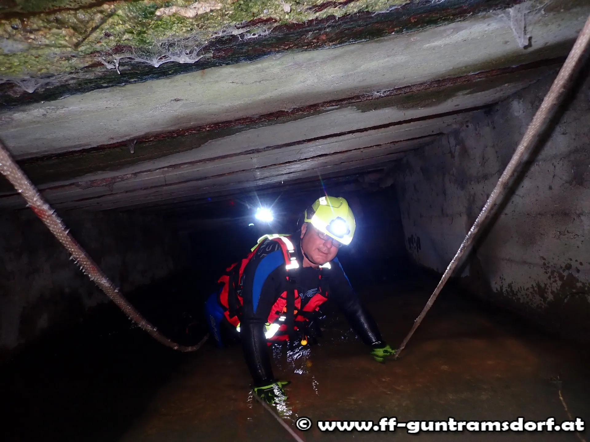 Ausgerüstet mit Neoprenanzügen und mit Leinen gesichert, drangen sie in den unterirdischen Bachlauf vor und konnten die durch diverses Schwemmmaterial verursachte Verklausung beseitigen.