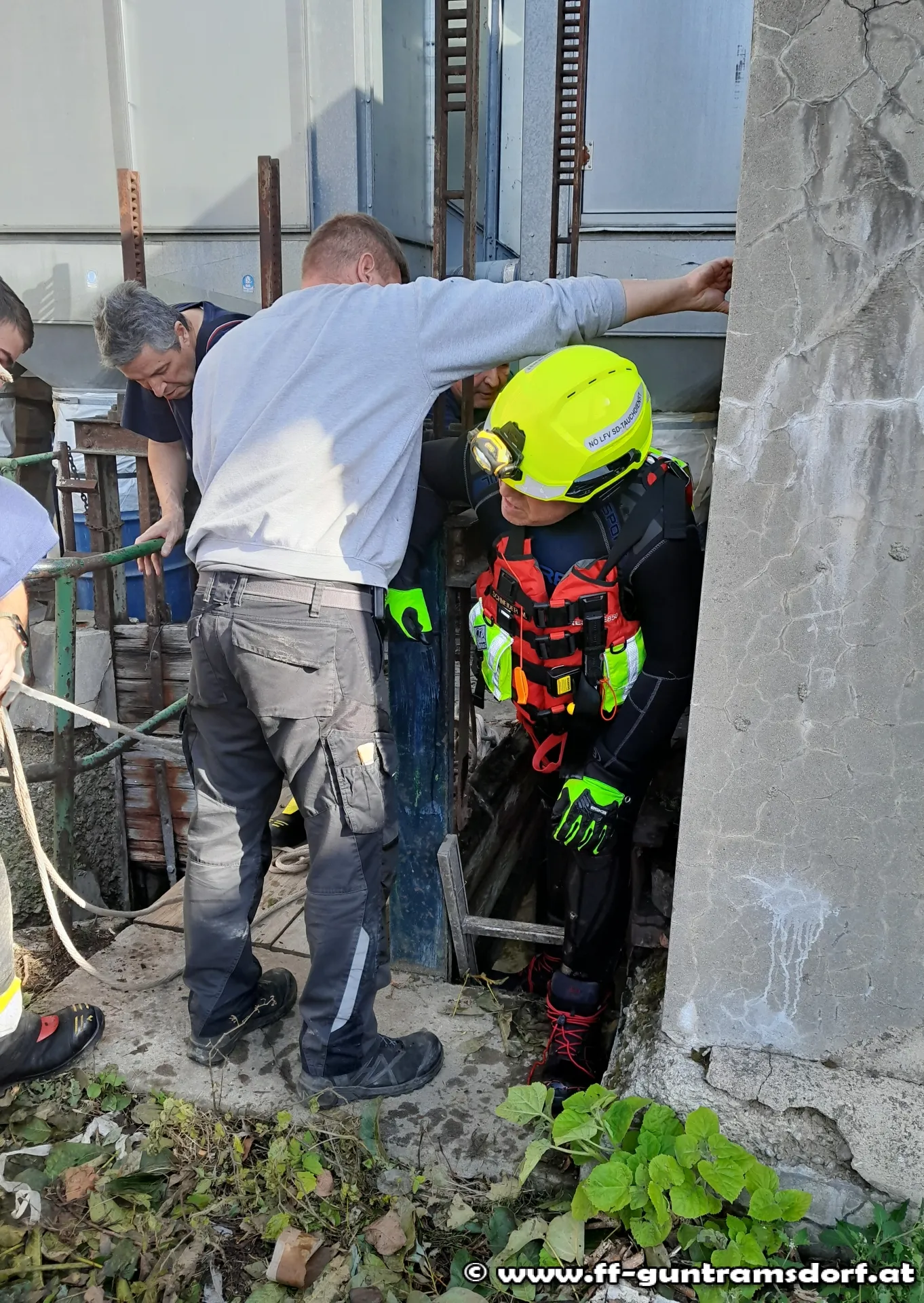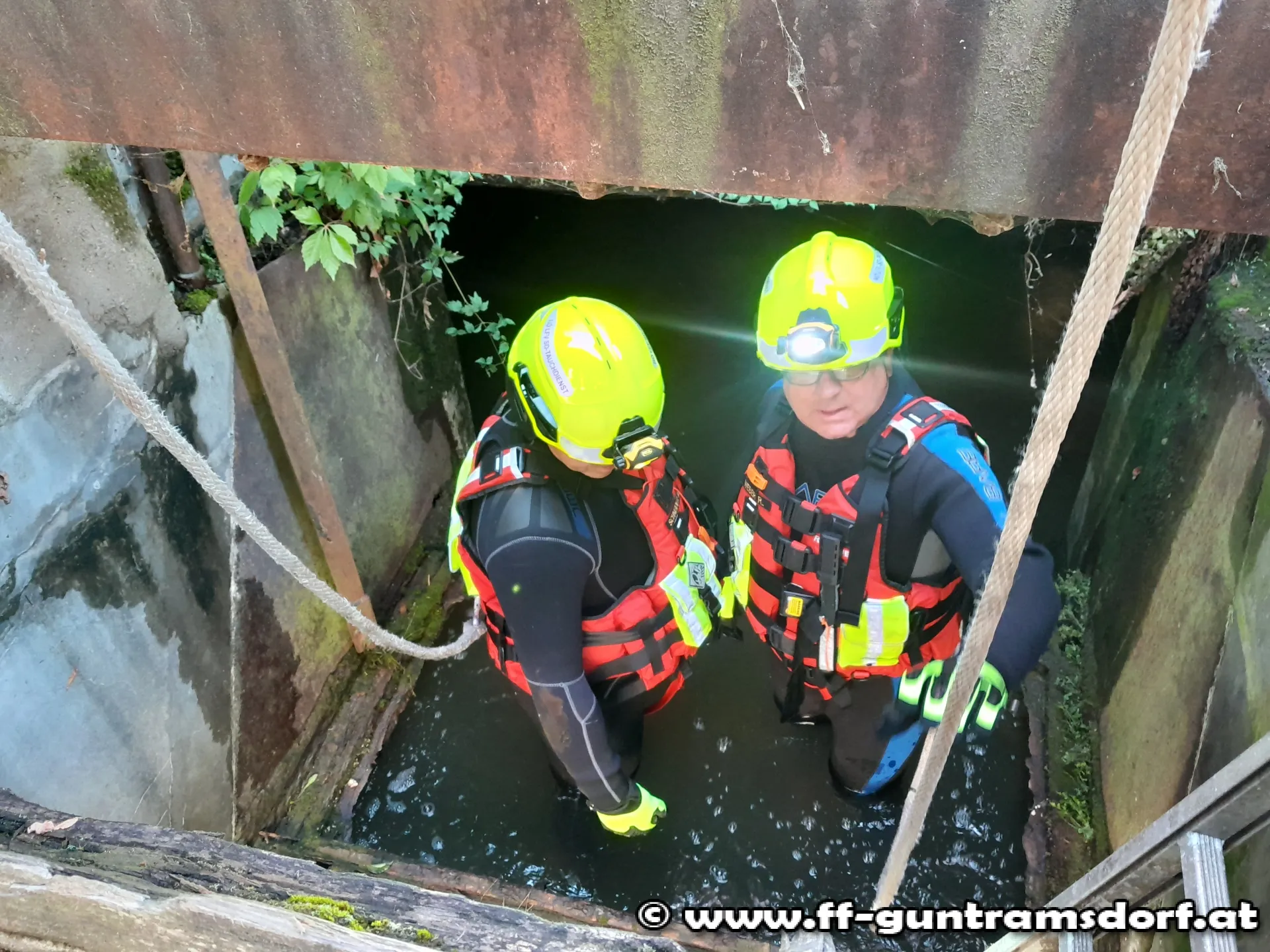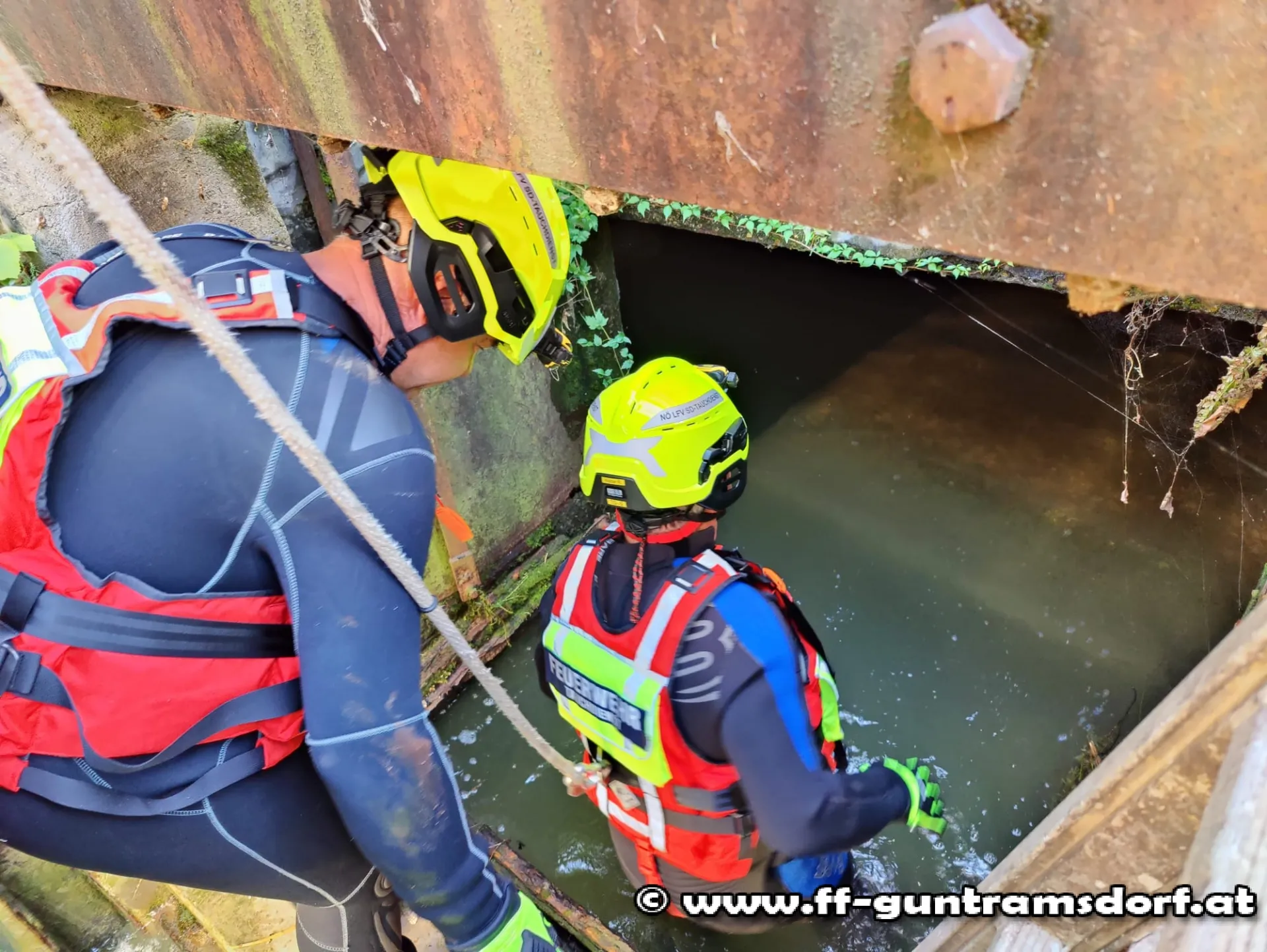 Ausgerüstet mit Neoprenanzügen und mit Leinen gesichert, drangen sie in den unterirdischen Bachlauf vor und konnten die durch diverses Schwemmmaterial verursachte Verklausung beseitigen.