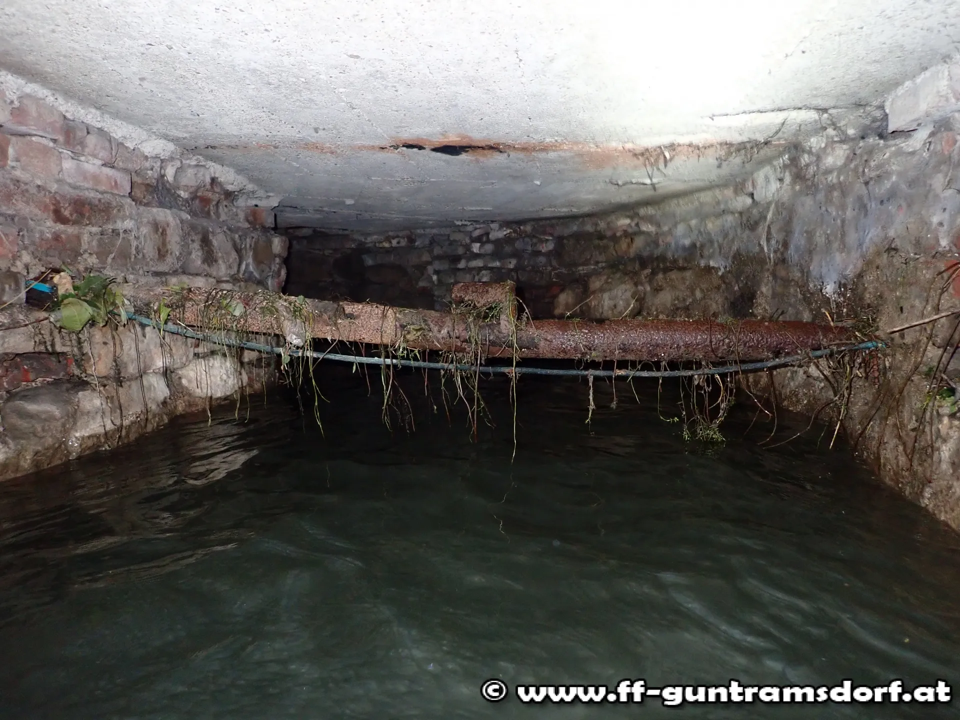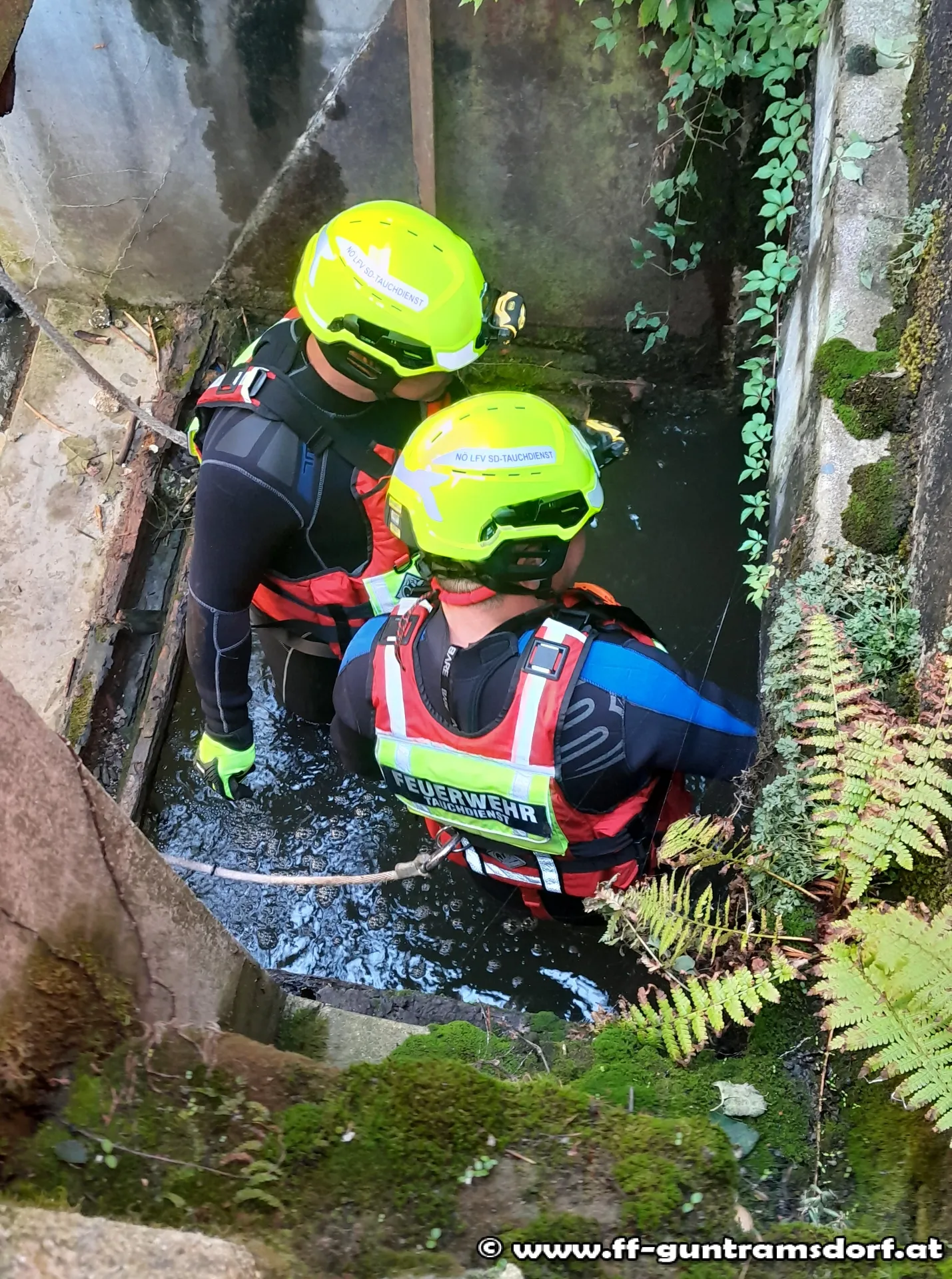 Wegen eines erhöhten Wasserstandes vor dem Einlauf des Mühlbaches unter den Gebäuden der Druckfabrik wurde eine „unterirdische“ Verklausung vermutet. Da mit Bürgermeister Robert Weber und Markus Schneider zwei Mitglieder des NÖ Feuerwehrtauchdienstes vor Ort zur Verfügung standen, wurde am offiziellen Dienstweg der Tauchdienst des NÖ Landesfeuerwehrverbandes angefordert und in Form der beiden Guntramsdorfer Feuerwehrkameraden eingesetzt.
