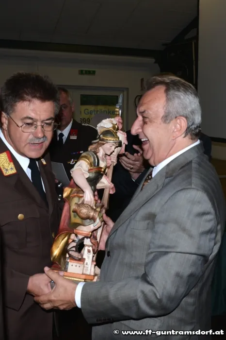 Bürgermeister a. D. Karl Sonnweber wurde zum Dank für die jahrelange, gute Zusammenarbeit mit der Feuerwehr Guntramsdorf ein großer heiliger Florian (geschnitzte Holzstatue) überreicht.