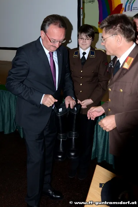 Bürgermeister Ing. Karl Schuster wurde für „seine Einsatzjacke“ ein Namenschild, eine Kappe und ein Paar Einsatzstiefel übergeben um im Katastrophenfall keine nassen Füße zu bekommen.