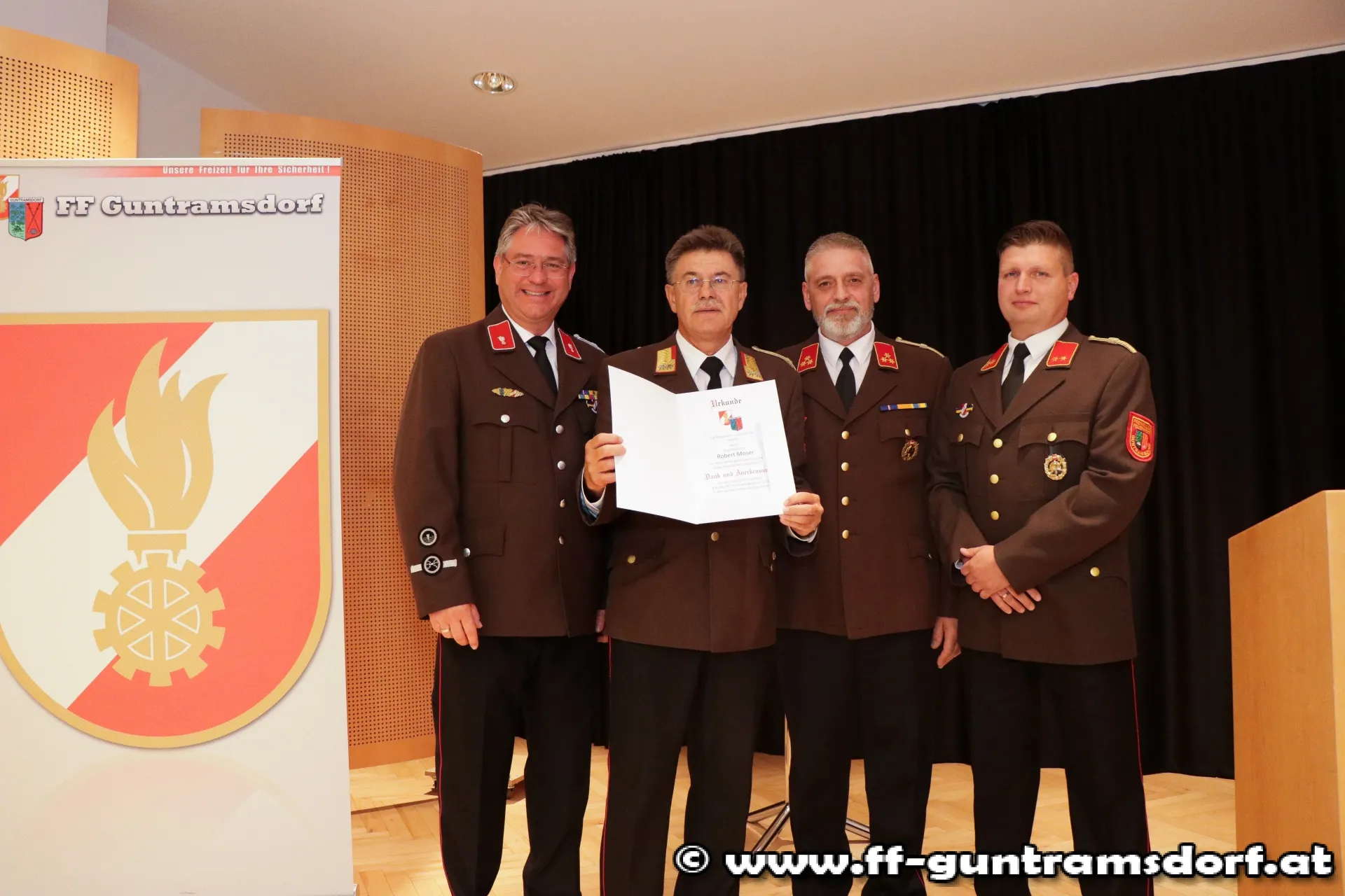 Nach der Angelobung bat Kommandant HBI Roman Janisch Ehrenbrandrat Robert Moser auf die Bühne. Aufgrund des NÖ Feuerwehrgesetzes wurde EBR Robert Moser mit der Vollendung seines 65. Lebensjahres feierlich in den wohlverdienten Reservestand überstellt.