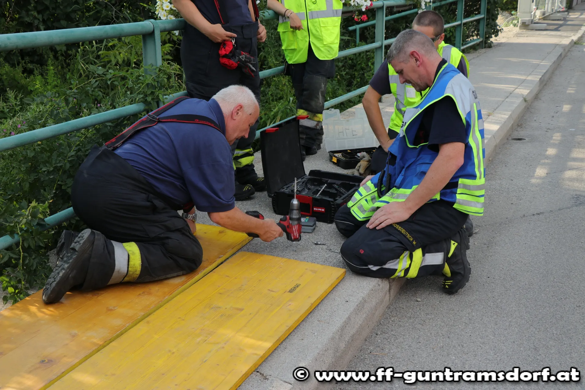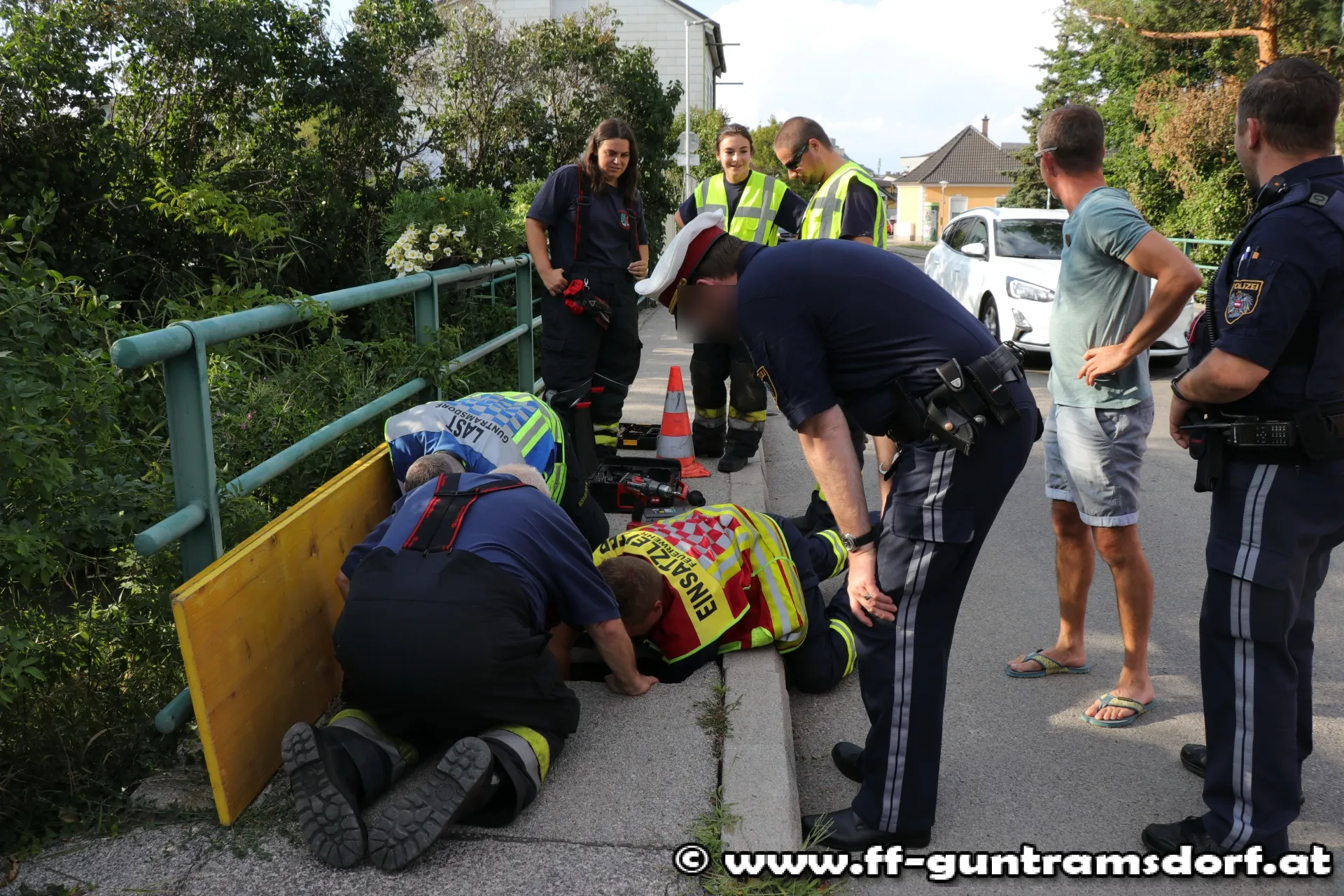 Aus bisher ungeklärter Ursache war auf der Brücke über den Krottenbach in der Möllersdorferstraße ein ca. 50 x 100 cm großes Stück des Gehsteiges eingebrochen. Für Fußgänger bestand dadurch akute Sturz- bzw. Verletzungsgefahr.