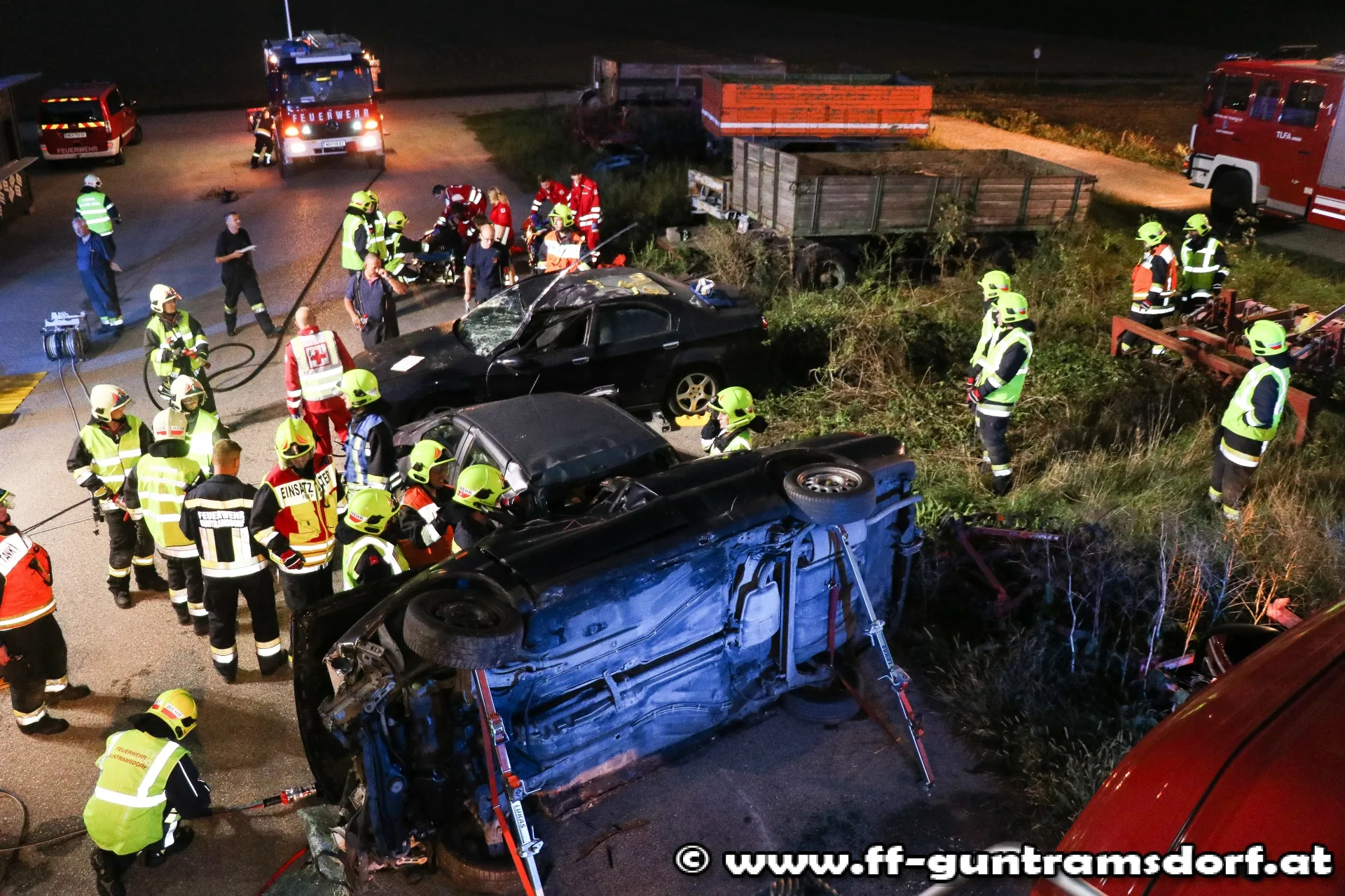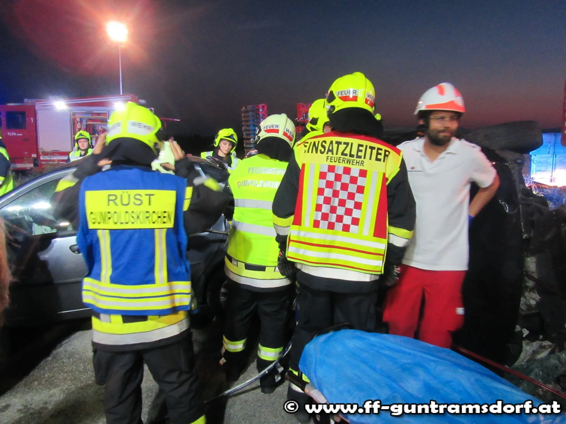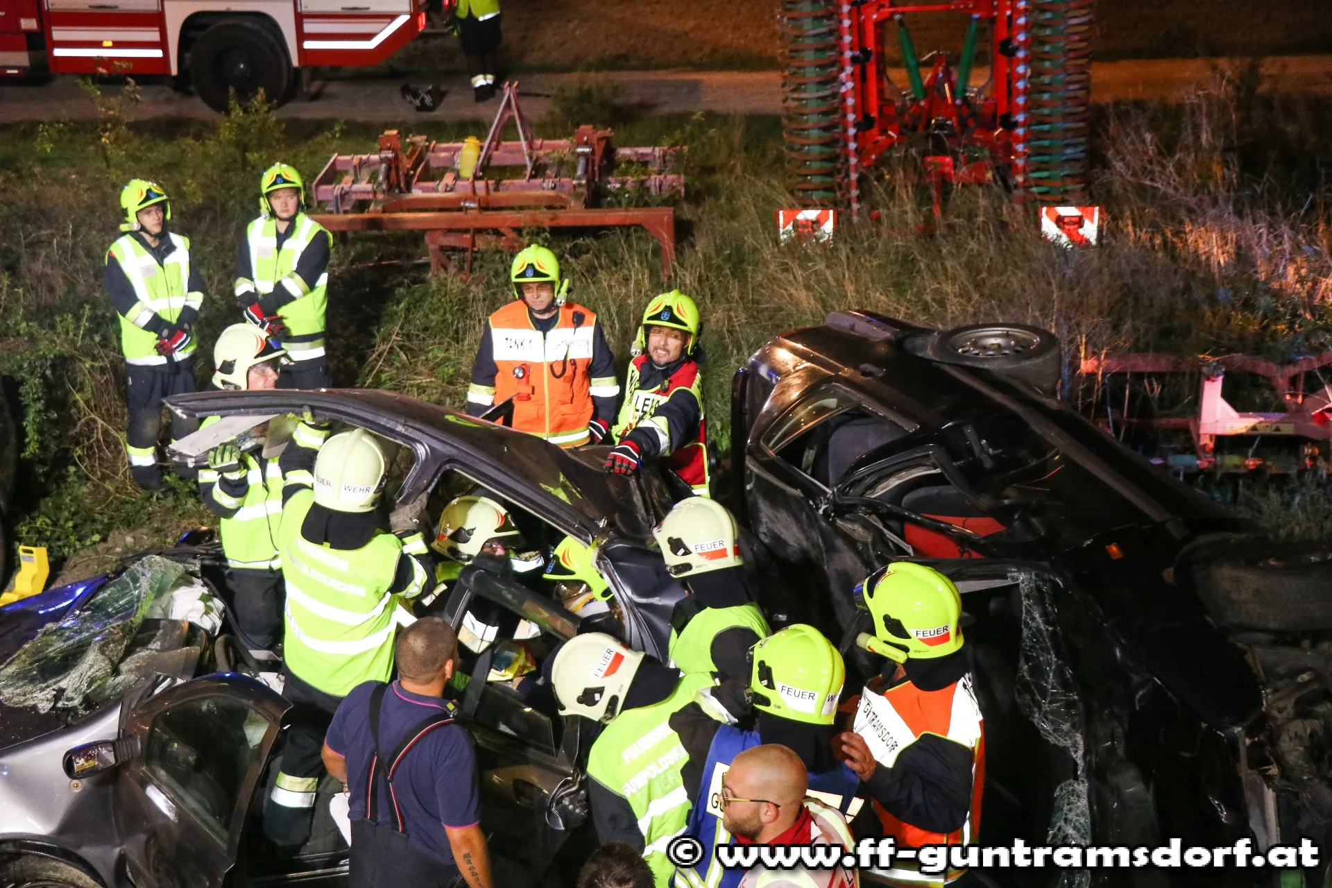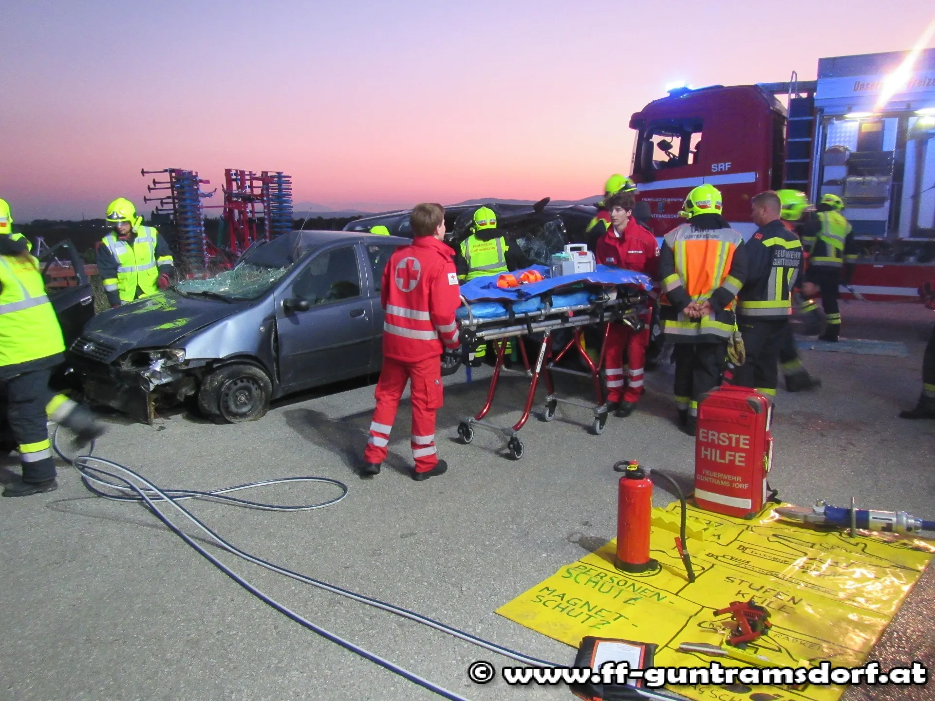 Da auch im „realen“ Einsatz ein solch großes Szenario alleine durch die Feuerwehr Guntramsdorf nur schwer zu bewältigen wäre, wurde die Feuerwehr Gumpoldskirchen mit einem Fahrzeug zur Übung eingeladen und eingesetzt.