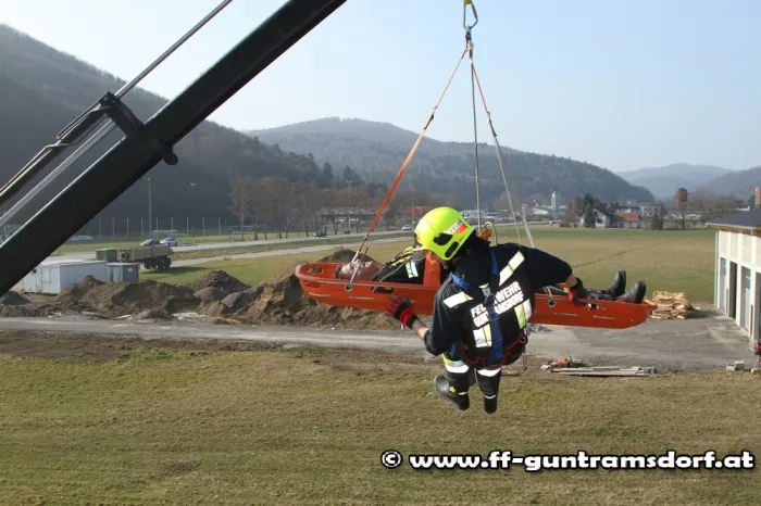 Weiters hatten wir Gelegenheit, unter fachmännischer Anleitung die Rettung eines Verletzten aus einem höher gelegenen Stock werk zu üben. Dazu wurde der Verletzte in eine Korbtrage gelegt und mit Hilfe des Krans unseres Schweren Rüstfahrzeuges durch ein Fenster sicher ins Freie gebracht.