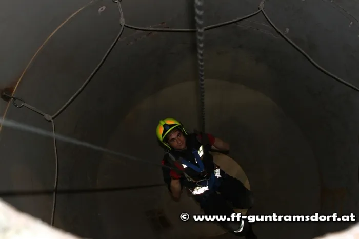 Ein anderes Übungsszenario war die Rettung aus einem Silo: Dazu wurde das sog. Rollgliss, ein ausgeklügeltes Flaschenzugsystem, angewendet, mit dem mit moderatem Kraftaufwand eine Person nach oben gezogen werden kann.