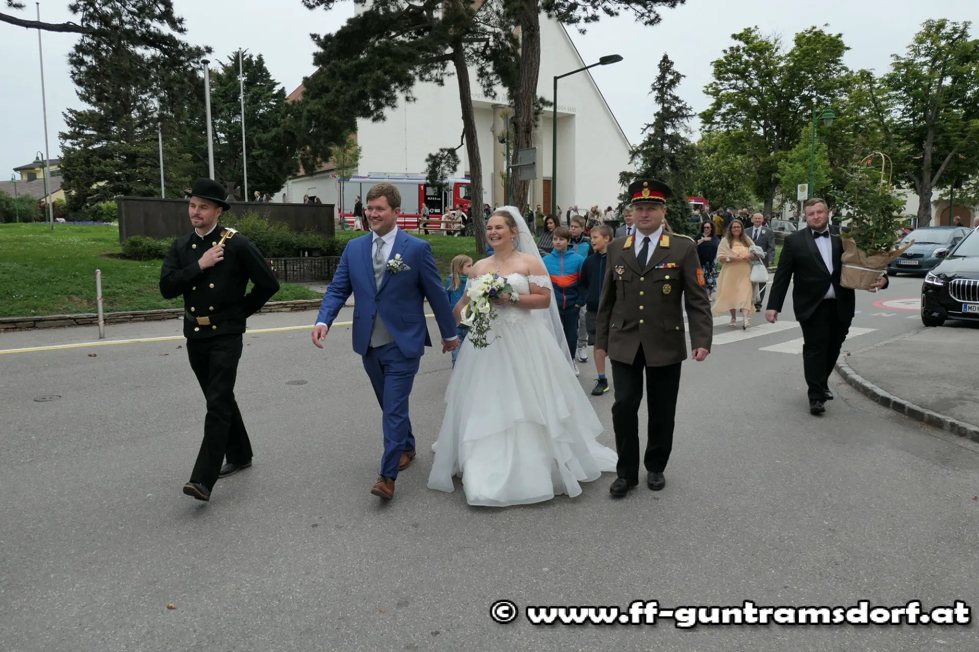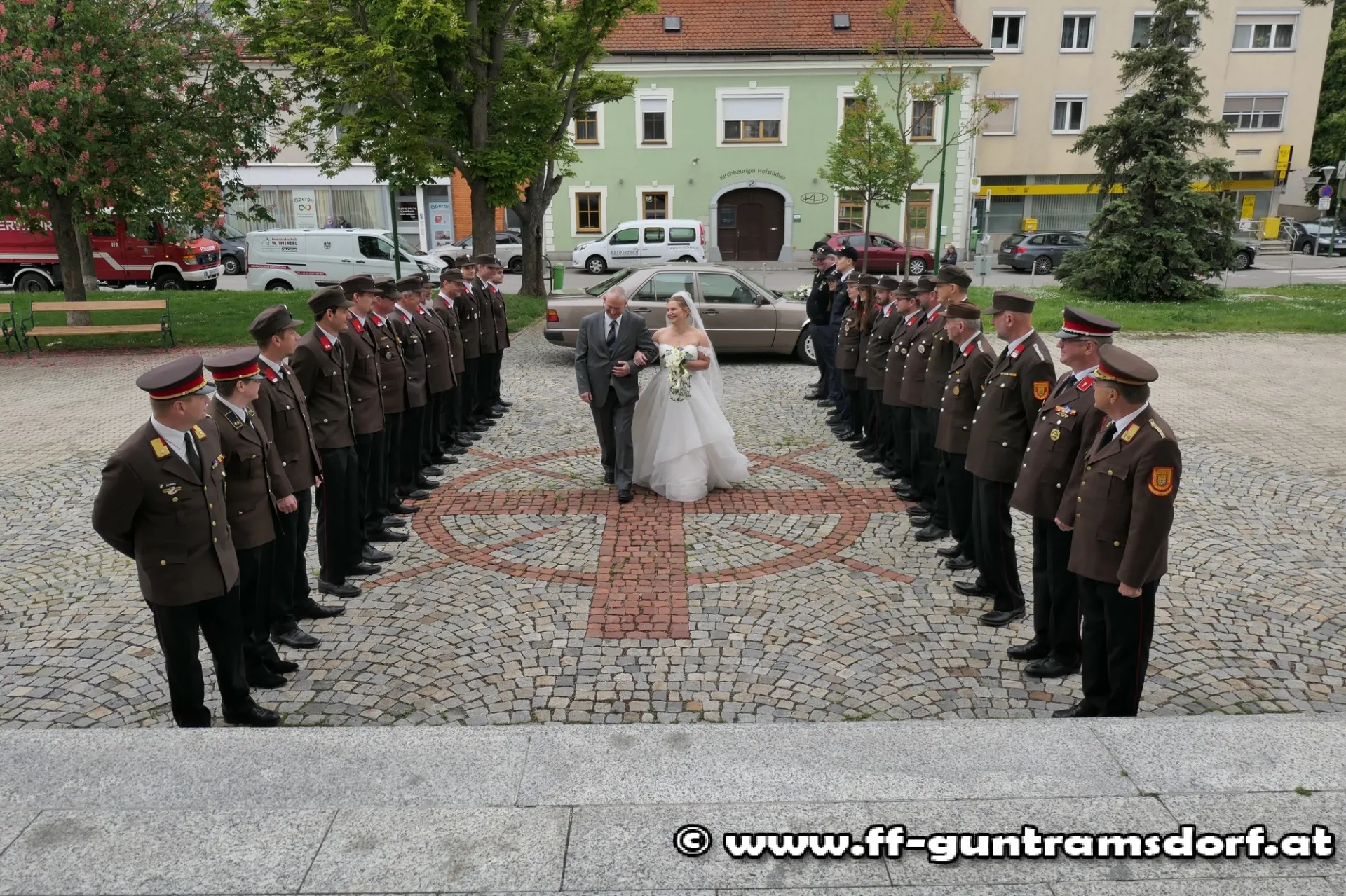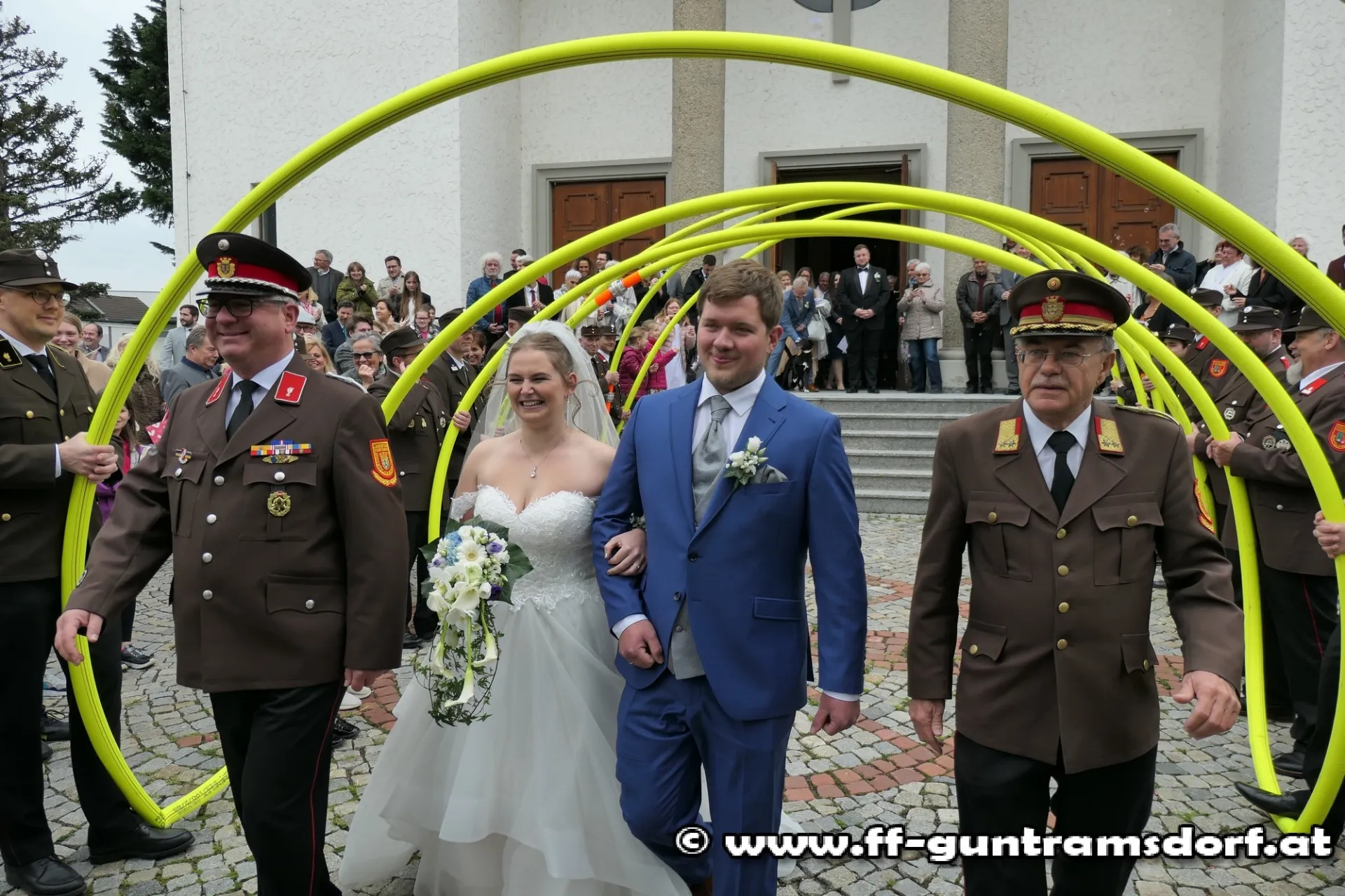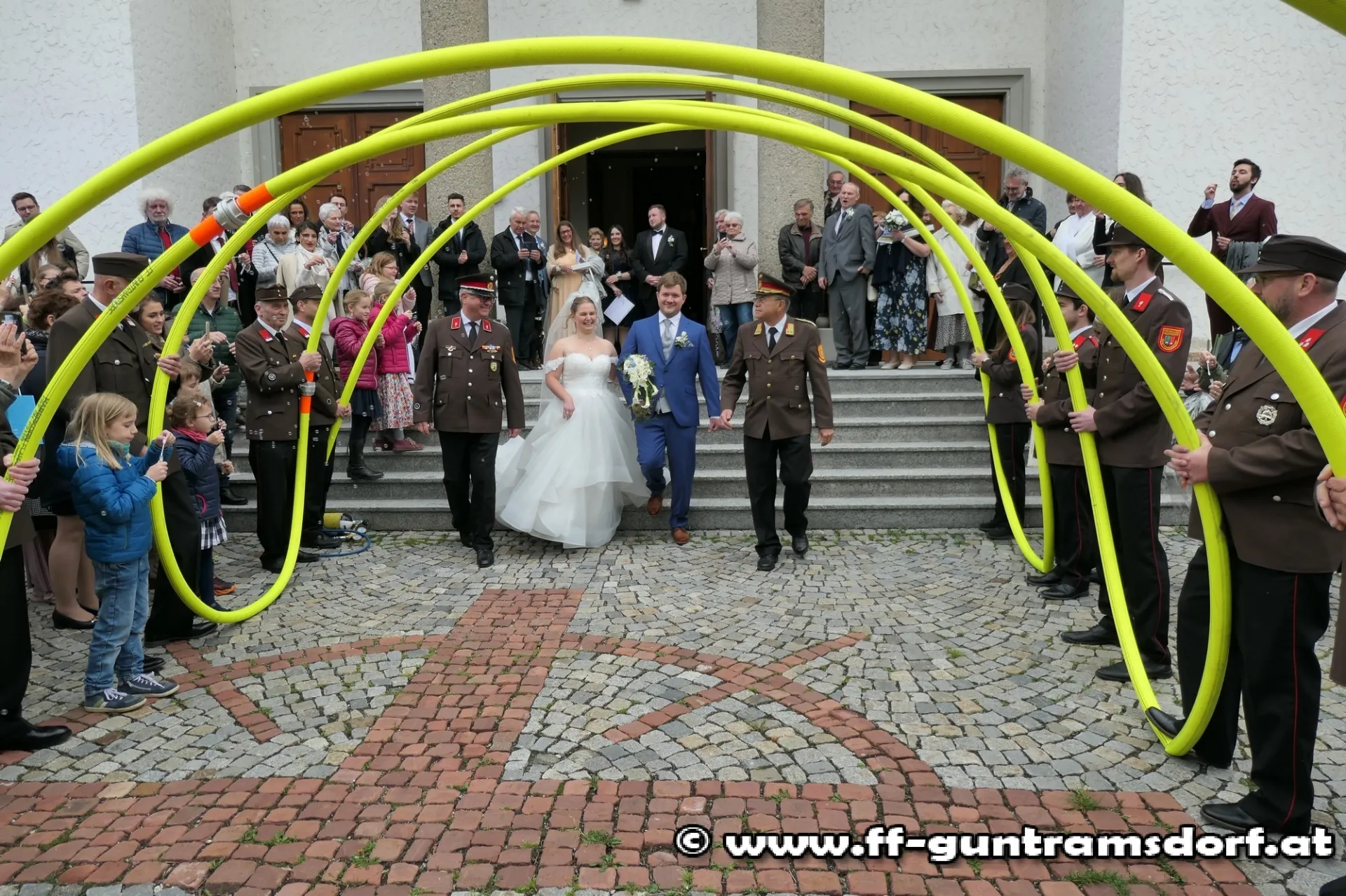 Während des Schlussliedes verließen die Gäste (planmäßig) die Kirche, um das frisch vermählte Paar auf dem Kirchenplatz mit Seifenblasen zu empfangen. Unter großem Jubel schritten die beiden Eheleute gemeinsam mit Bürgermeister Robert Weber und Altkommandant Robert Moser durch den Schlauchbogen, an dessen Ende sie von Kommandantstellvertreter Michael Schinko erwartet wurden. Dieser überreichte als kleines Präsent ein Bild des Heiligen Florian (Mosaik im Eingangsbereich des Feuerwehrhauses) und gratulierte im Namen der gesamten Mannschaft.