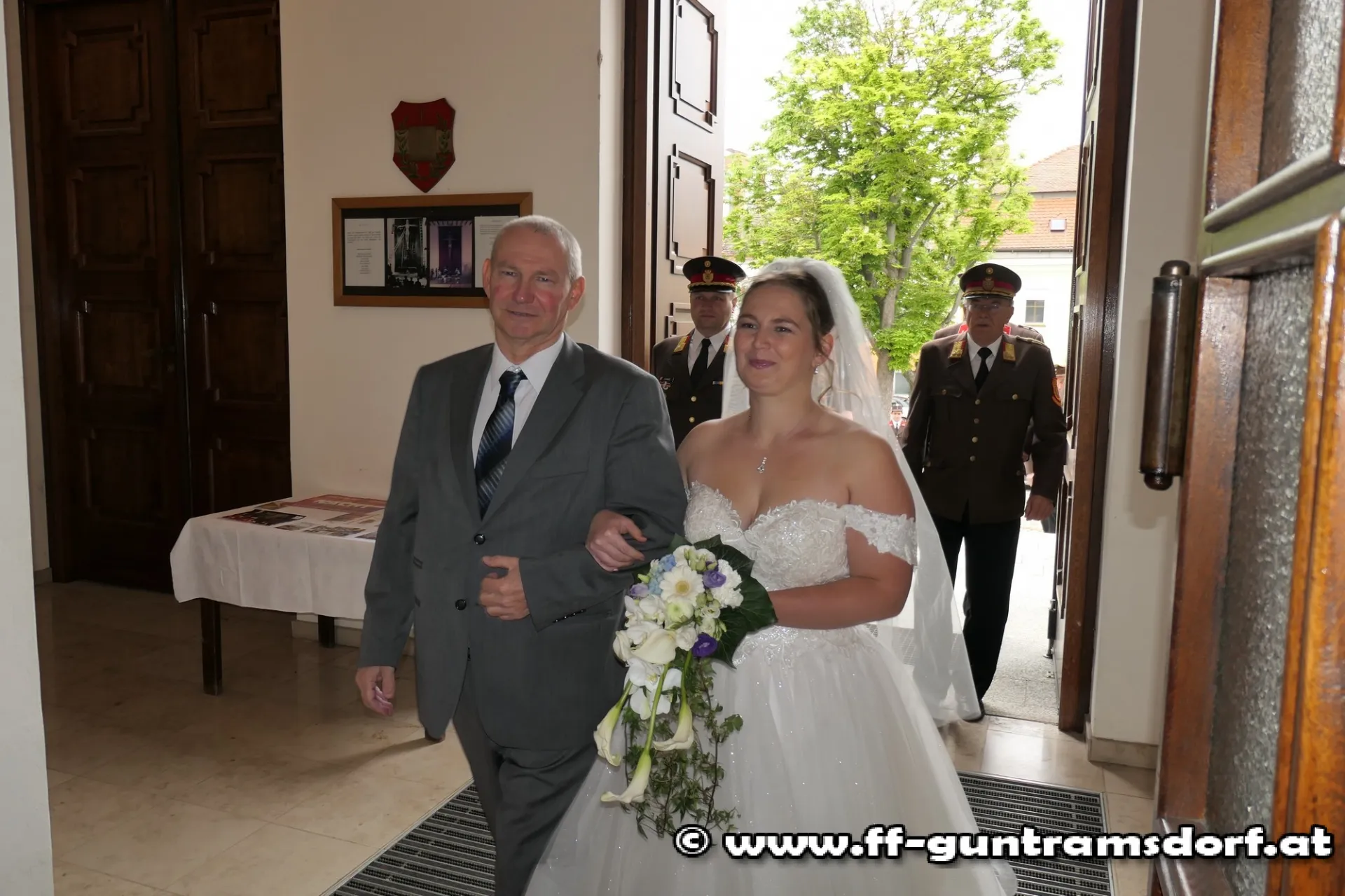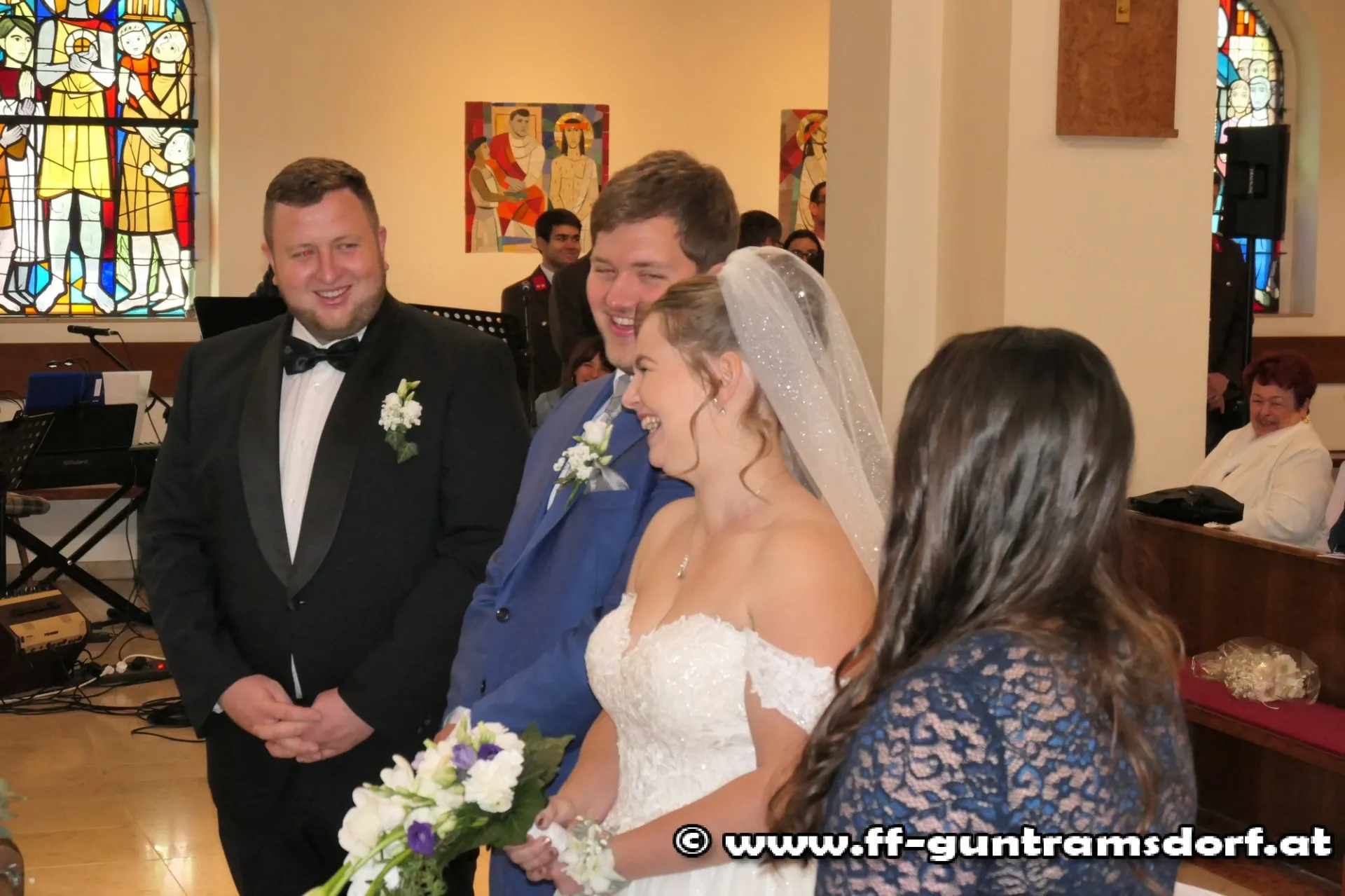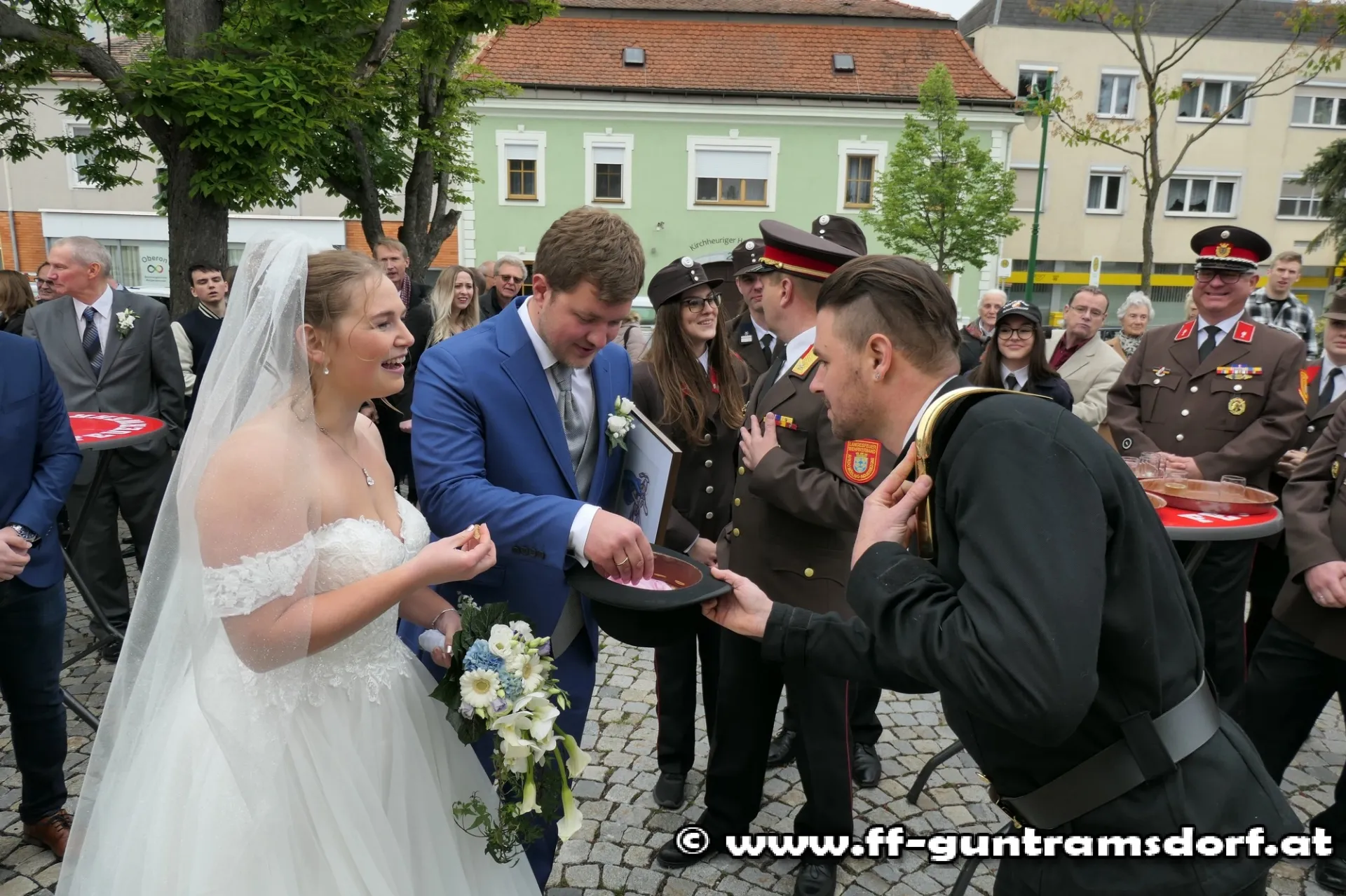 Während des Schlussliedes verließen die Gäste (planmäßig) die Kirche, um das frisch vermählte Paar auf dem Kirchenplatz mit Seifenblasen zu empfangen. Unter großem Jubel schritten die beiden Eheleute gemeinsam mit Bürgermeister Robert Weber und Altkommandant Robert Moser durch den Schlauchbogen, an dessen Ende sie von Kommandantstellvertreter Michael Schinko erwartet wurden. Dieser überreichte als kleines Präsent ein Bild des Heiligen Florian (Mosaik im Eingangsbereich des Feuerwehrhauses) und gratulierte im Namen der gesamten Mannschaft.