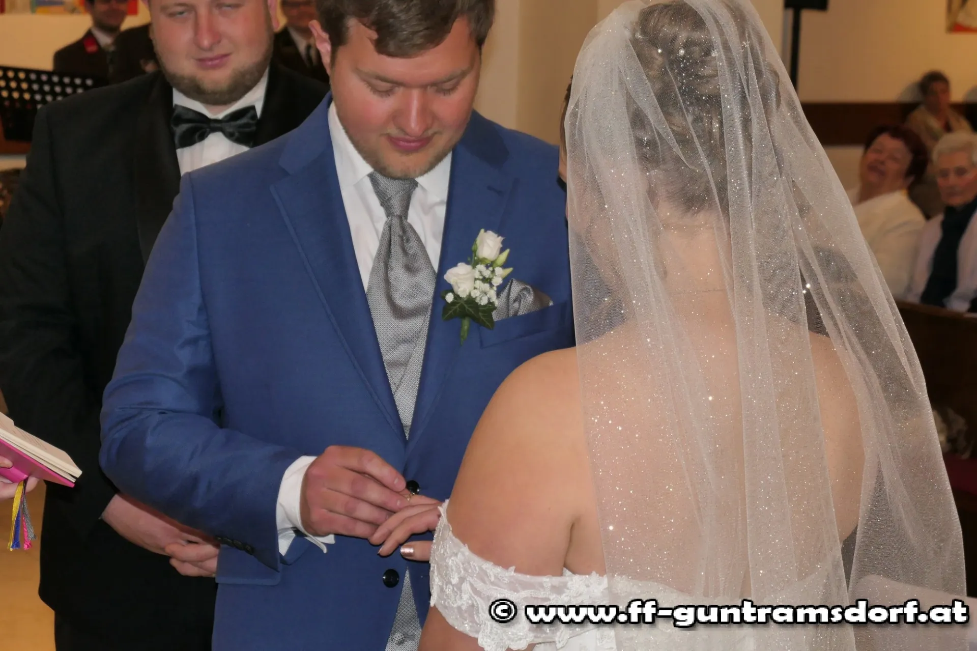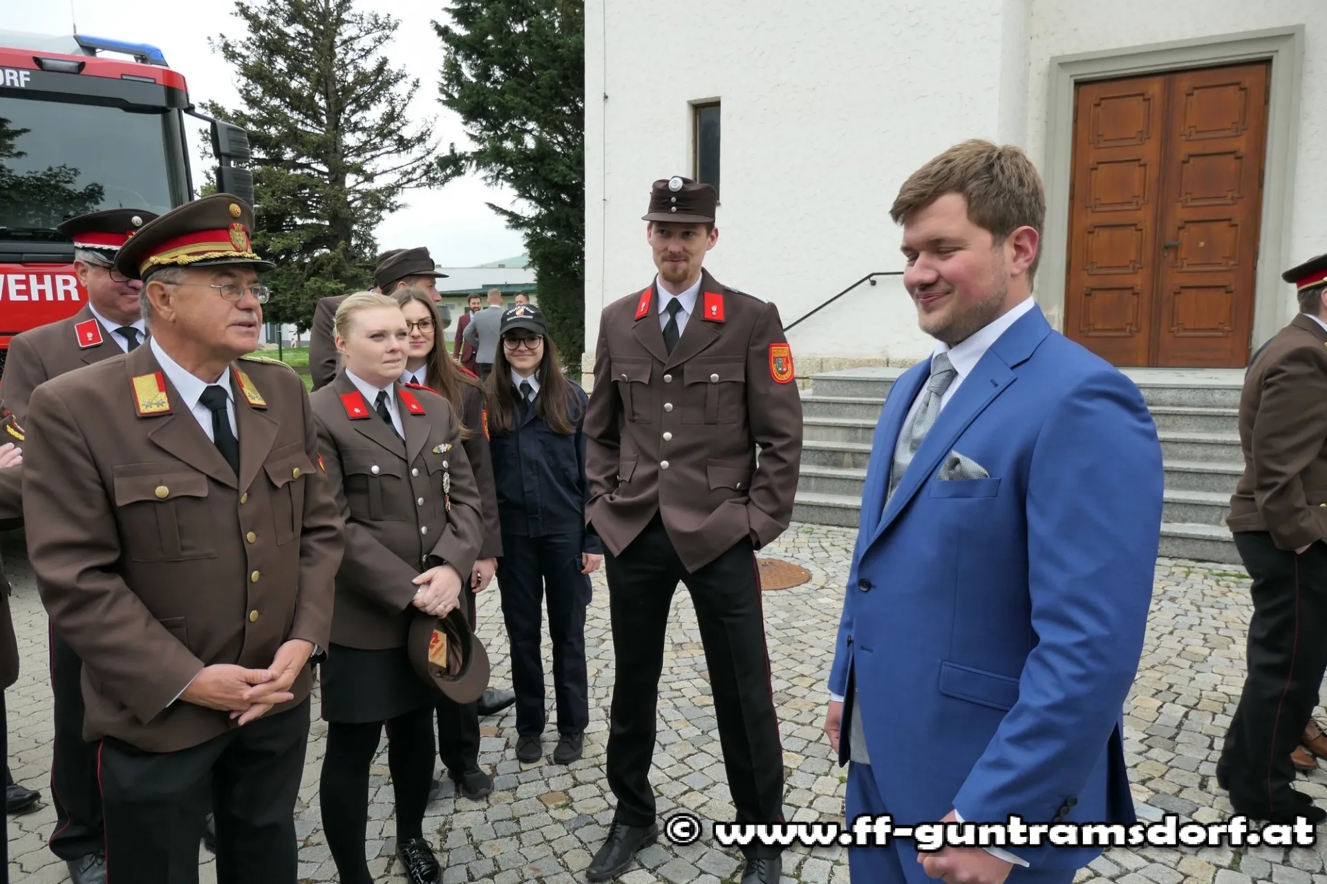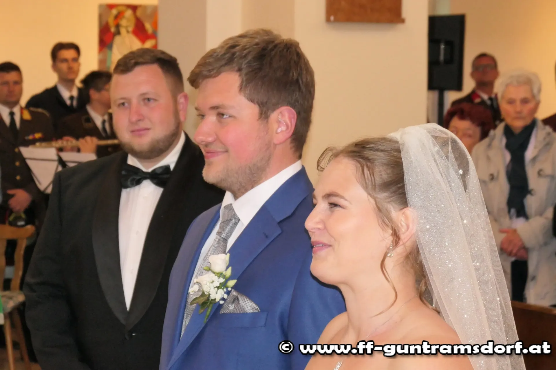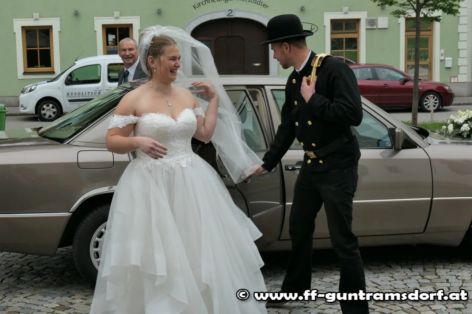 Während des Schlussliedes verließen die Gäste (planmäßig) die Kirche, um das frisch vermählte Paar auf dem Kirchenplatz mit Seifenblasen zu empfangen. Unter großem Jubel schritten die beiden Eheleute gemeinsam mit Bürgermeister Robert Weber und Altkommandant Robert Moser durch den Schlauchbogen, an dessen Ende sie von Kommandantstellvertreter Michael Schinko erwartet wurden. Dieser überreichte als kleines Präsent ein Bild des Heiligen Florian (Mosaik im Eingangsbereich des Feuerwehrhauses) und gratulierte im Namen der gesamten Mannschaft.