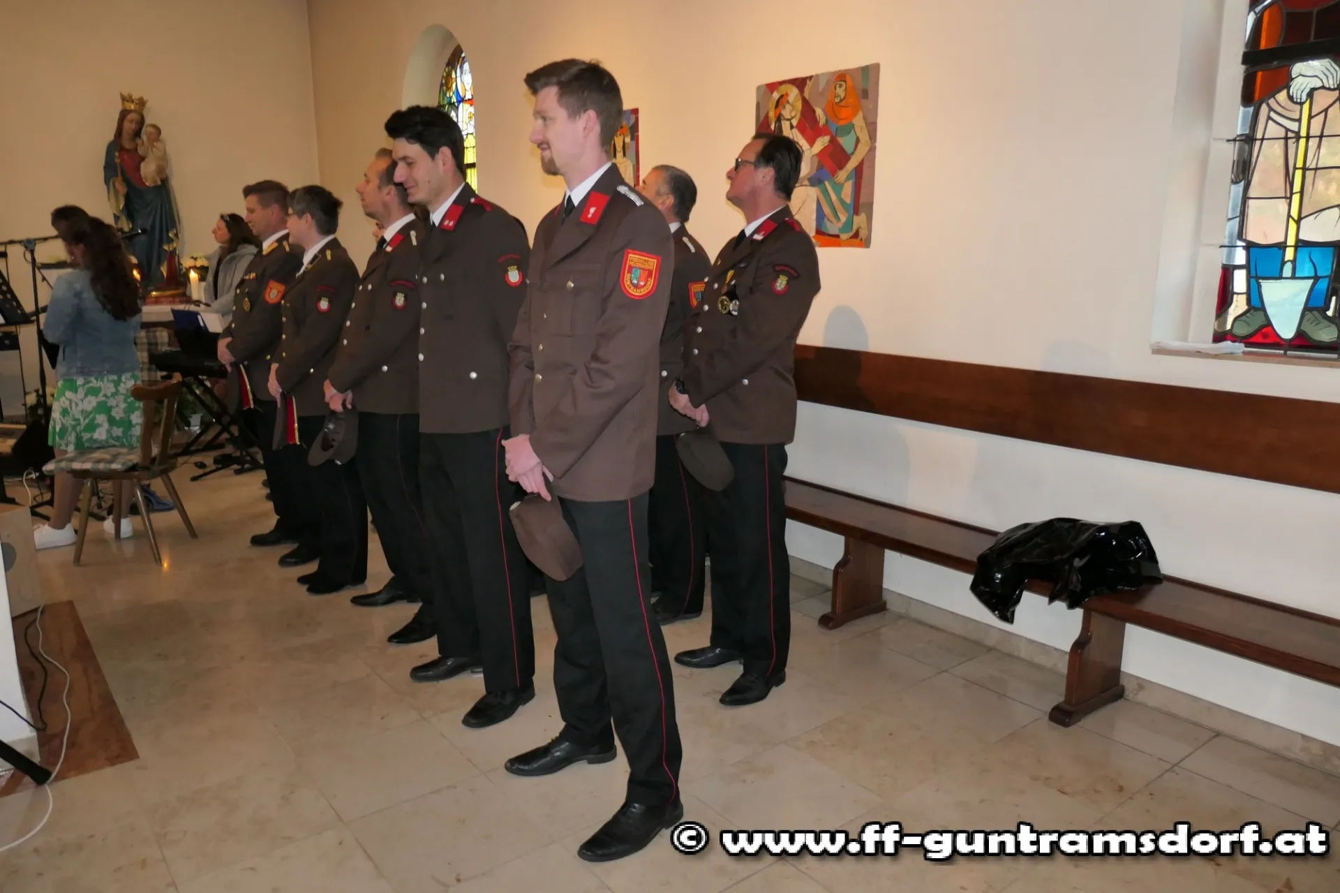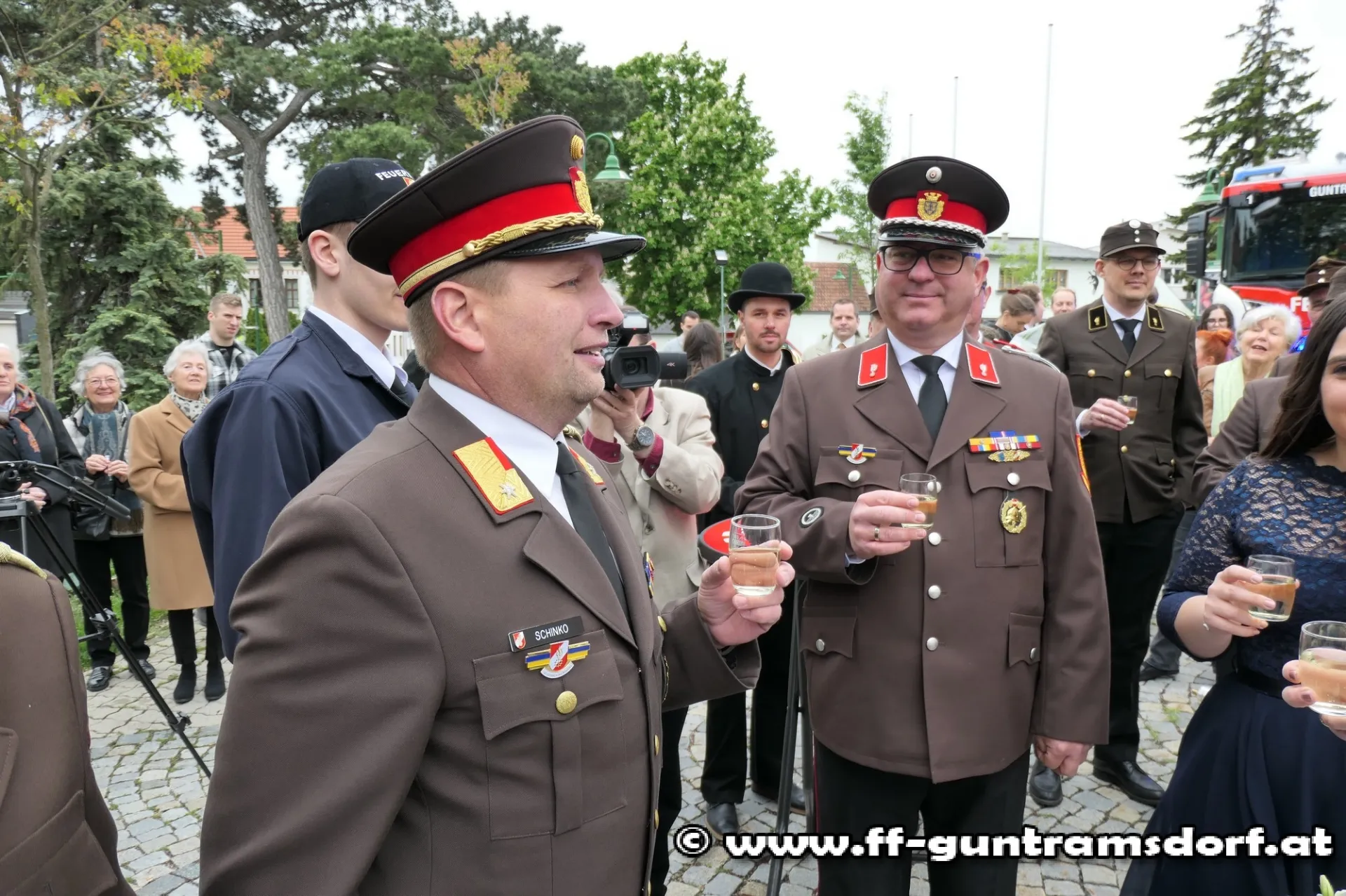 Die gute Stimmung konnte die kühle Witterung (nur +11°) nicht ganz wettmachen, weshalb die Agape in den Pfarrsaal verlegt wurde. Dort versorgte die FF Guntramsdorf die Hochzeitsgäste mit Getränken und köstlichem Brot, während die Schlange der GratulantInnen nicht kürzer werden wollte…