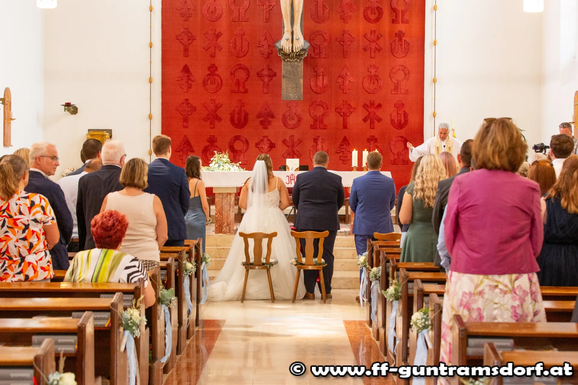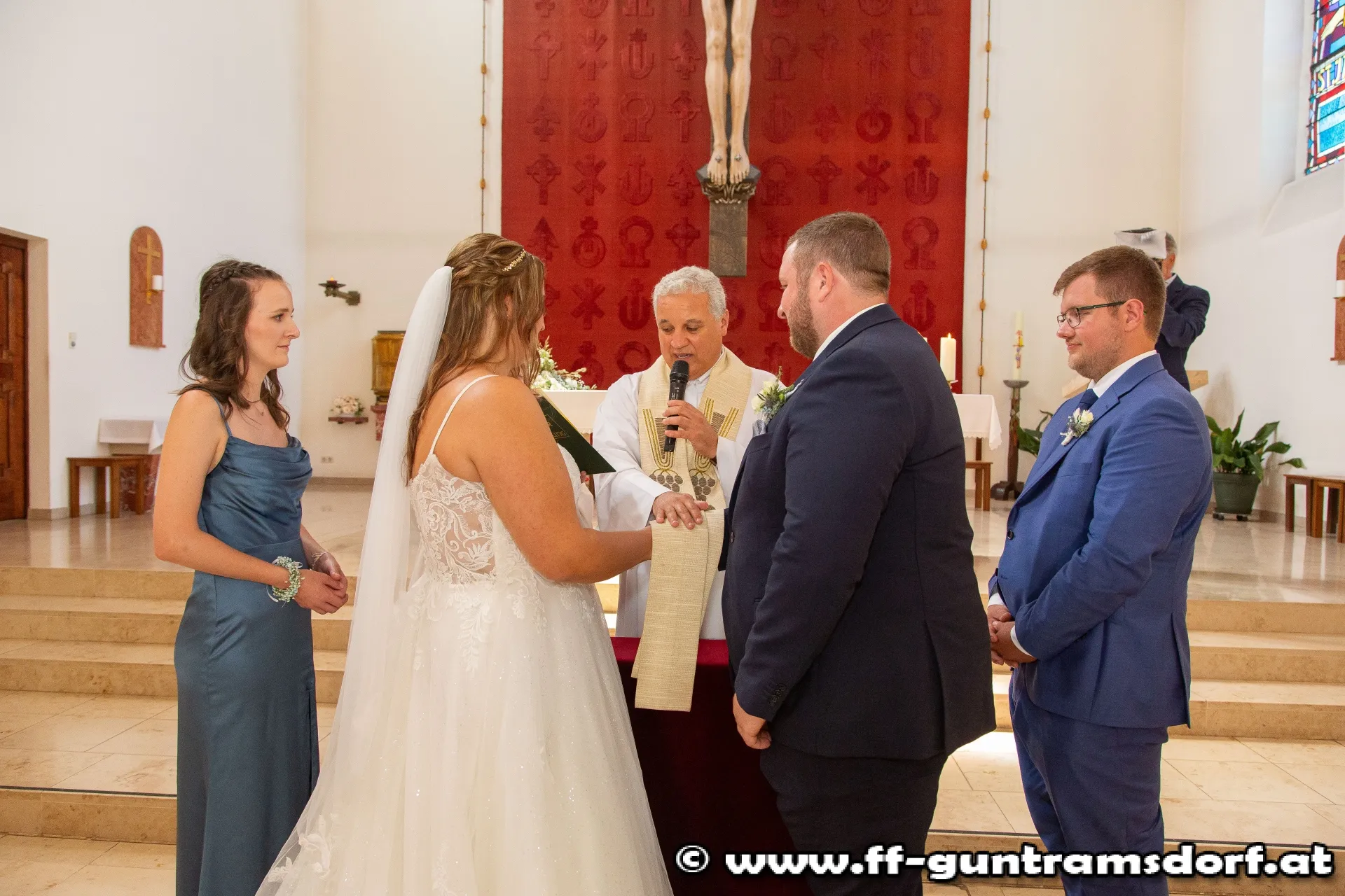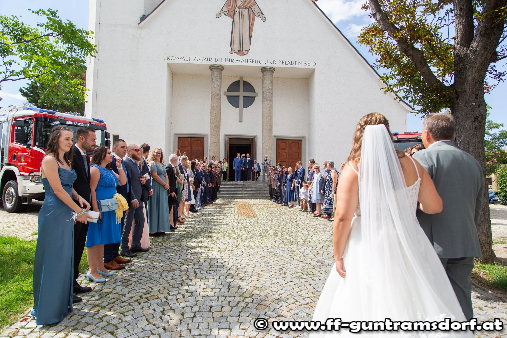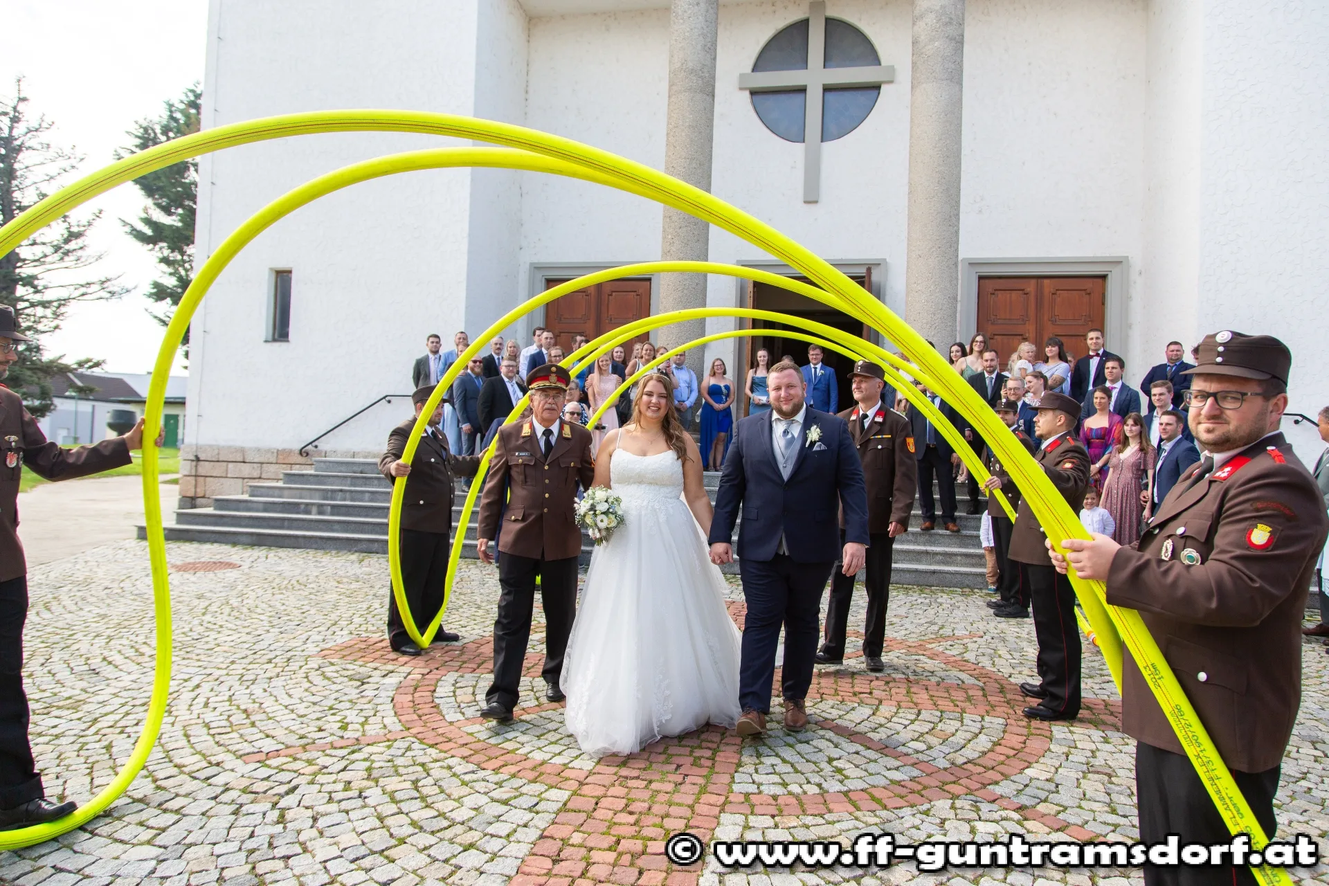 Das Brautpaar, sämtliche Hochzeitsgäste und selbstverständlich auch die Feuerwehrkameraden fanden sich knapp eine Stunde vor Beginn der Trauungszeremonie im Feuerwehrhaus Guntramsdorf ein, wo sie mit einem von der Feuerwehr vorbereiteten Aperitif empfangen wurden. Pünktlich um 14:45 Uhr marschierte dann die ganze Hochzeitsgesellschaft unter der musikalischen Begleitung der Feuerwehrkapelle Hornstein – die Braut stammt aus Hornstein – durch die Wassergasse zur Kirche. Nach einem kurzen Platzkonzert vor der Kirche wurde die Braut durch das Spalier der Feuerwehrkameraden in die Kirche geführt, wo Pfarrer Hudson Lima Duarte die stimmungsvolle Trauung vornahm.