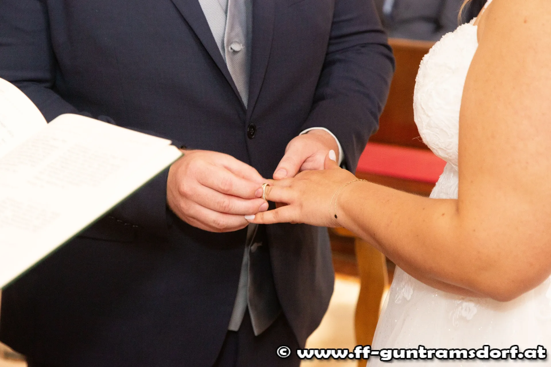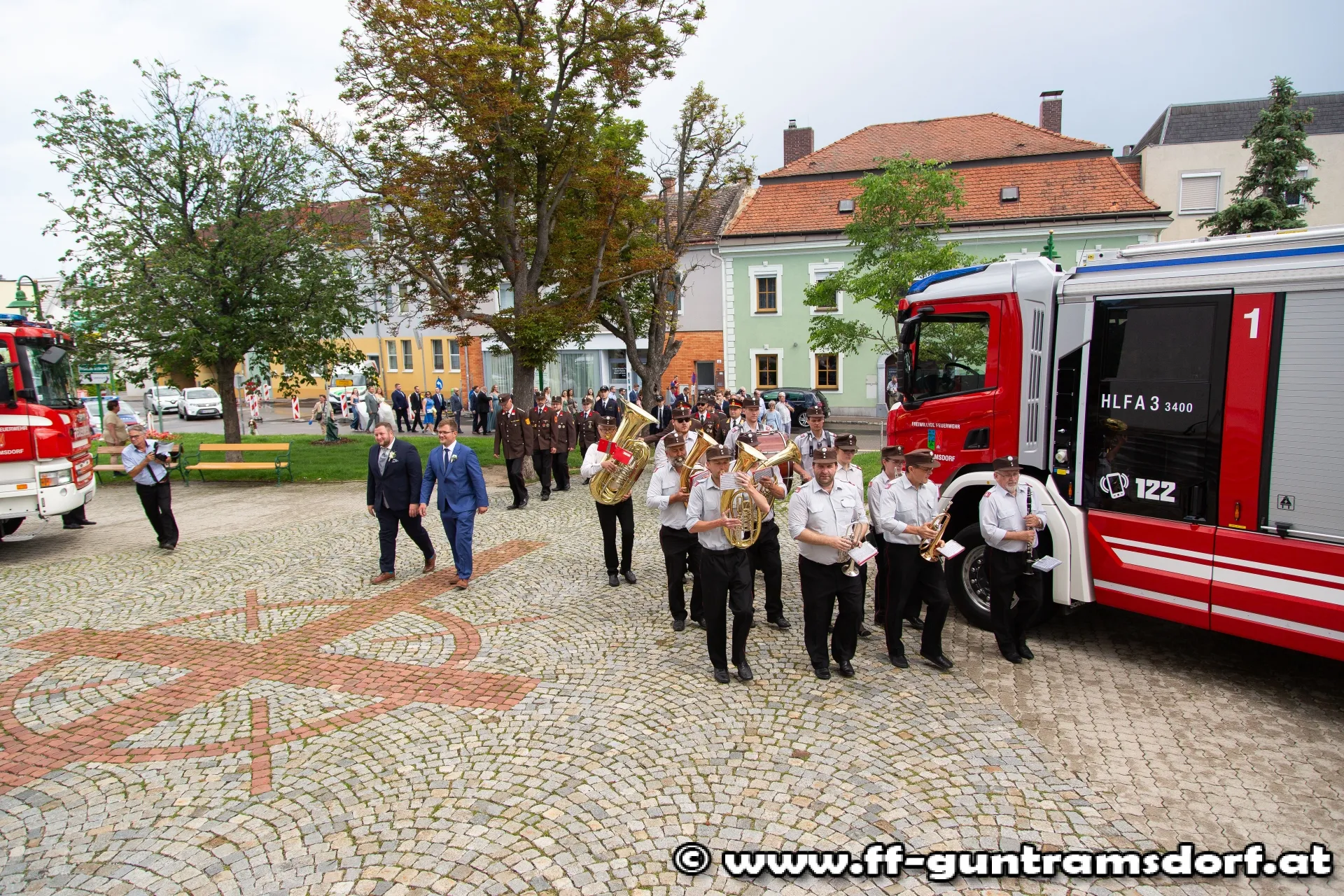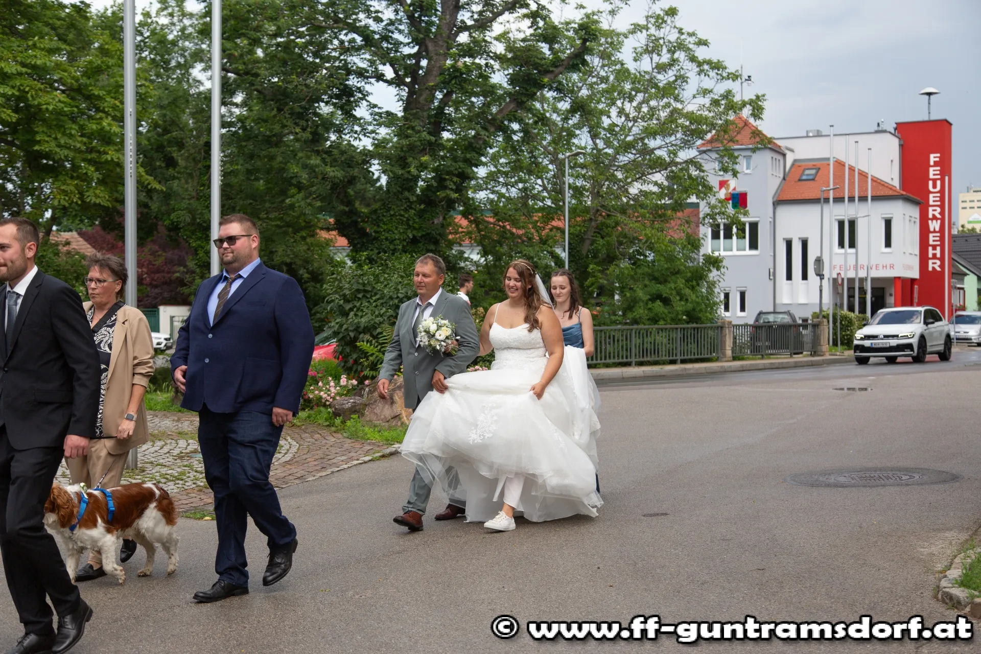 Das Brautpaar, sämtliche Hochzeitsgäste und selbstverständlich auch die Feuerwehrkameraden fanden sich knapp eine Stunde vor Beginn der Trauungszeremonie im Feuerwehrhaus Guntramsdorf ein, wo sie mit einem von der Feuerwehr vorbereiteten Aperitif empfangen wurden. Pünktlich um 14:45 Uhr marschierte dann die ganze Hochzeitsgesellschaft unter der musikalischen Begleitung der Feuerwehrkapelle Hornstein – die Braut stammt aus Hornstein – durch die Wassergasse zur Kirche. Nach einem kurzen Platzkonzert vor der Kirche wurde die Braut durch das Spalier der Feuerwehrkameraden in die Kirche geführt, wo Pfarrer Hudson Lima Duarte die stimmungsvolle Trauung vornahm.