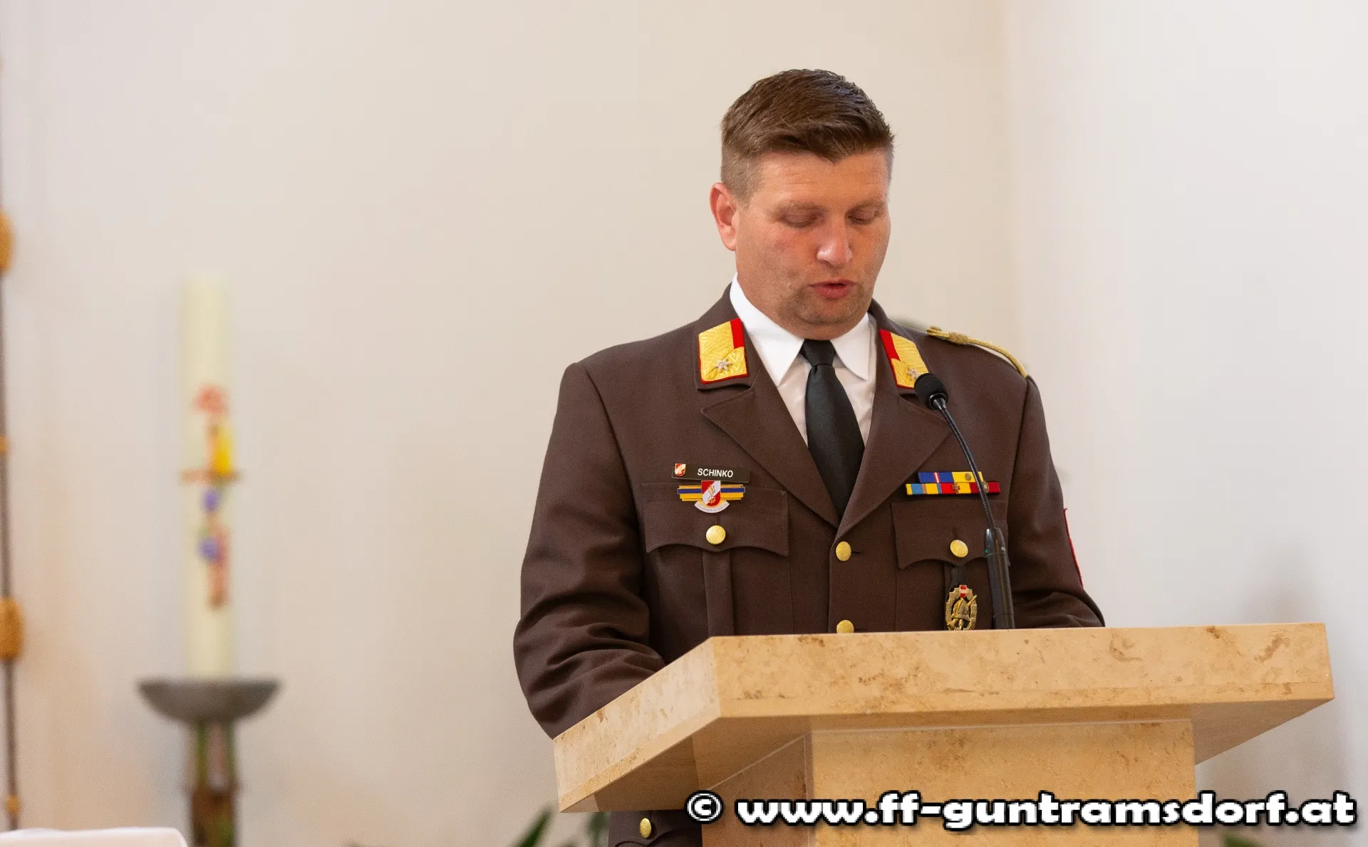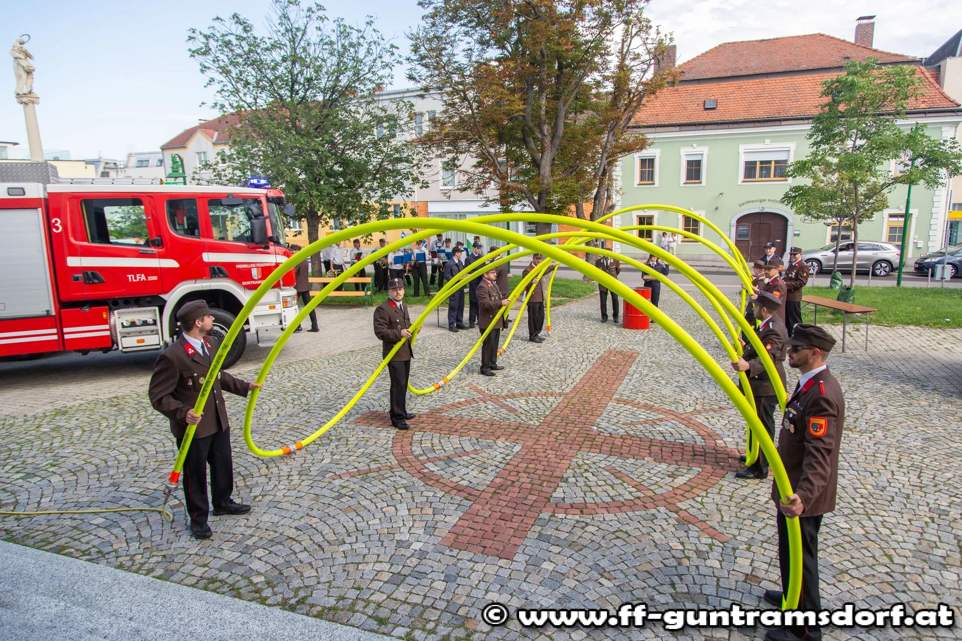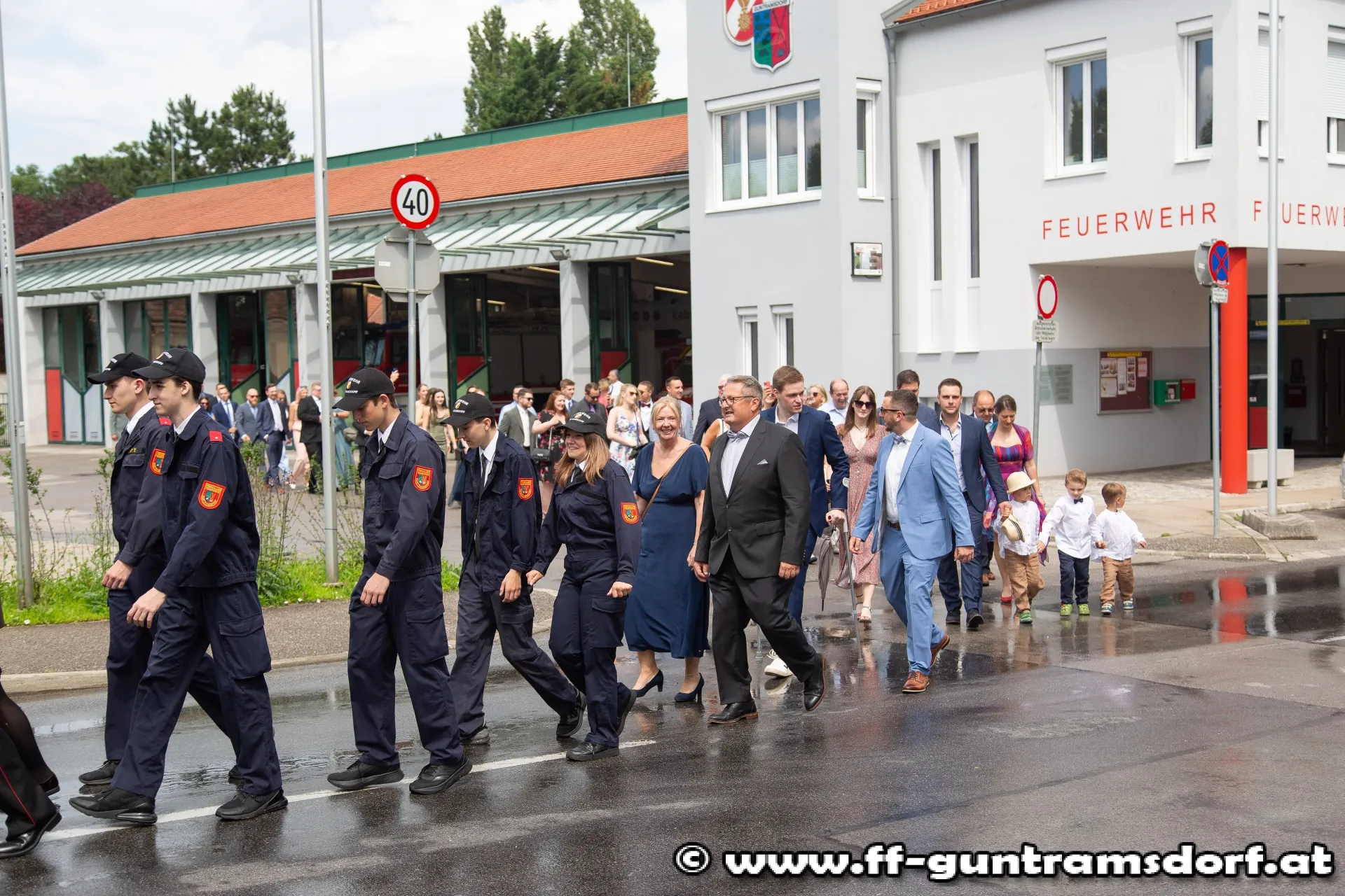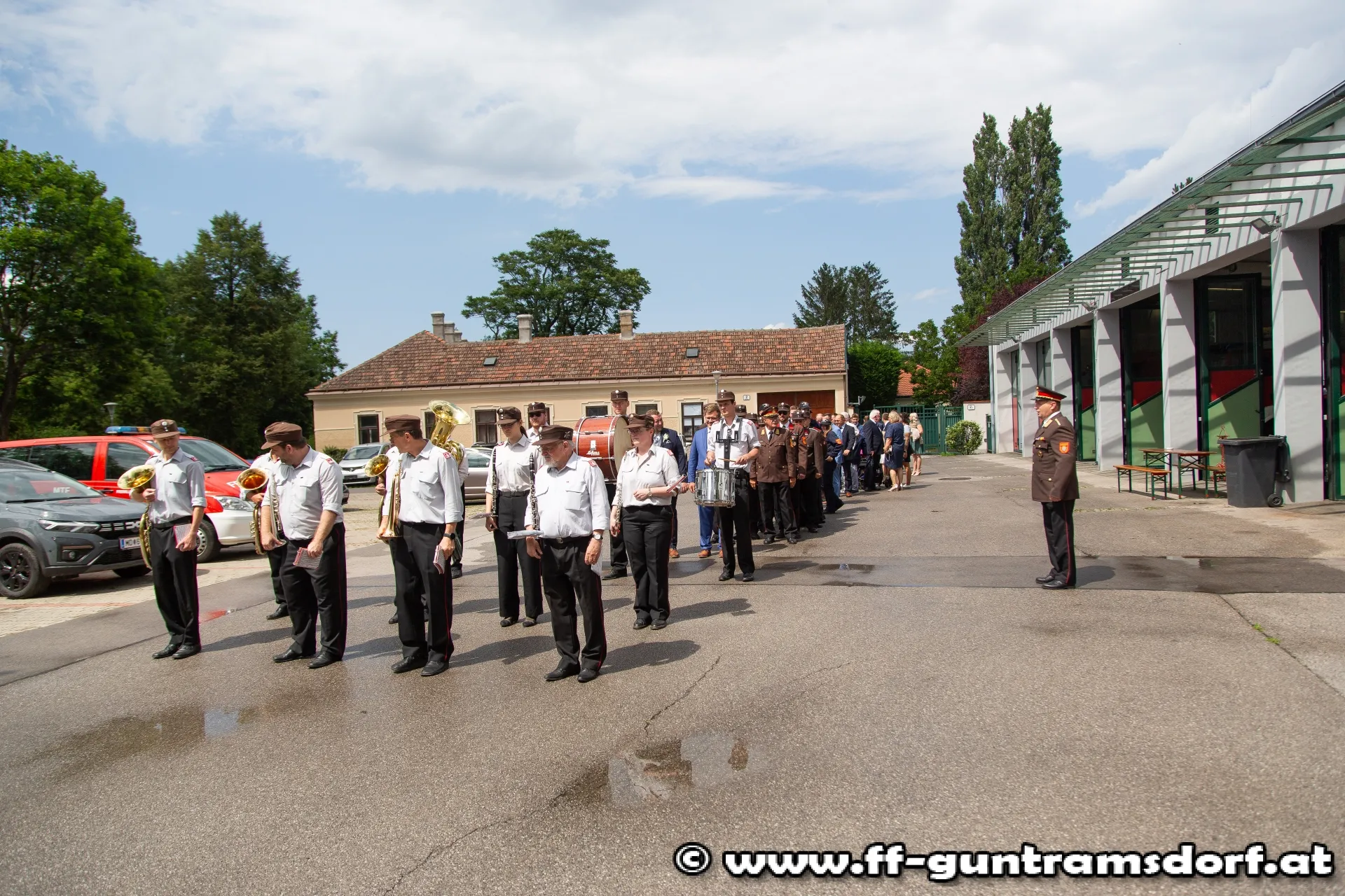 Das Brautpaar, sämtliche Hochzeitsgäste und selbstverständlich auch die Feuerwehrkameraden fanden sich knapp eine Stunde vor Beginn der Trauungszeremonie im Feuerwehrhaus Guntramsdorf ein, wo sie mit einem von der Feuerwehr vorbereiteten Aperitif empfangen wurden. Pünktlich um 14:45 Uhr marschierte dann die ganze Hochzeitsgesellschaft unter der musikalischen Begleitung der Feuerwehrkapelle Hornstein – die Braut stammt aus Hornstein – durch die Wassergasse zur Kirche. Nach einem kurzen Platzkonzert vor der Kirche wurde die Braut durch das Spalier der Feuerwehrkameraden in die Kirche geführt, wo Pfarrer Hudson Lima Duarte die stimmungsvolle Trauung vornahm.