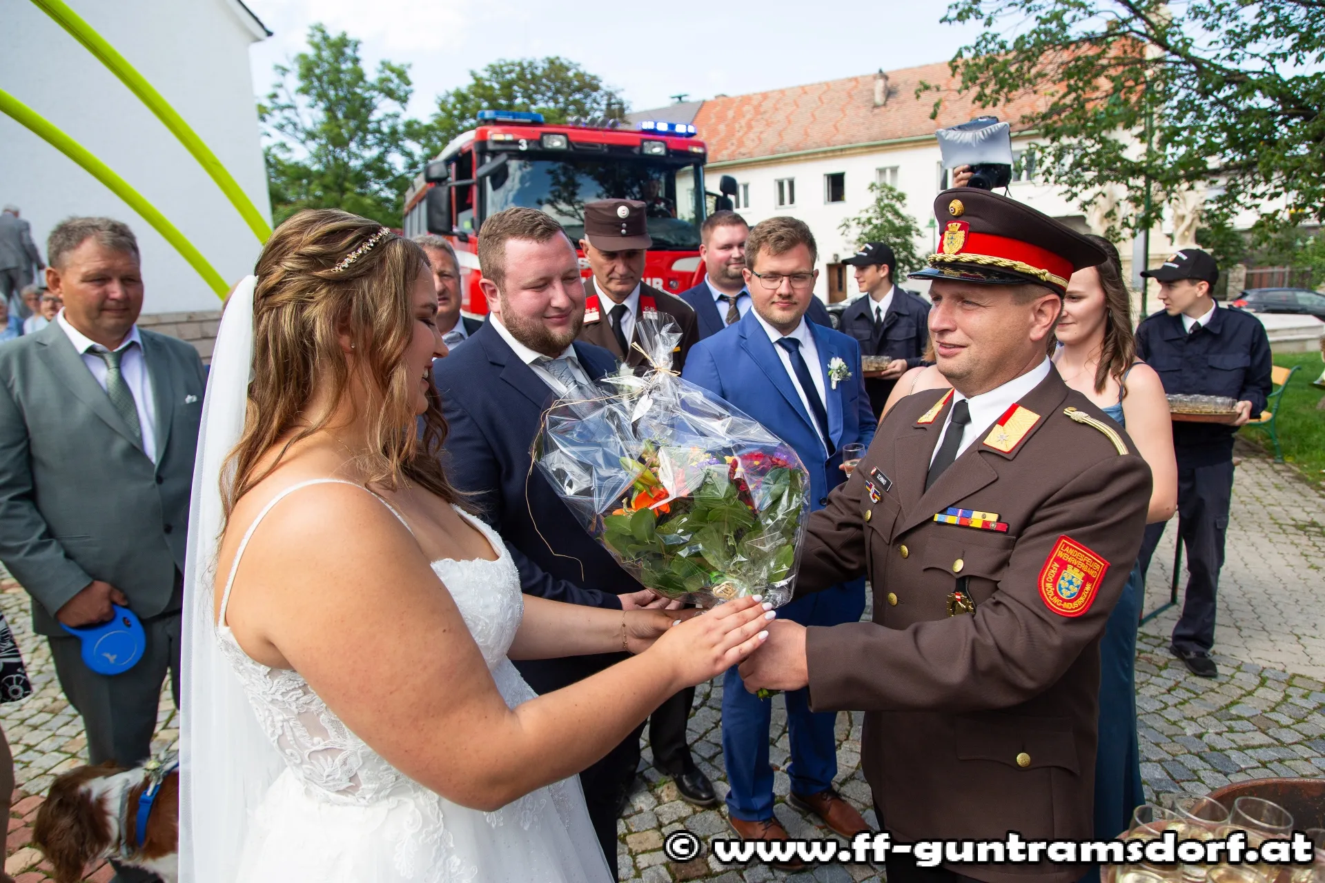 Wie bei Feuerwehrhochzeiten üblich, errichtete die Feuerwehr vor der Kirche einen „Schlauchbogen“ durch den das frischvermählte Paar beim Verlassen der Kirche begleitet wurde. An dessen Ende überbrachte Kommandantstellvertreter Michael Schinko die Glückwünsche der Feuerwehr und überreichte ein kleines Erinnerungsgeschenk.