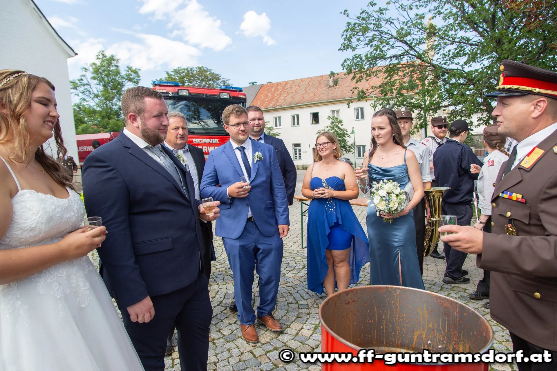 Da Mathias als Gehilfe des Fahrmeisters einen besonderen Bezug zu den Einsatzfahrzeugen hat, wurde das Brautpaar schließlich nicht mit einer Kutsche o. ä. sondern mit einem Feuerwehrfahrzeug (Tank 1) der FF Guntramsdorf zur Hochzeitstafel gebracht.