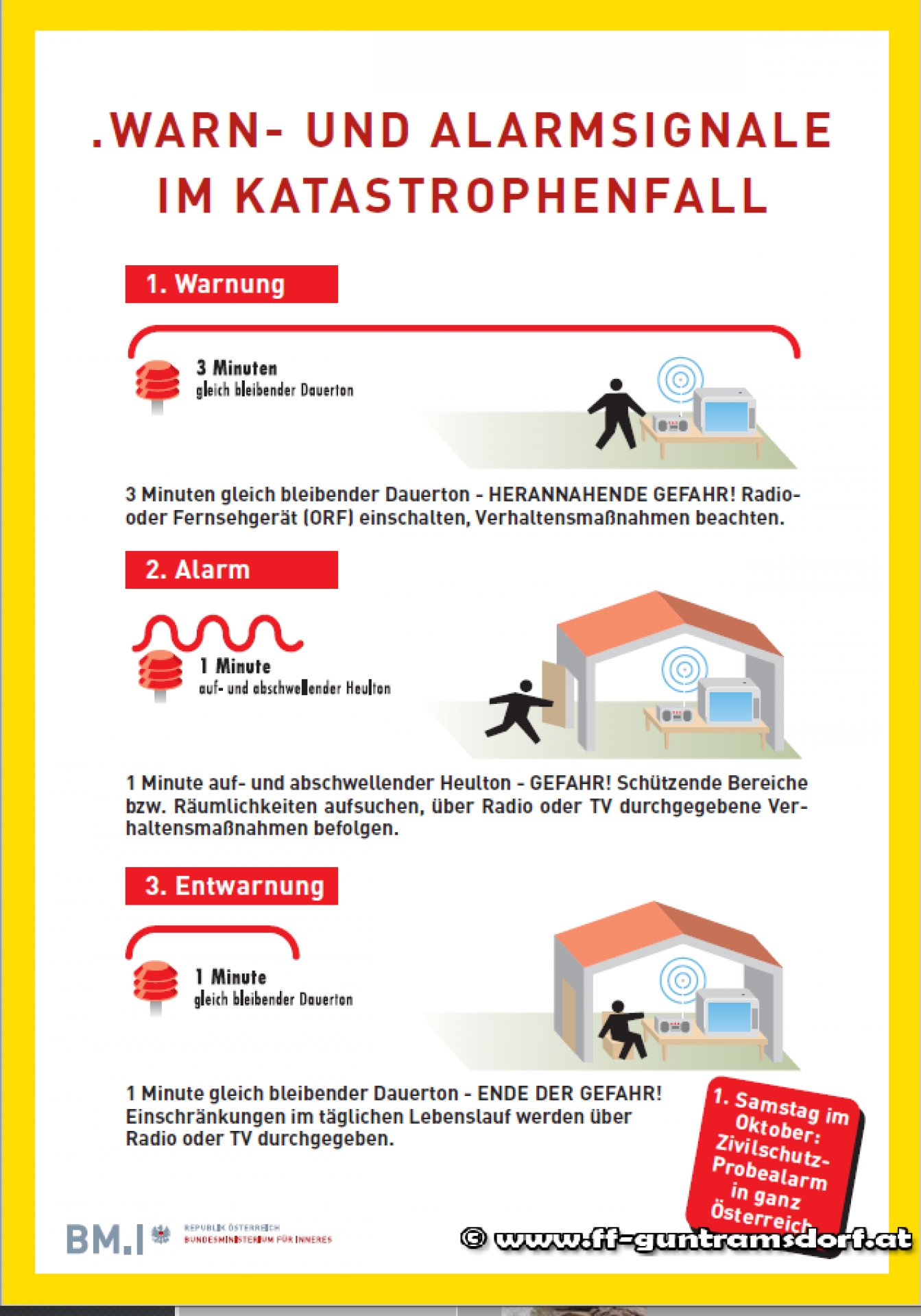 Am Samstag, dem 4. Oktober werden zwischen 12 Uhr und 12.45 Uhr nach dem Signal „Sirenenprobe" die drei Zivilschutzsignale „Warnung", „Alarm" und „Entwarnung" in ganz Österreich ausgestrahlt sowie eine AT-Alert Testwarnung (auf Mobiltelefonen) ausgelöst! |