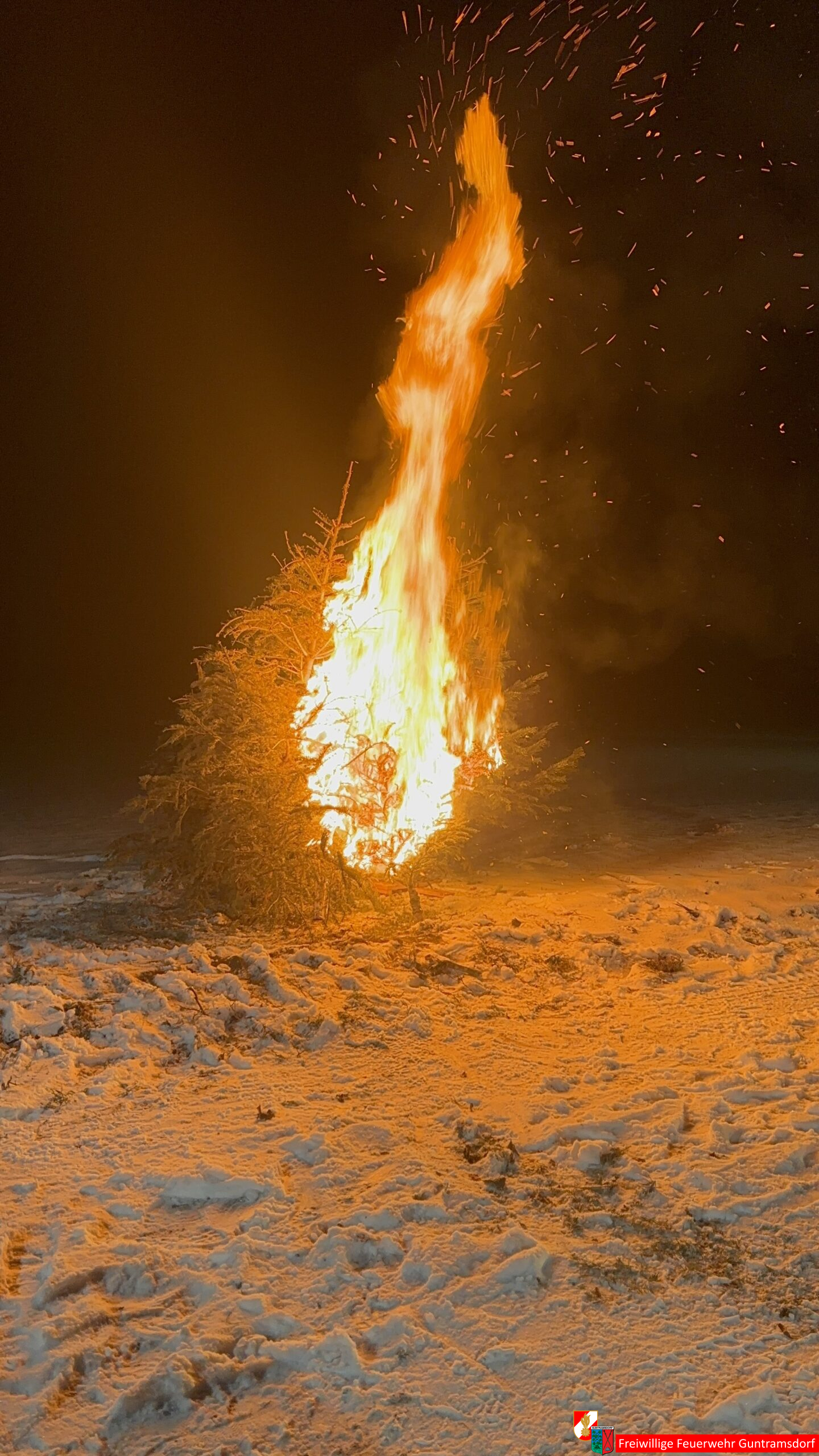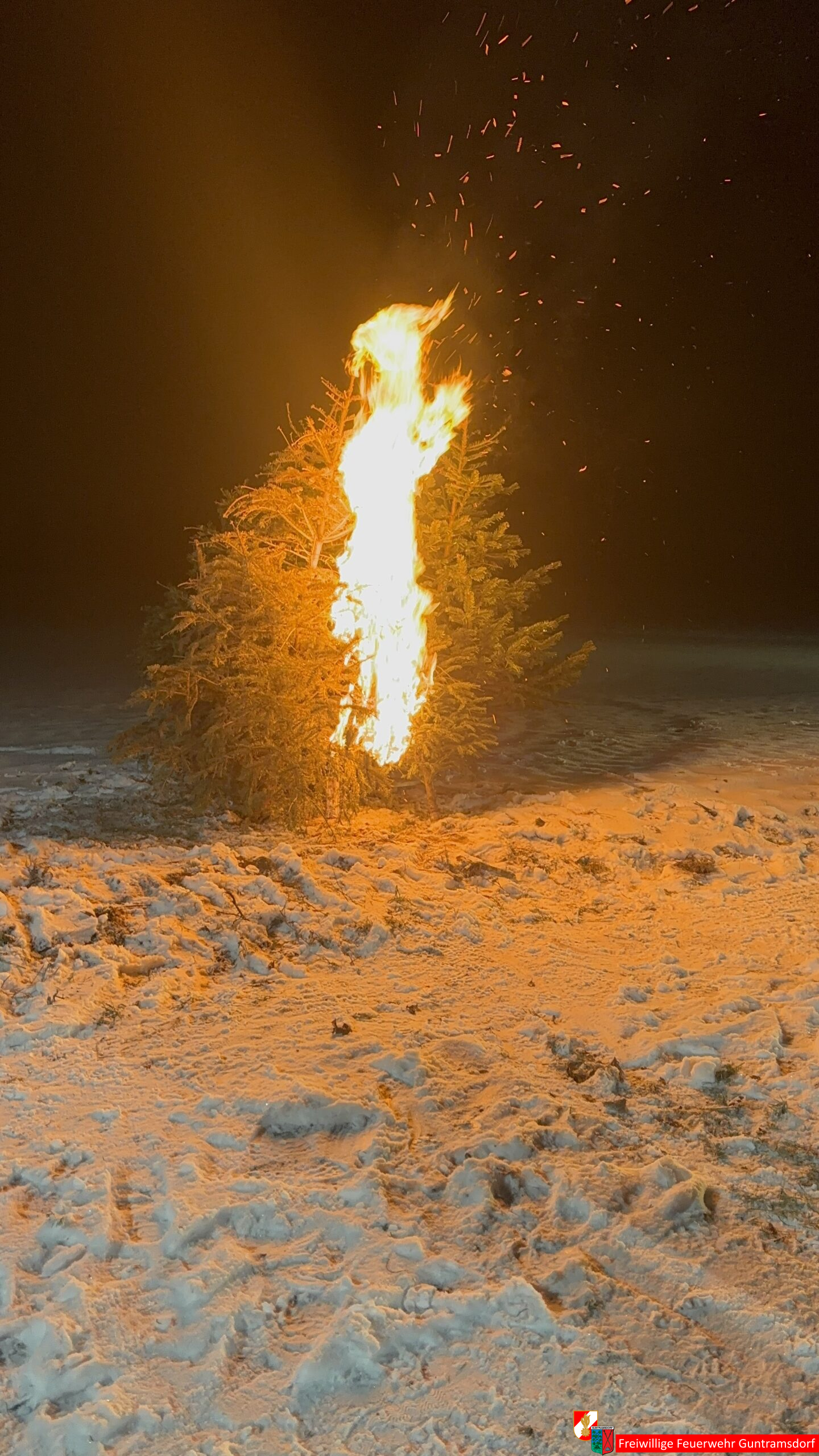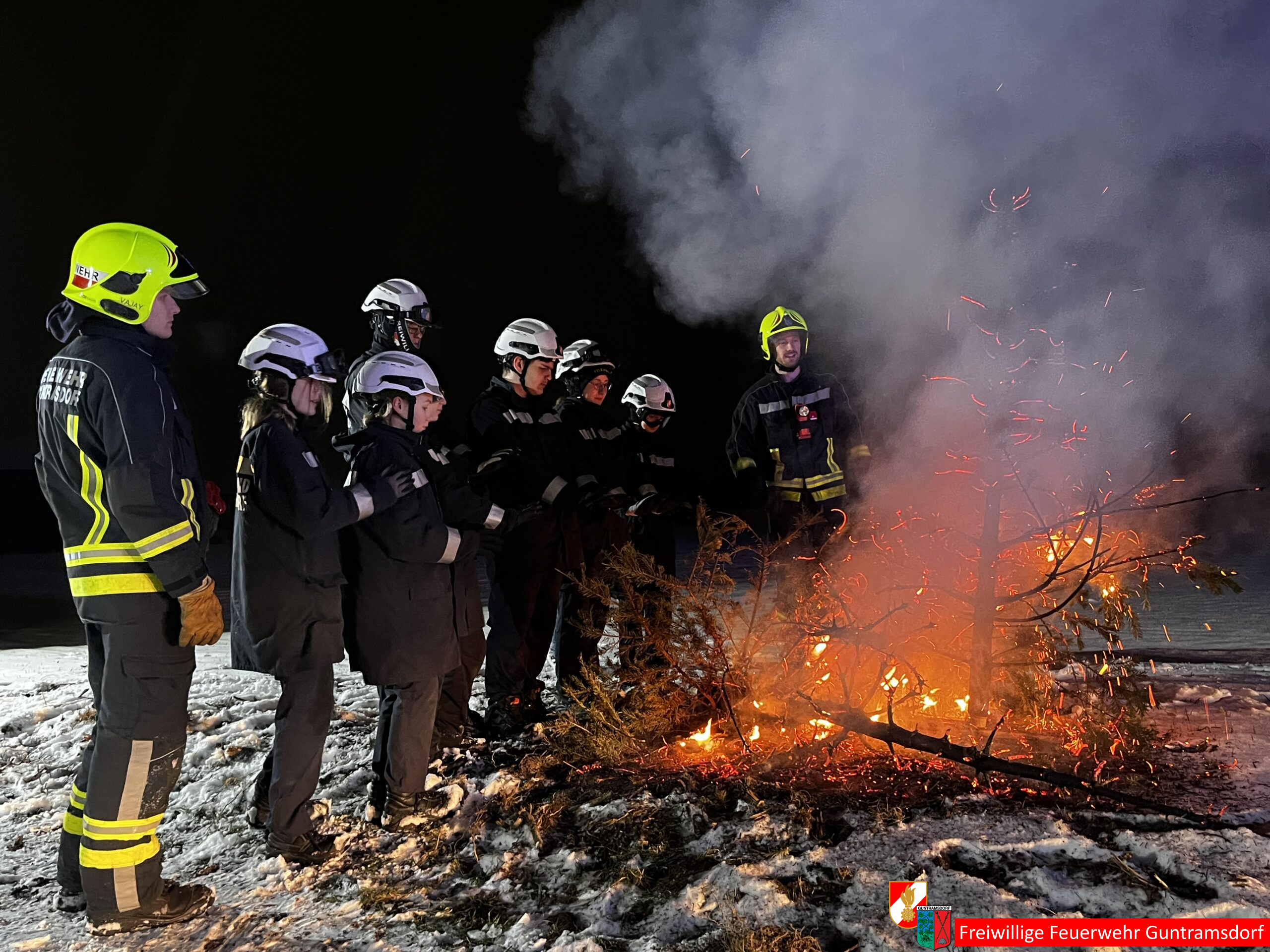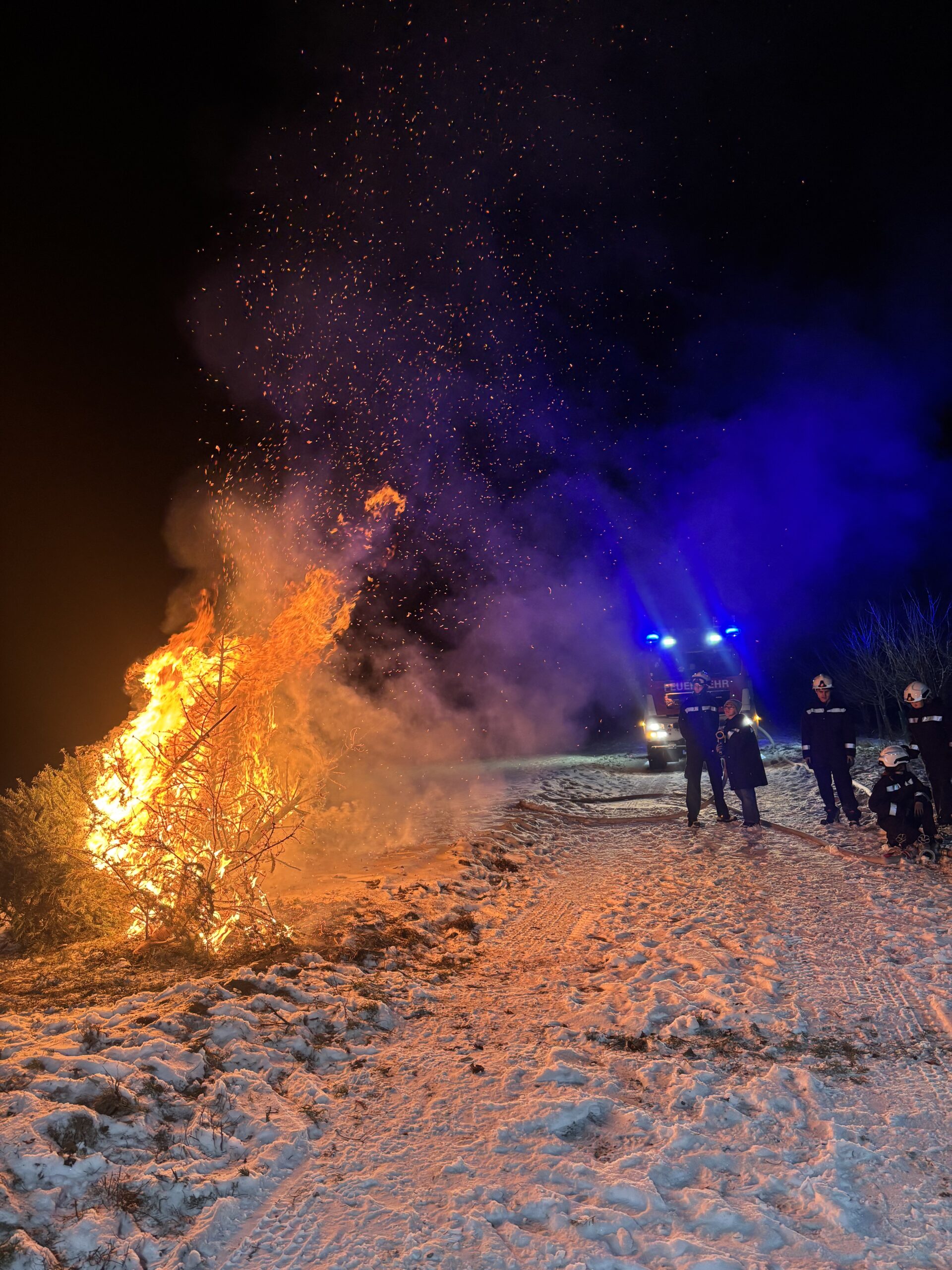 Selbstverständlich wurde hier eine sichere Umgebung geschaffen, sodass die angehenden Feuerwehrfrauen und -männer das Vorgehen bei einem Brandeinsatz in perfekten winterlich-weihnachtlichen Bedingungen üben konnten. Gleich vier Bäume wurden entzündet und konnten schlussendlich unter Vornahme von zwei Strahlrohren abgelöscht werden.