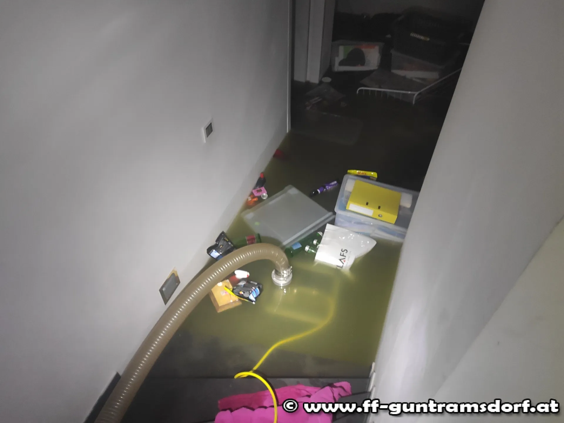 Aus bisher ungeklärten Gründen gelangte mit Fäkalien verschmutztes Abwasser in den weitläufigen Keller eines Einfamilienhauses und überschwemmte diesen ca. 80 cm hoch. Beim Eintreffen der Feuerwehr waren bereits Mitarbeiter des ASB (Abwasser Service Betrieb) mit einem Kanalpumpwagen vor Ort, um der Ursache auf den Grund zu gehen. Mit zwei leistungsstarken Pumpen der Feuerwehr wurden die knapp 100.000 Liter stinkendes Schmutzwasser aus dem Keller in einen Abwasserkanal auf der Straße gepumpt.