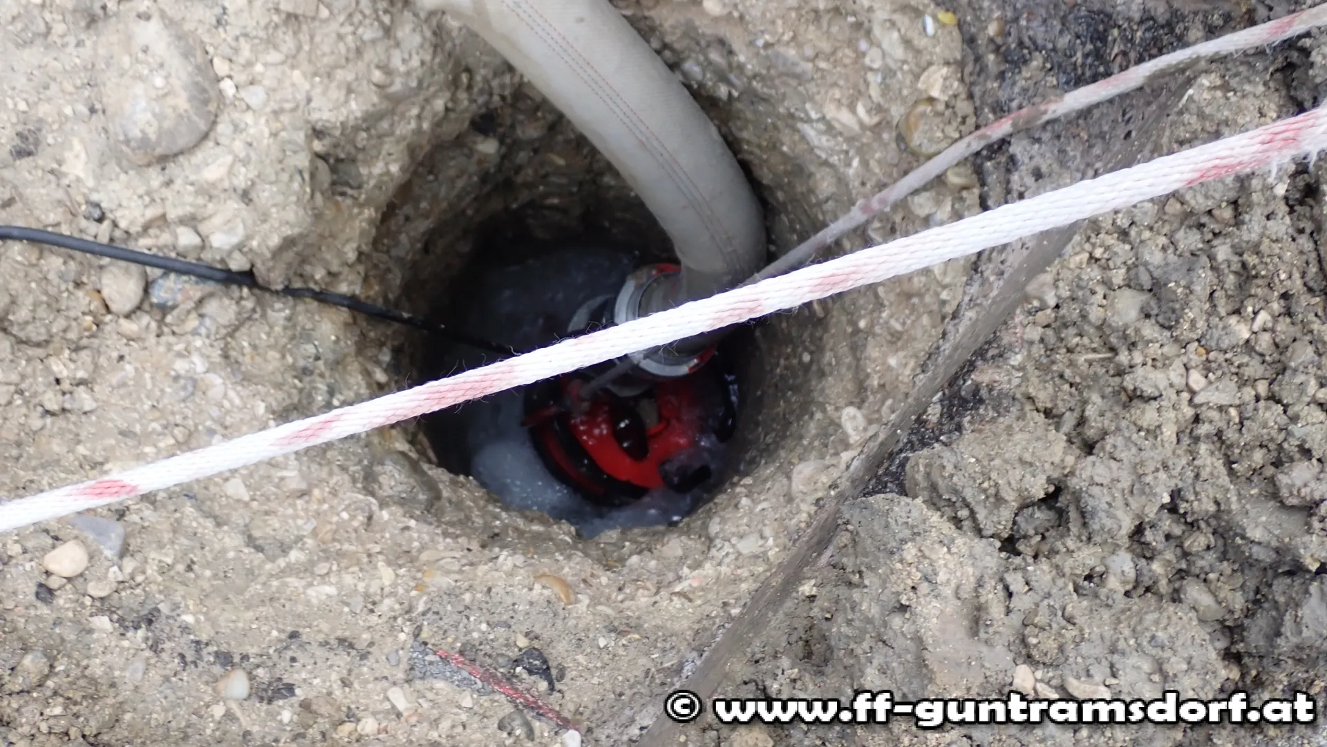 Umgehend wurde eine Tauchpumpe im Bohrloch versenkt, um das unter Druck ausströmende Wasser direkt wegzupumpen und eine weitere Überschwemmung im Umfeld zu unterbinden.