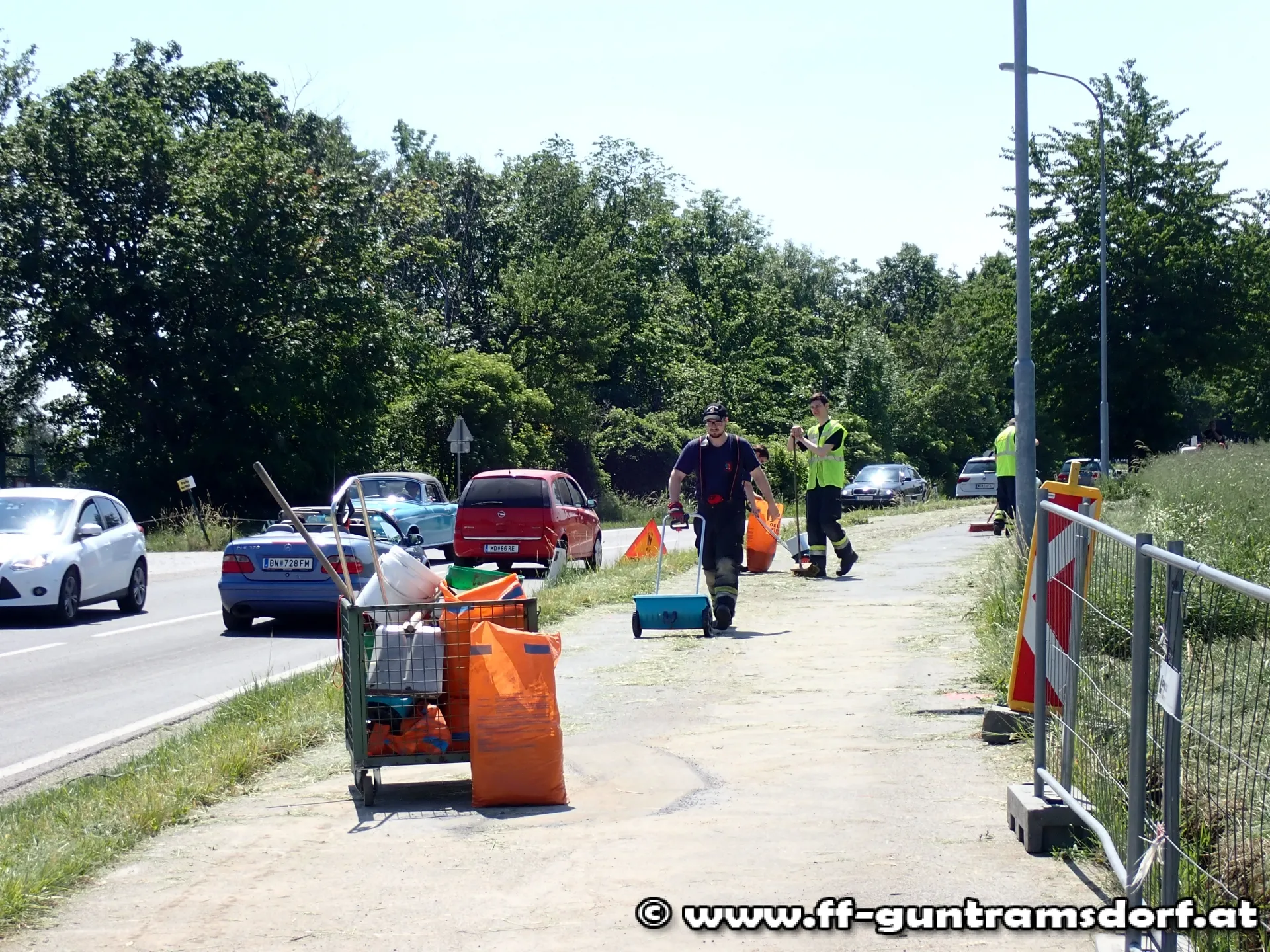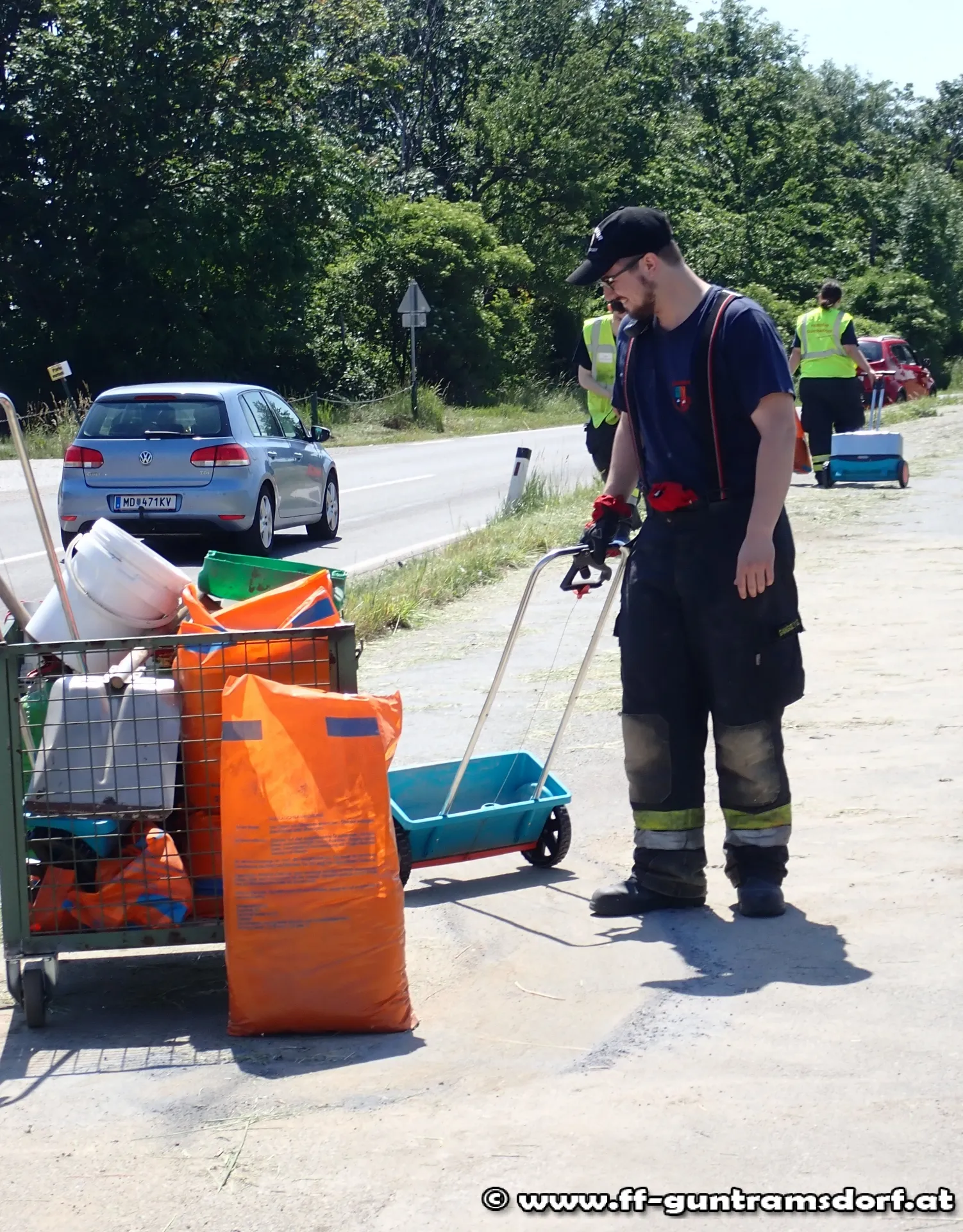 Mittels naturunbedenklichem Ölbindemittel, Bioversal-Feuerlöschern und Straßenbesen wurde die Verunreinigung in stundenlanger Handarbeit, bei sommerlichen 27 Grad, beseitigt. Unterdessen wurden weitere Ölflecken und -spuren entlang der Hauptstraße gemeldet und von den Einsatzkräfte der FF Guntramsdorf beseitigt.