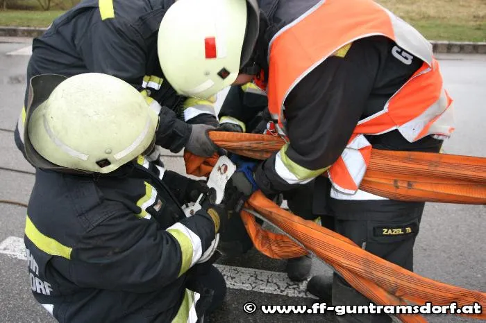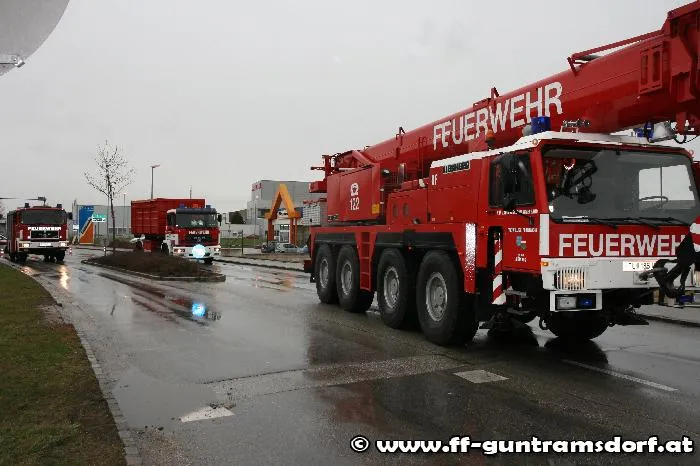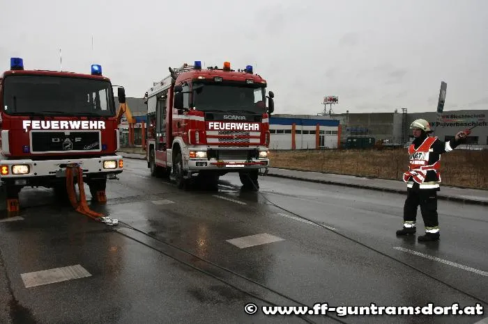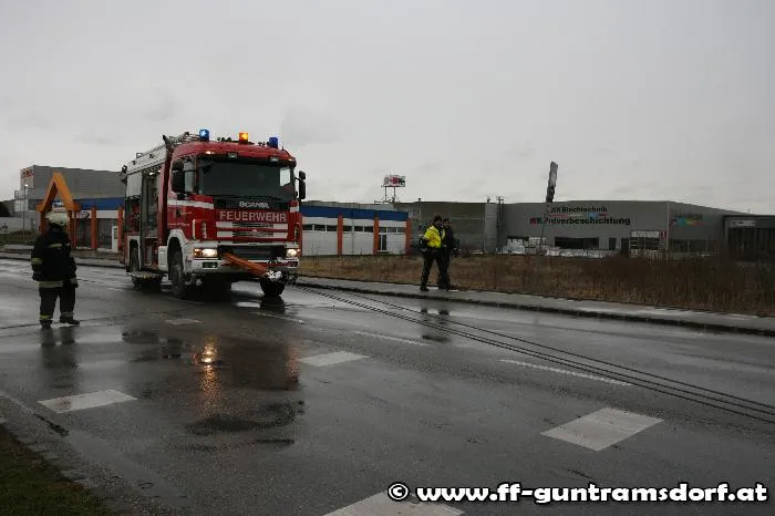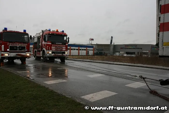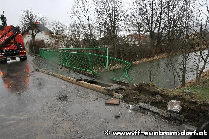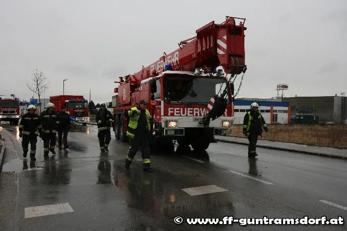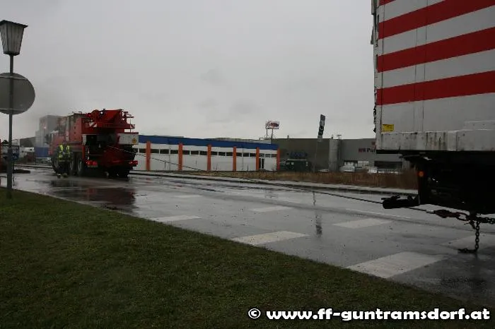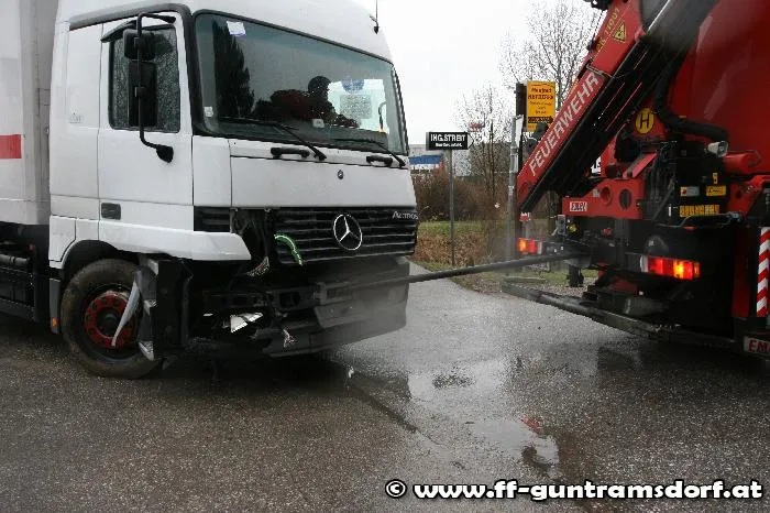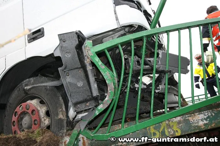 Knapp vor 08:00 Uhr wurde die FF Guntramsdorf zu einer LKW-Bergung auf der Neudorferstraße gerufen. Ein Kühltransporter war aus Richtung Neu-Guntramsdorf kommend, gegen das Geländer der sog. „Galdabbrücke“ (Brücke über den Wr.Neustädter Kanal) geprallt. Durch die Wucht des Aufpralls wurde der westseitige Gehsteig samt dem Geländer in seiner gesamten Länge um rund 10 cm verschoben. Der LKW geriet mit dem rechten Vorderrad auf die Böschung und war durch den Ausfall der Elektronik fahrunfähig. Nachdem Bergungsversuche mit der Seilwinde des Guntramsdorfer Rüstfahrzeuges – trotz einer Zugkrafterhöhung auf 15 Tonnen – scheiterten, wurde das Kranfahrzeug der FF Mödling angefordert.