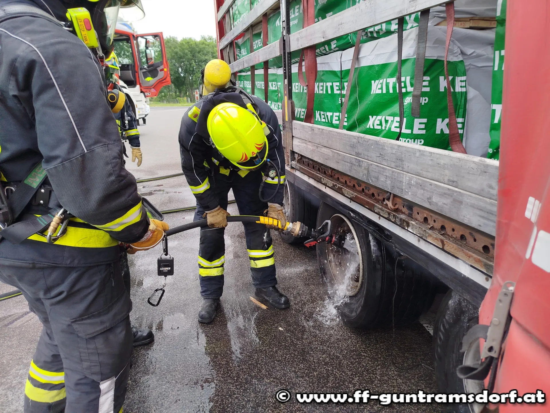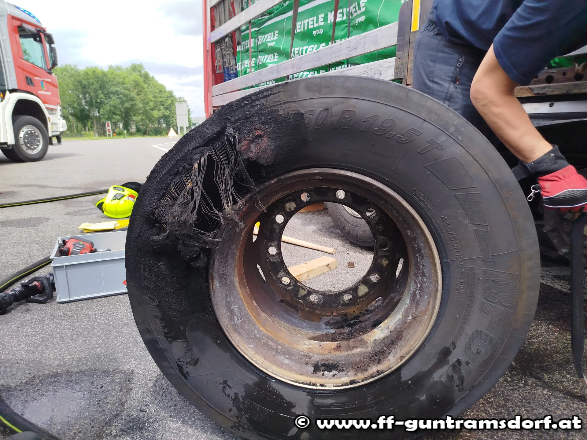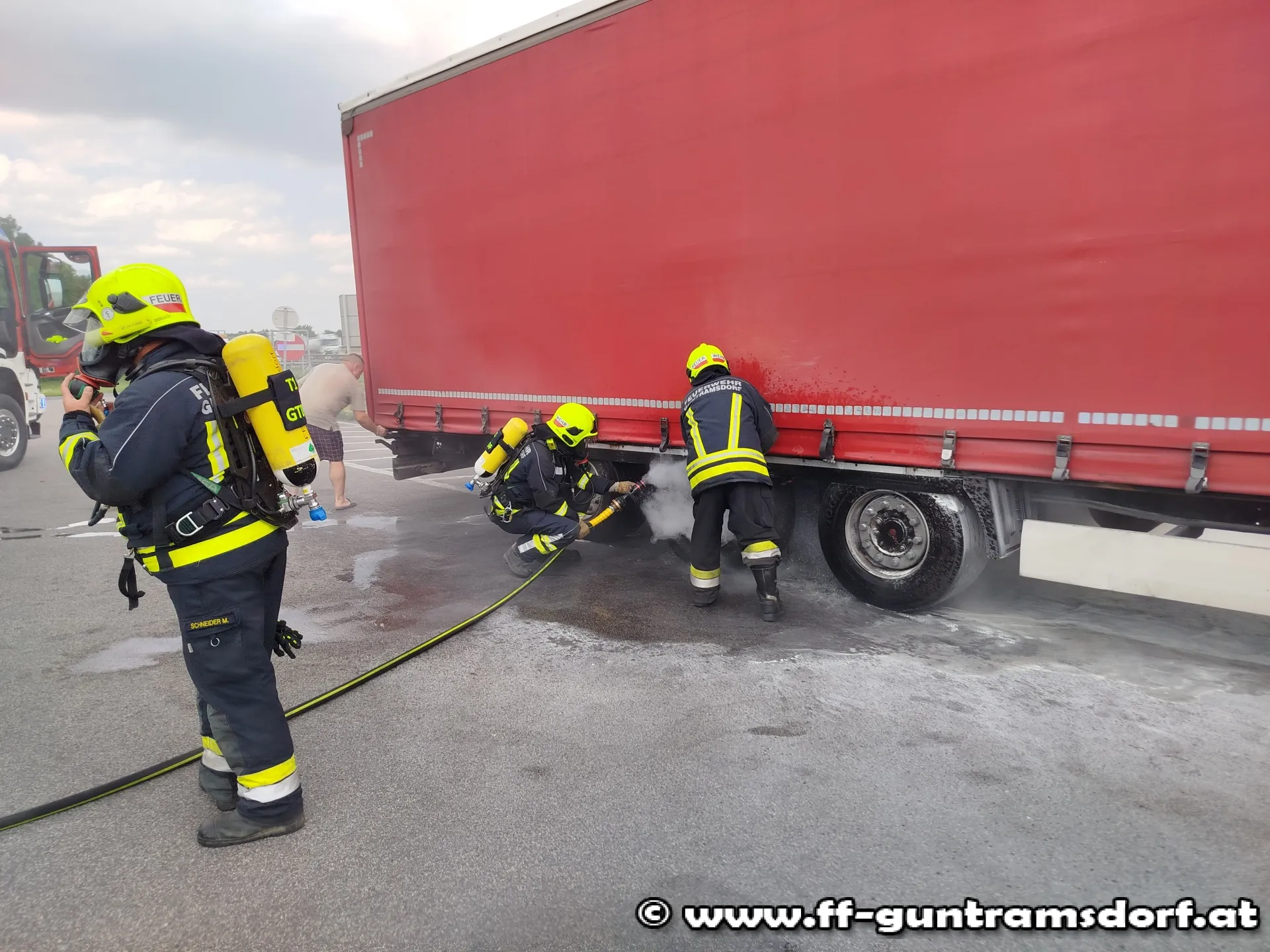Am Mittwoch den 11.06.2025 wurde die Freiwillige Feuerwehr Guntramsdorf um 12:43 Uhr per Sirene und Pager zu einem LKW-Brand auf die Raststation Guntramsdorf alarmiert. Beim Eintreffen der Einsatzkräfte stand ein Reifen eines Sattelzugs beladen mit Holz in Brand.