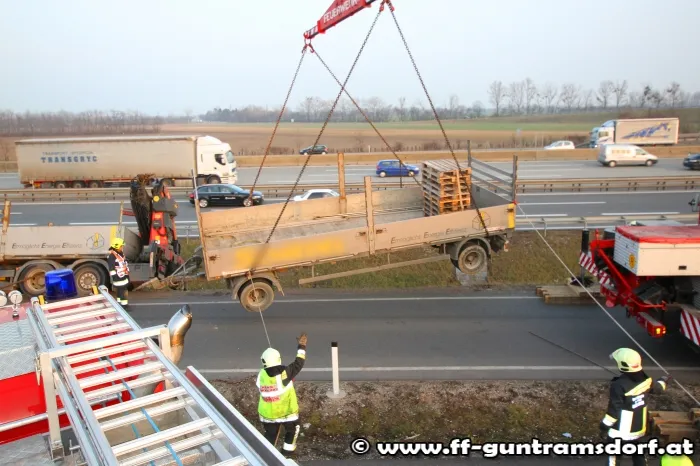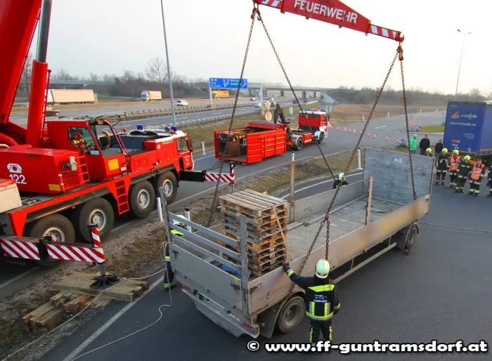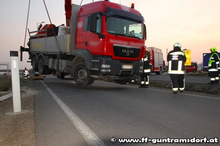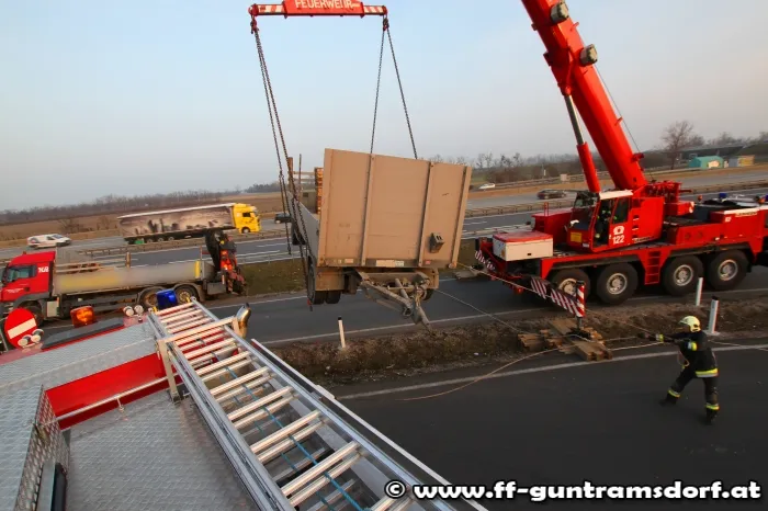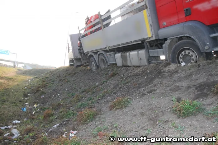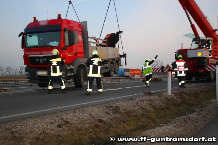 Am Nachmittag des 26.2.2014 wurde die Feuerwehr Guntramsdorf zu einer LKW Bergung auf die Autobahnraststation Guntramsdorf alarmiert. Ein LKW war samt Anhänger bei der Ausfahrt vom Rastplatz im unbefestigten Bankett abgerutscht und drohte über die Böschung zu stürzen. Die Feuerwehr Guntramsdorf rückte kurz nach der Alarmierung mit 4 Fahrzeugen und 19 Mitgliedern zur Einsatzstelle aus. Einsatzleiter EBR Moser entschied nach Erkundung der Lage, Kran Mödling zur Bergung des ca. 18t schweren LKW´s zu alarmieren. Zuerst wurde der Anhänger vom Zugfahrzeug getrennt und mittels Kranhebebalken auf die Straße zurückgehoben. Nachdem dies erledigt war wurde das Kranfahrzeug umpositioniert um das Zugfahrzeug zurück auf die Straße zu heben. Nach 3 Std. konnte die aufwändige Bergung abgeschlossen werden und die Feuerwehren Mödling und Guntramsdorf wieder einrücken. Der LKW konnte nach erfolgreicher Bergung seine Fahrt ungehindert fortsetzen.