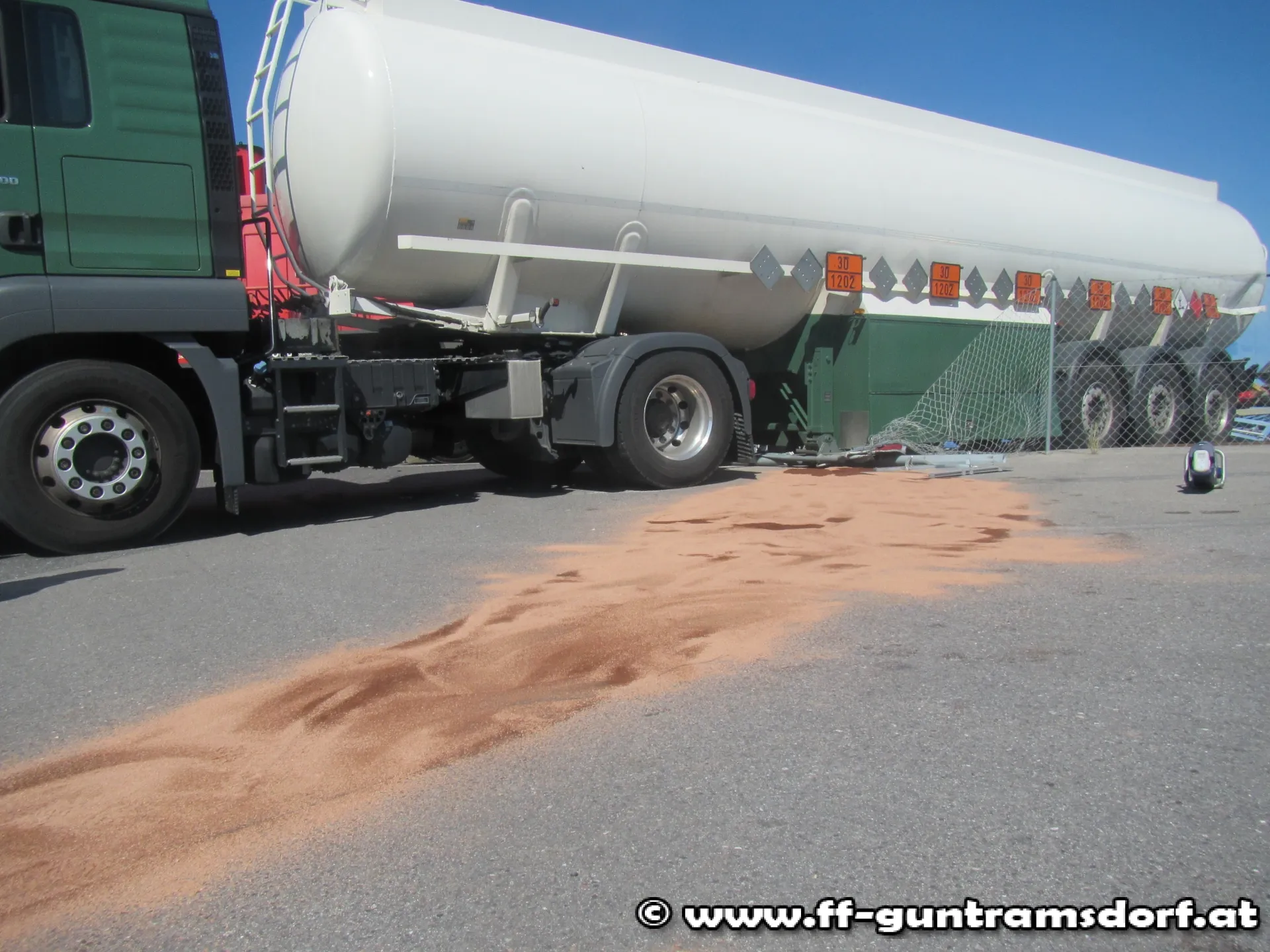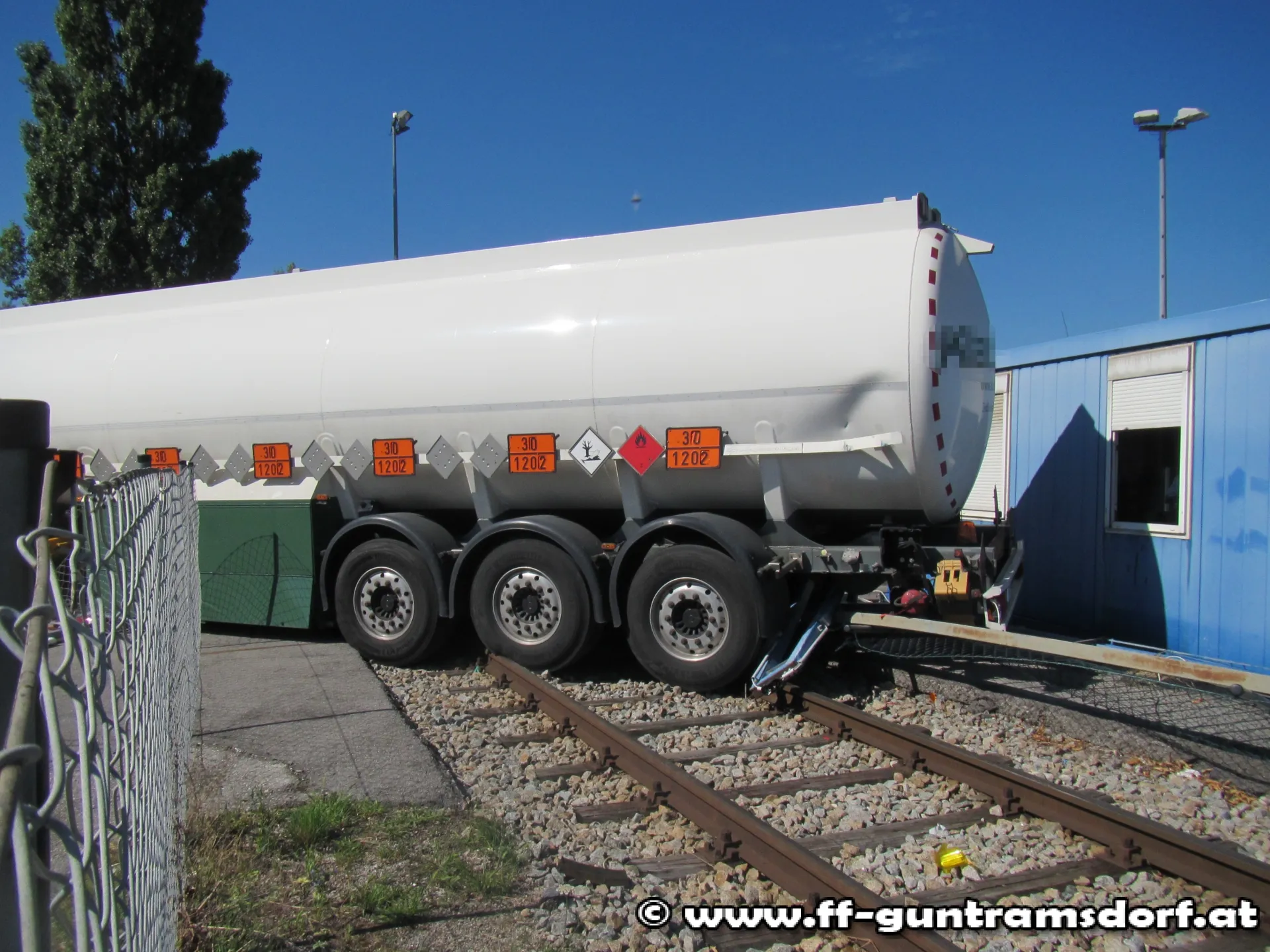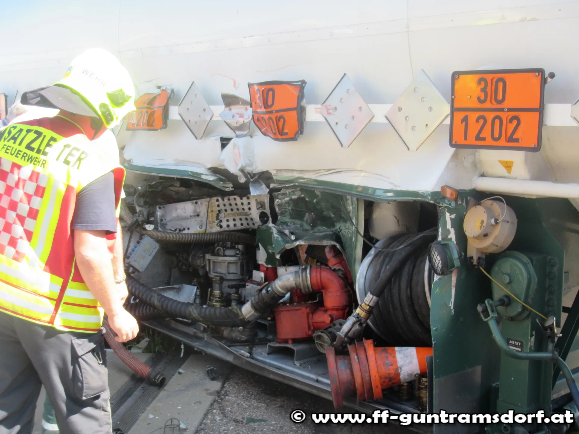 Um 09.22 wurde die FF Guntramsdorf mittels Pager und SMS zu einem Verkehrsunfall „Zug gegen PKW – keine Verletzten“ alarmiert. Beim Eintreffen stellte Einsatzleiter OBI Michael Schinko sofort fest, dass es sich bei dem vermeintlichen PKW in Wahrheit um einen LKW (Sattelzug) handelte. Aus bisher unbekannter Ursache kollidierte eine Güter-Lok der ÖBB mit einem LKW, welcher gerade dabei war aus einer Betriebsausfahrt auf die Industriestraße abzubiegen. Bei der Erkundung wurden auf dem Tank des Sattelauflegers Gefahrentafeln mit der Gefahrnummer „30“ und der UN-Nummer (auch Stoffnummer genannt) „1202“ festgestellt. Da es sich bei der UN-Nummer 1202 um eine sehr gängige Nummer handelt, war dem Einsatzleiter sofort klar, dass es sich hierbei um Diesel handelte.