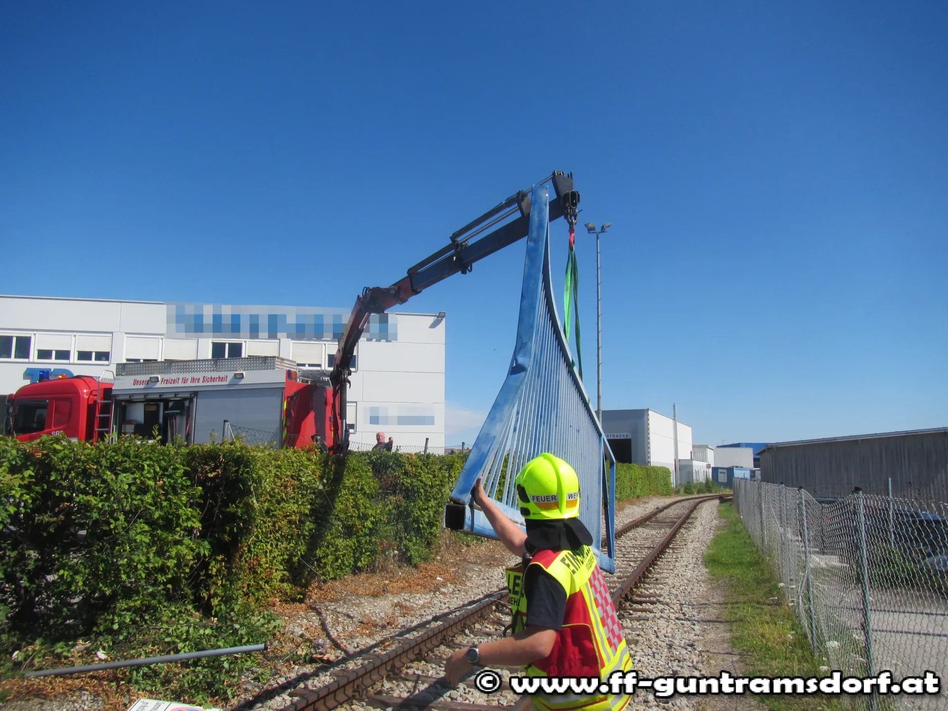 Abschließend musste beim Einsatz „LKW gegen Zug“ das ausgerissene Einfahrtstor des Betriebes mittels Kran des SRF von den Gleisen in das Betriebsgelände gehoben werden, sowie der Gleisbereich von Trümmern befreit werden.