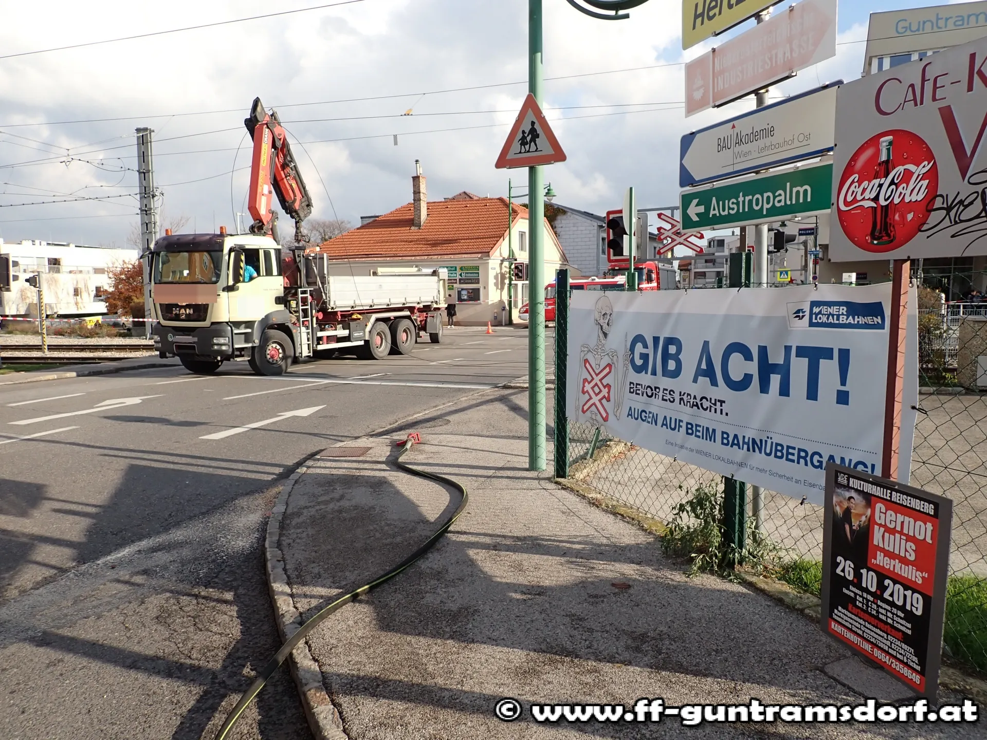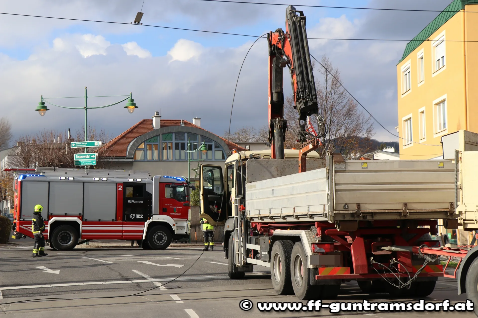 Ein LKW mit Ladekran war mit der Oberleitung der Wiener Lokalbahn kollidiert und hatte dabei ein Kabel abgerissen. Geistesgegenwärtig reagierte der LKW Lenker und blieb richtigerweise im Fahrzeug sitzen. Somit kam dieser nicht mit dem Strom in Kontakt und blieb unverletzt. Durch die Leitungen fließen rund 750 Volt Gleichstrom, welcher für den menschlichen Körper tödlich wirken würde.