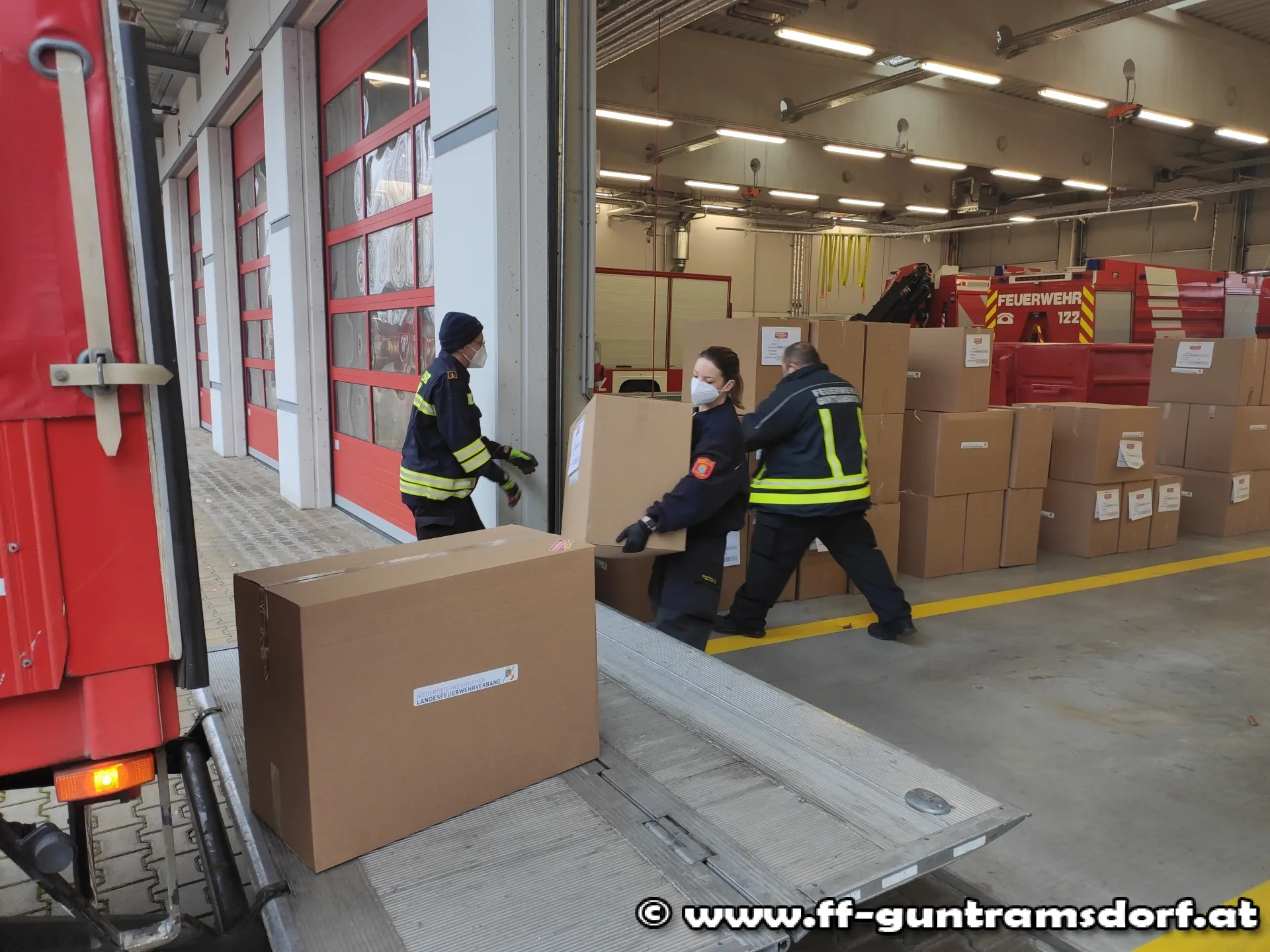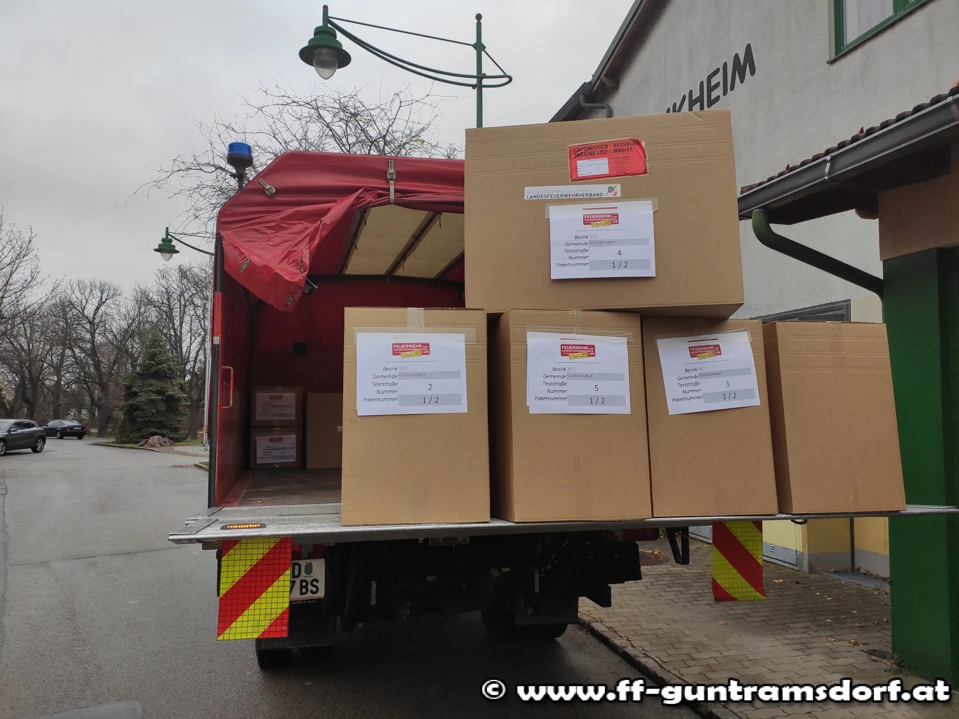 Die für die Gemeinden des Bezirkes zur Verfügung gestellte Ausrüstung für die Durchführung der Massentests (Handschuhe, Masken, Gesichtsschilde, Einwegschürzen, Hand- und Flächendesinfektionsmittel, Mundspateln etc.) wurden von der FF Wiener Neudorf vom NÖ Feuerwehr- und Sicherheitszentrum in Tulln abgeholt und ins Feuerwehrhaus Wiener Neudorf gebracht.