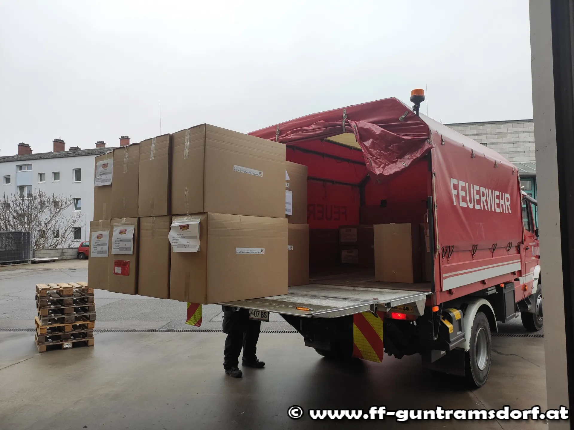 Da das Versorgungsfahrzeug der FF Guntramsdorf („LAST Guntramsdorf“) im Technischen Zug der KHD-Bereitschaft eingeteilt ist, holten am Vormittag zwei Guntramsdorfer Feuerwehrmitglieder die Ausrüstung in Wiener Neudorf ab und brachten diese nach Mödling, Gumpoldskirchen und natürlich auch nach Guntramsdorf.