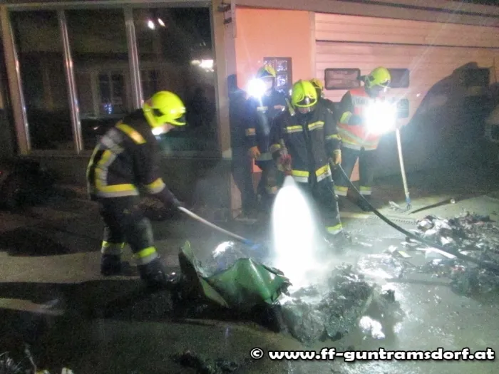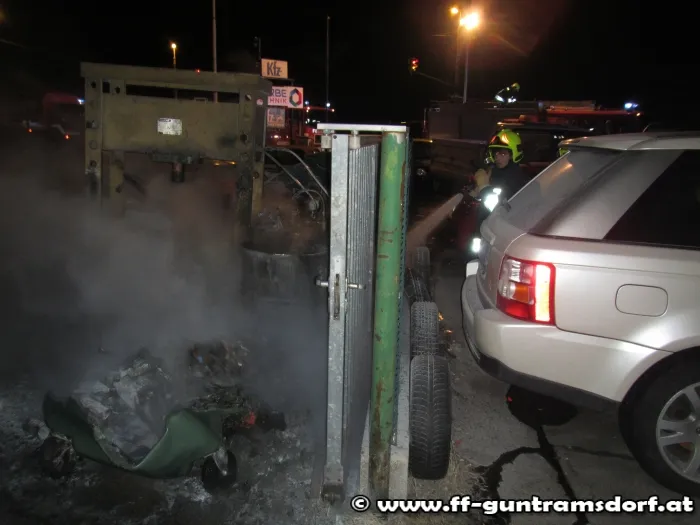 Um 22:11 Uhr wurde die FF Guntramsdorf zu einem Kleingewerbe-Brand mit dem Einsatzstichwort „Firma steht in Vollbrand“ auf die Triesterstraße alarmiert. Bei der Erkundung durch den Einsatzleiter stellte sich jedoch heraus, dass es sich um einen Müllbehälterbrand vor einer Firma handelt.