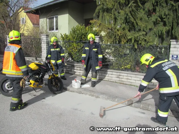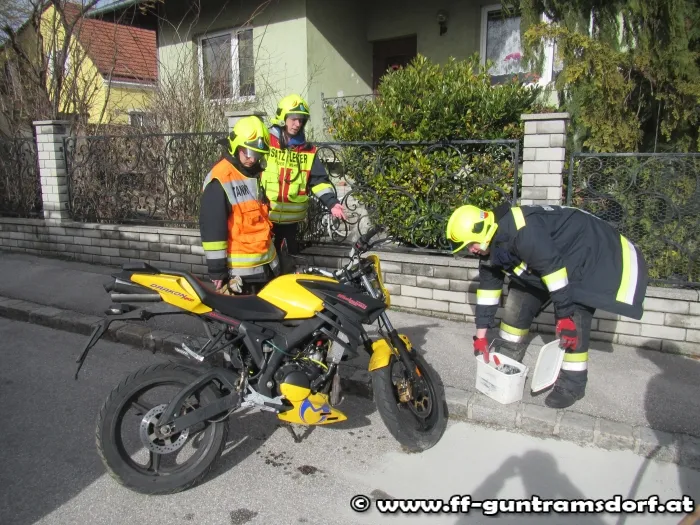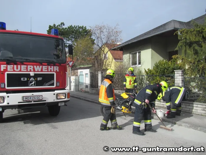 Um 13:25 Uhr wurde die Feuerwehr Guntramsdorf zu einem umgestürzten Moped gerufen, aus dem Öl bzw. Benzin austrat. Kurz nach der Alarmierung rückten 3 Fahrzeuge in die Rudolf Heintschel Straße aus. Das Fahrzeug wurde aufgestellt und die ausgeflossenen Betriebsstoffe mittels Zement gebunden. Nach 30 Minuten rückten alle Fahrzeuge wieder ins Feuerwehrhaus ein.