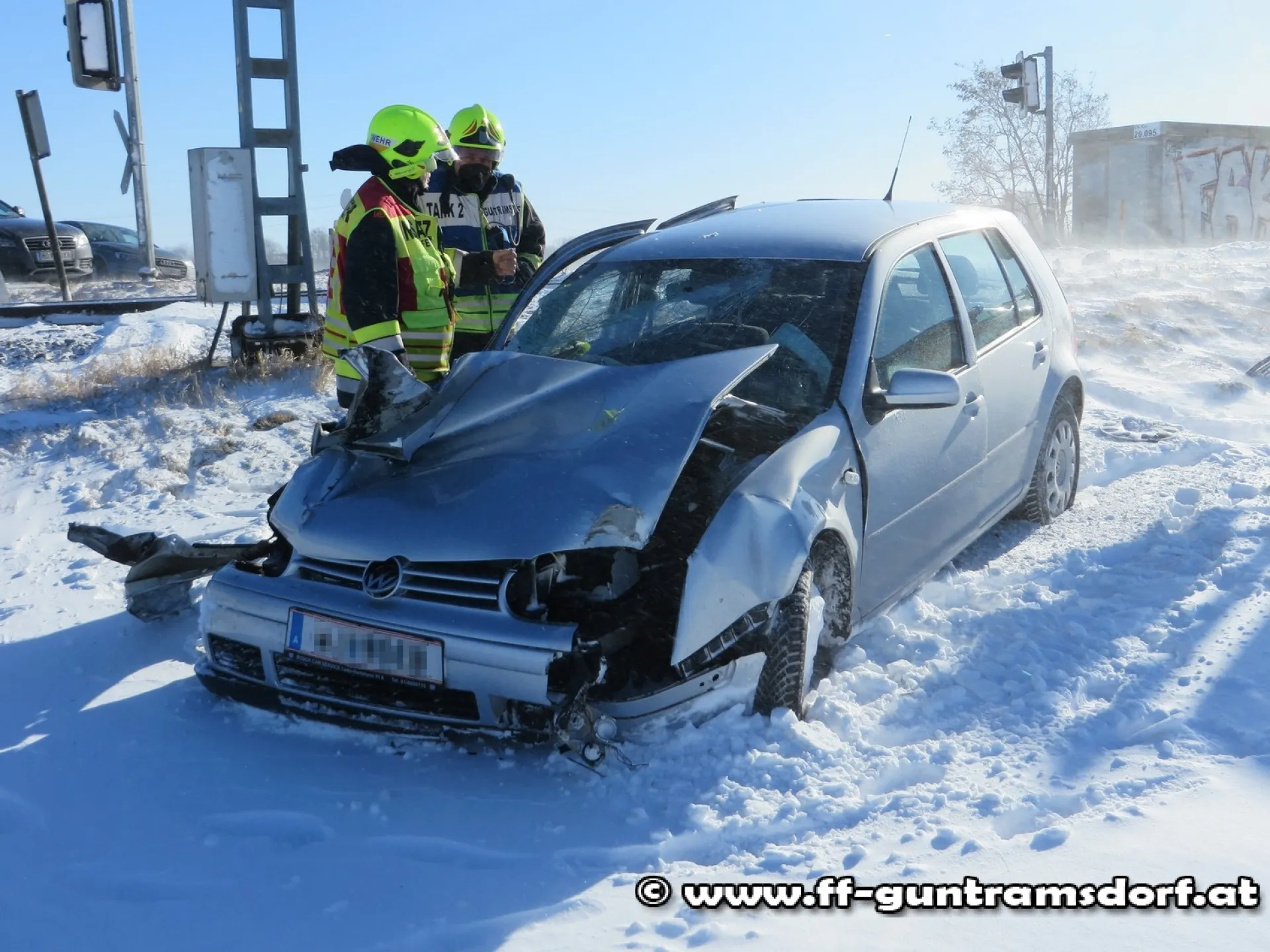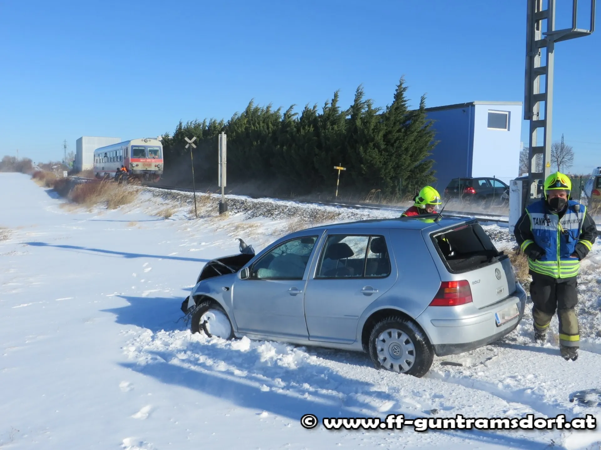 Großes Glück hatte die Lenkerin eines PKW beim Zusammenstoß mit einem Triebwagen der Aspangbahn auf der Laxenburgerstraße: Aufgrund der durch Verwehung schneeglatten Fahrbahn schlitterte der Wagen trotz Bremsversuche auf die Geleise, wurde dort vom Triebwagen erfasst und auf ein angrenzendes Feld geschleudert. Dabei wurde die Beifahrerseite des PKW aufgerissen, die Frau kam nach Aussage des Rettungsdienstes mit augenscheinlich leichten Verletzungen davon, wurde aber dennoch zur Kontrolle in ein Krankenhaus verbracht.