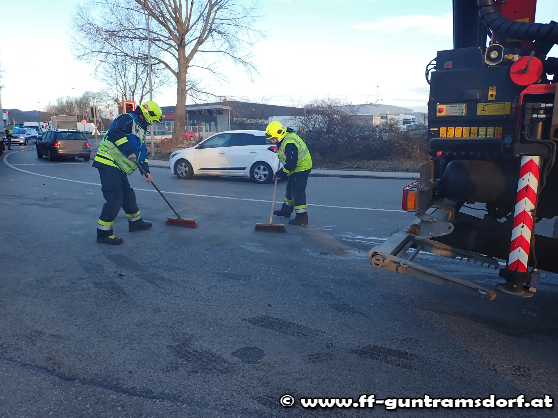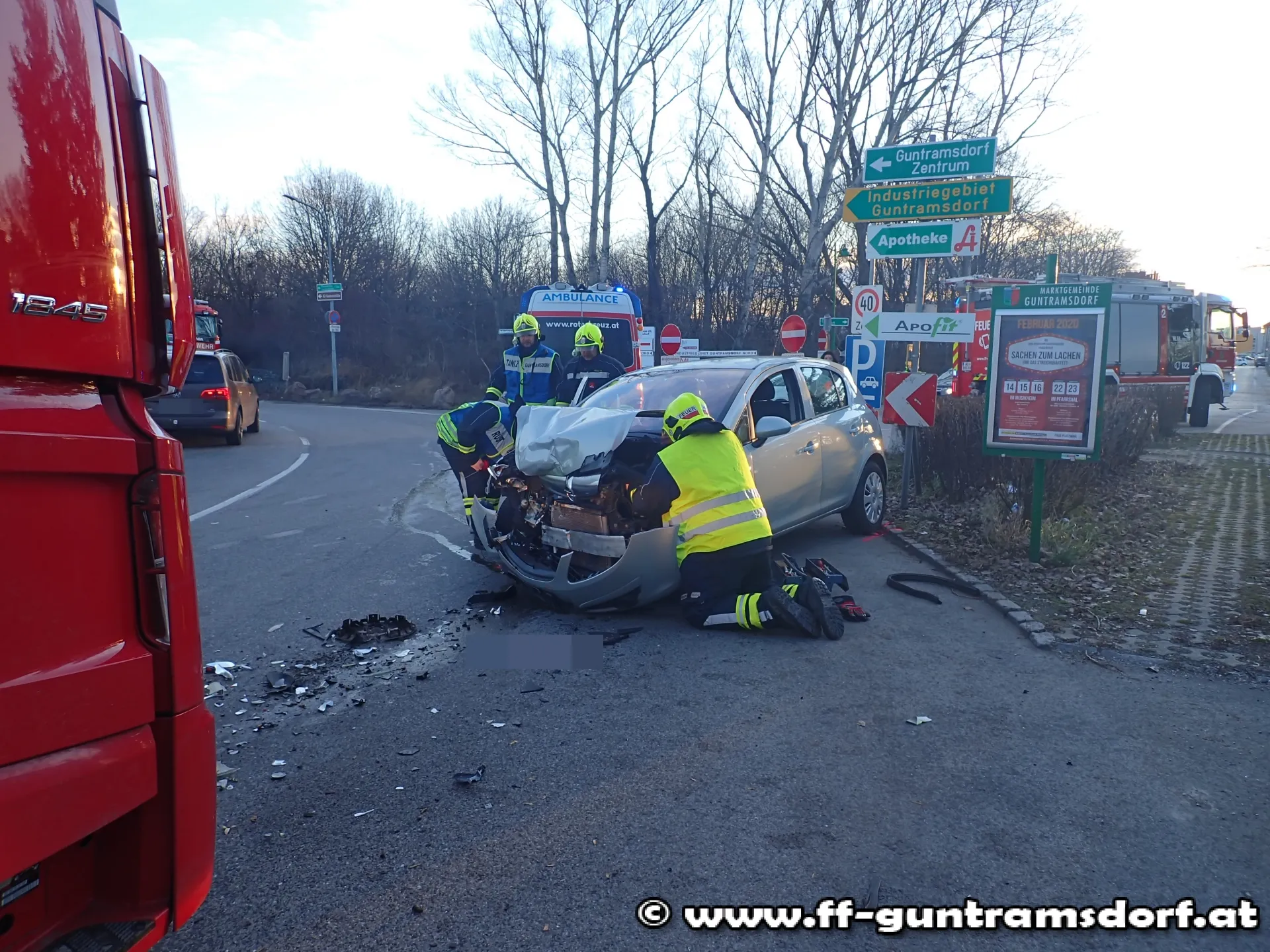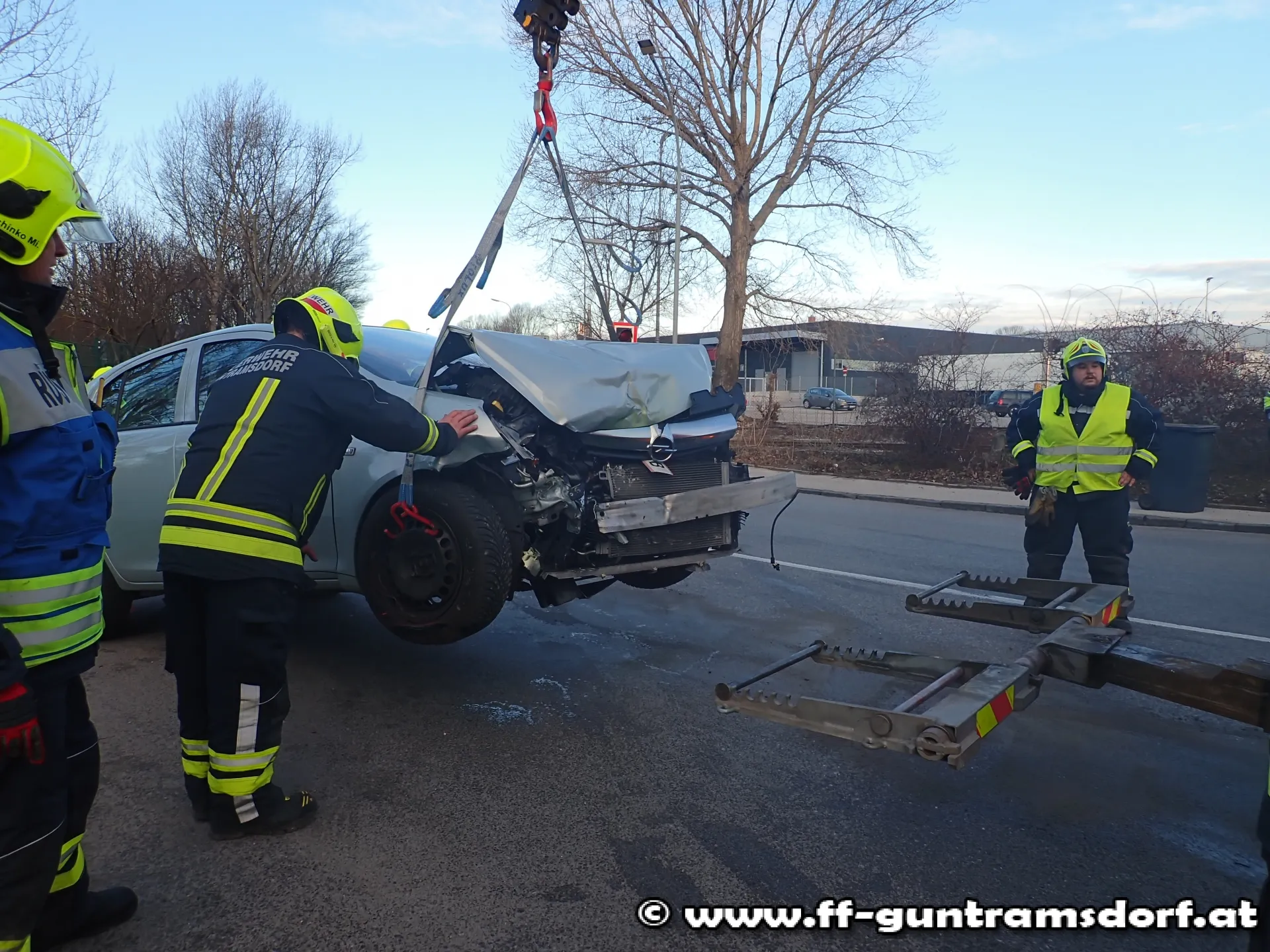 Um 07:30 Uhr wurde die FF Guntramsdorf zu einem Verkehrsunfall auf der Industriestraße alarmiert. Ein PKW war in einer Rechtskurve aus unbekannter Ursache auf die Gegenfahrbahn geraten und frontal gegen einen entgegenkommenden LKW geprallt. Die Lenkerin des PKW wurde vom Roten Kreuz mit Verletzungen unbestimmten Grades ins Krankenhaus gebracht. Die Feuerwehr verbrachte den schwer beschädigten und fahrunfähigen PKW auf einen gesicherten Abstellplatz und beseitigte die ausgeflossenen Betriebsmittel. Der ebenfalls beschädigte LKW konnte die Fahrt selbständig fortsetzen.