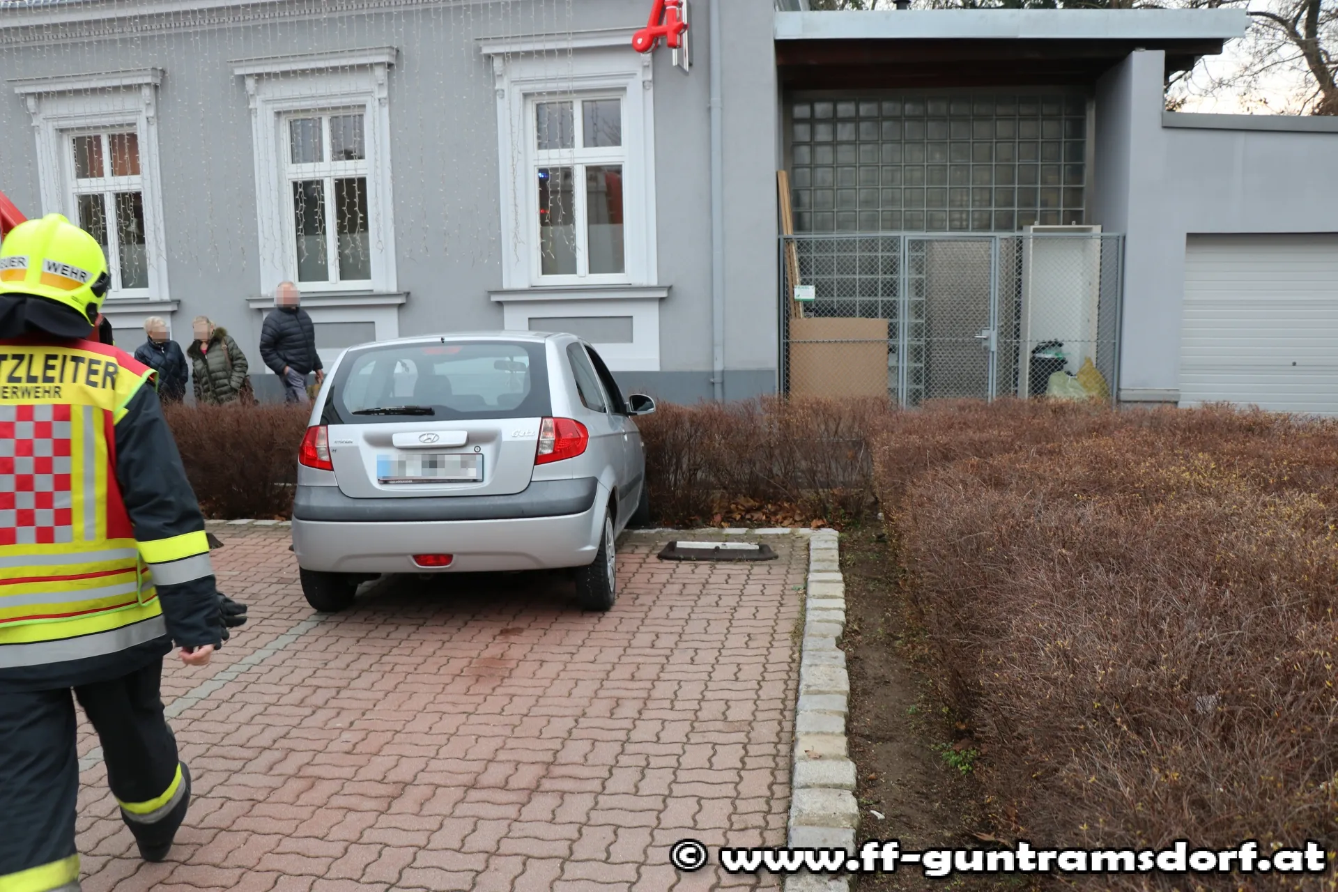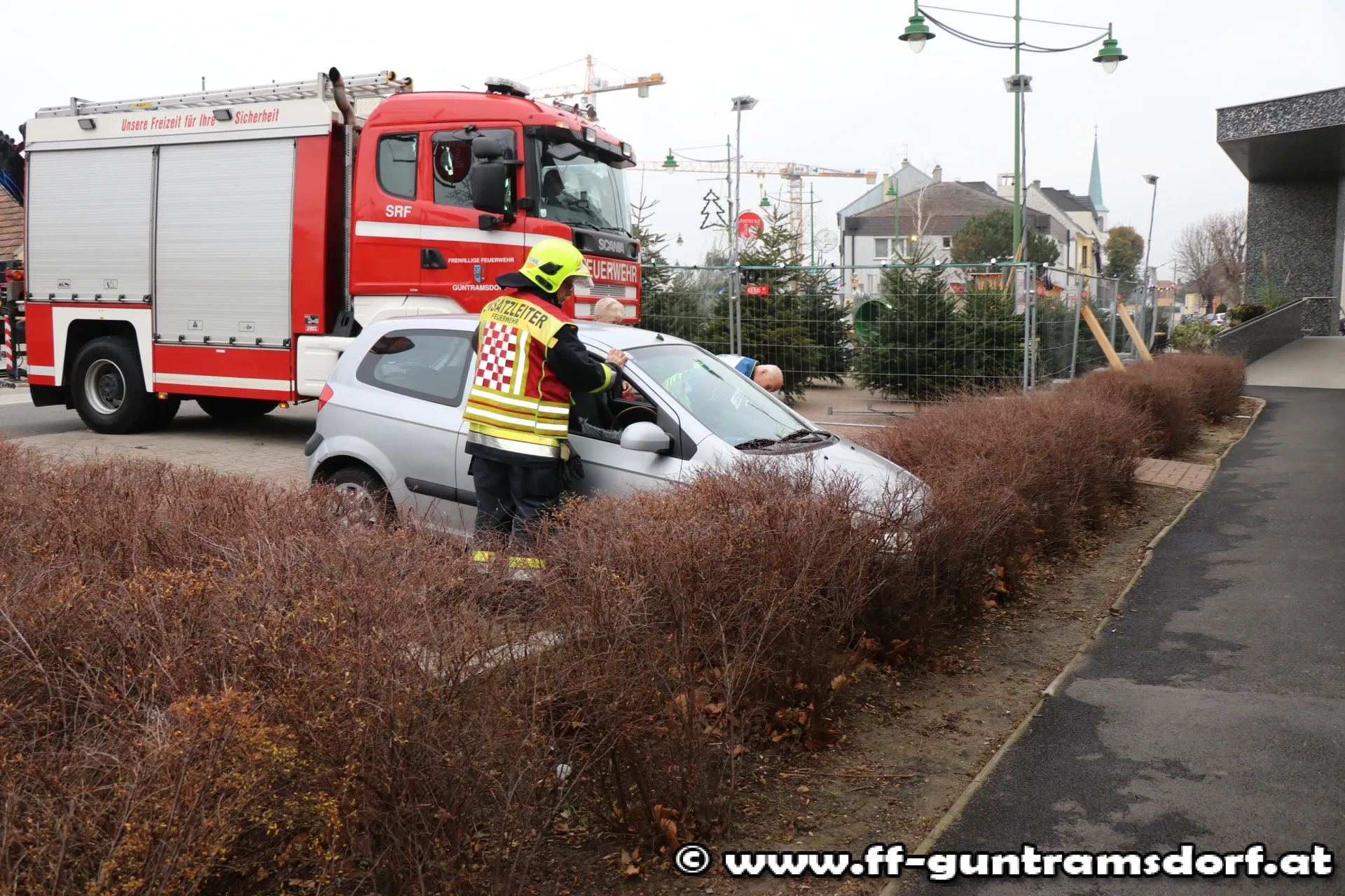 Am Parkplatz der Apotheke war eine Lenkerin mit ihrem PKW etwas zu weit über den Randstein gefahren, sodass der Wagen mit der Vorderachse im Blumenbeet landete und auf der Bodenplatte aufsaß.