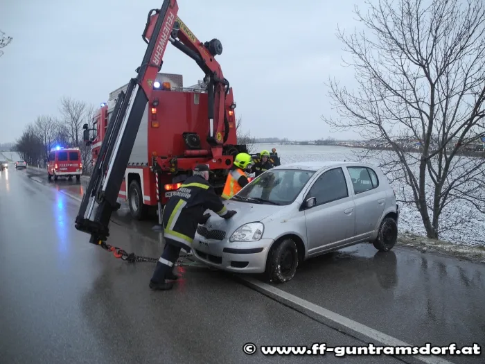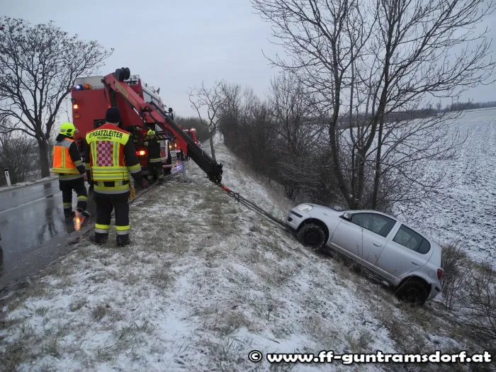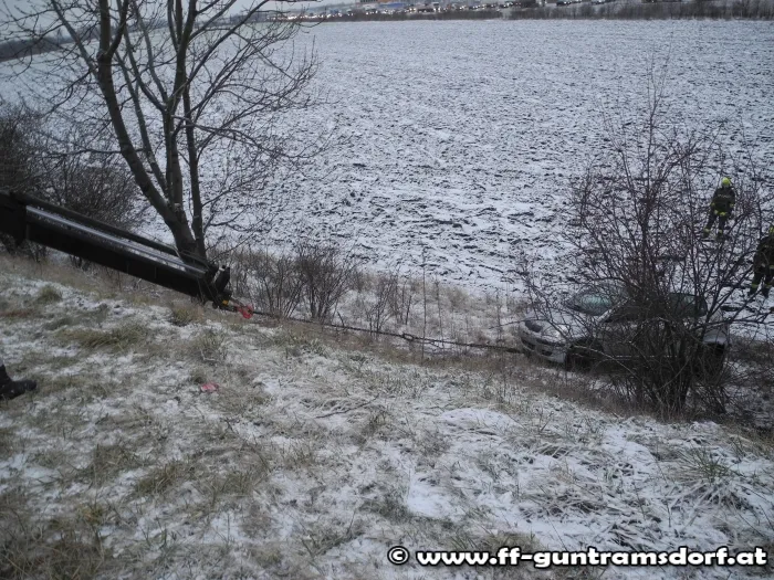 Am 27.01 wurde die FF Guntramsdorf mittel Pager und SMS zu einer Fahrzeugbergung auf die Münchendorferstraße alarmiert. Aus bisher unbekannter Ursache kam ein PKW von der Straße ab, stürzte über eine Böschung und kam im anliegenden Feld zu stehen. Mittels Rundschlingen und Ketten wurde der PKW am Haken des Krans vom SRF befestigt und anschließenden über die Böschung hinauf gezogen. Zeitweise musste der Verkehr während der Bergung von der Exekutive angehalten werden. Nach rund einer Stunde konnte die FF Guntramsdorf wieder einrücken.