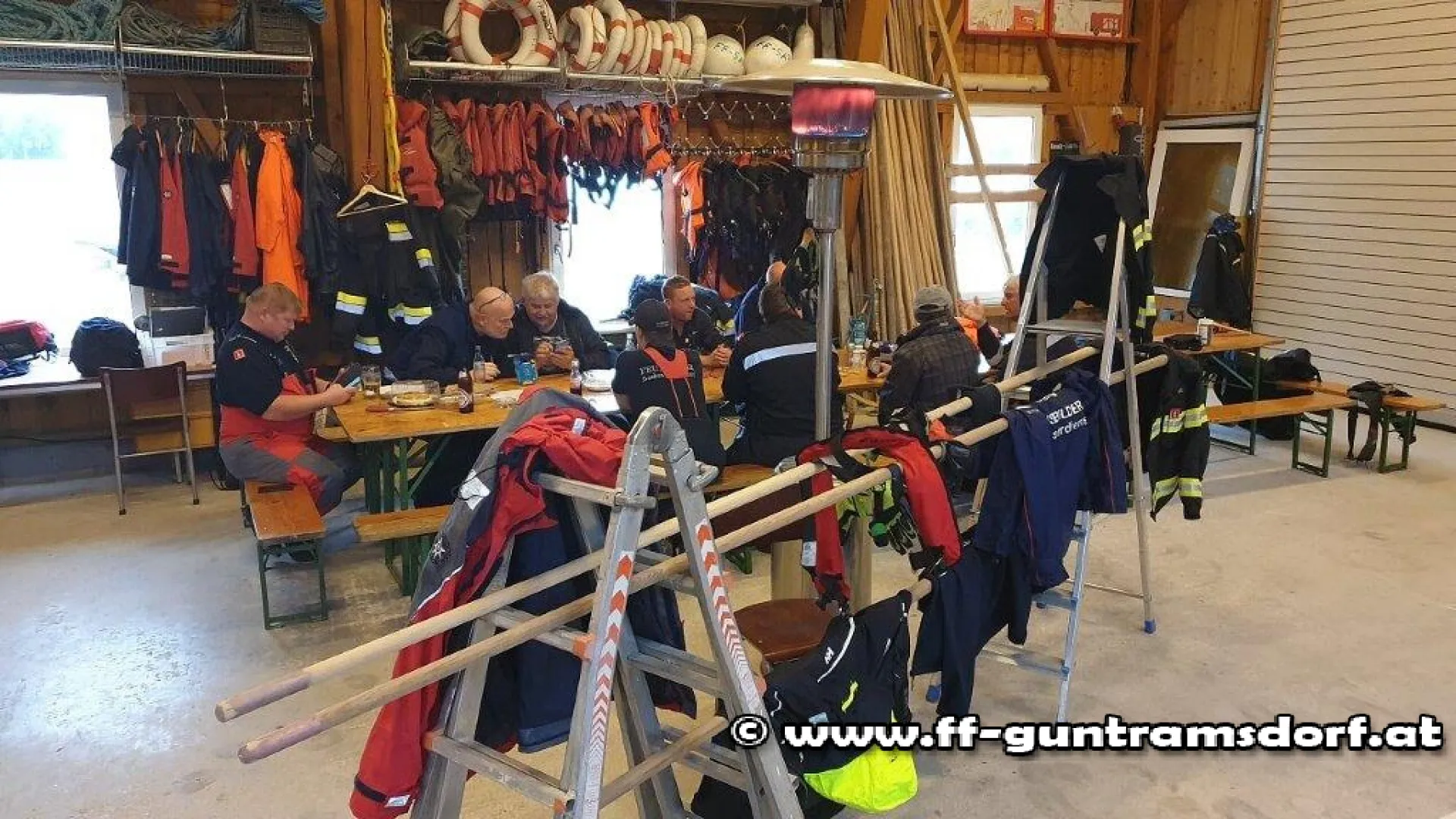 Leider hatte es am Samstag stark geregnet, weshalb wegen Kälte und schlechter Sicht die geplante Nachtfahrt abgesagt wurde. Darum wurde das Nachtmahl im Bootshaus der FF Sarling eingenommen, während die durchnässte Kleidung vor einem Gasheizstrahler zum Trocknen aufgehängt wurde.