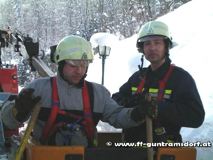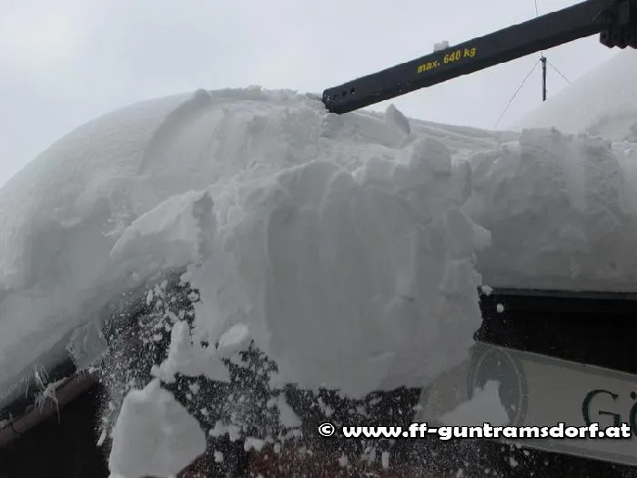 Unsere erste Einsatzadresse war der Göstlinger Hof. Wir brachten den Rüst in Stellung und räumten zunächst mit dem Kran den Schnee vom Dach. Dabei kam es zu einem zwar vergleichsweise harmlosen, aber dennoch unangenehmen Zwischenfall: Der Bagger, welcher die vom Dach beförderten Schneemassen verbringen sollte, rutschte mit der Schaufel gegen den Rüst. Der Schaden hielt sich in Grenzen, unser Rüst war weiter einsatzbereit.