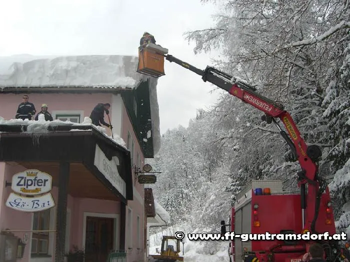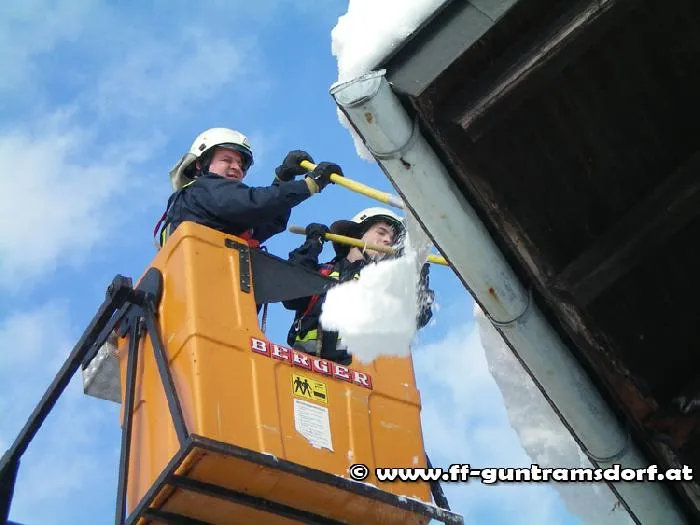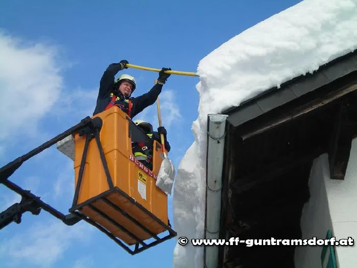 Mit Hilfe des Krankorbs schaufelten wir dann händisch Unmengen von Schnee vom Dach das Göstlinger Hofes, bevor wir zu den nächsten Einsatzadressen wechselten.