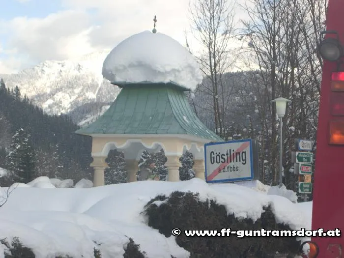 Nach rund zweistündiger Fahrt, welche uns teilweise durch idyllische Winterlandschaften führte, erreichten wir unseren Einsatzort: Göstling. Bevor wir allerdings mit den eigentlichen Arbeiten beginnen konnten, mussten zunächst bei Rüst und Last noch Schneeketten angelegt werden.