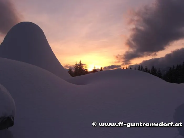 Im Laufe des Nachmittags wurden wir zu einem außerhalb von Göstling befindlichen Hof beordert. Nach einer etwa halbstündigen Fahrt kamen wir bei dem Gebäudekomplex an, der ob der Schneemassen erst aus der Nähe zu erkennen war. Auch dort kamen unsere großen und kleinen Schneeschaufeln zum Einsatz. Ein wunderschöner, fast schon kitschiger Sonnenuntergang war der Lohn für die Arbeit der vergangenen Stunden…
