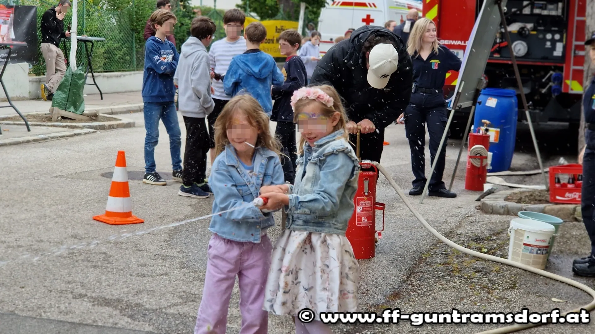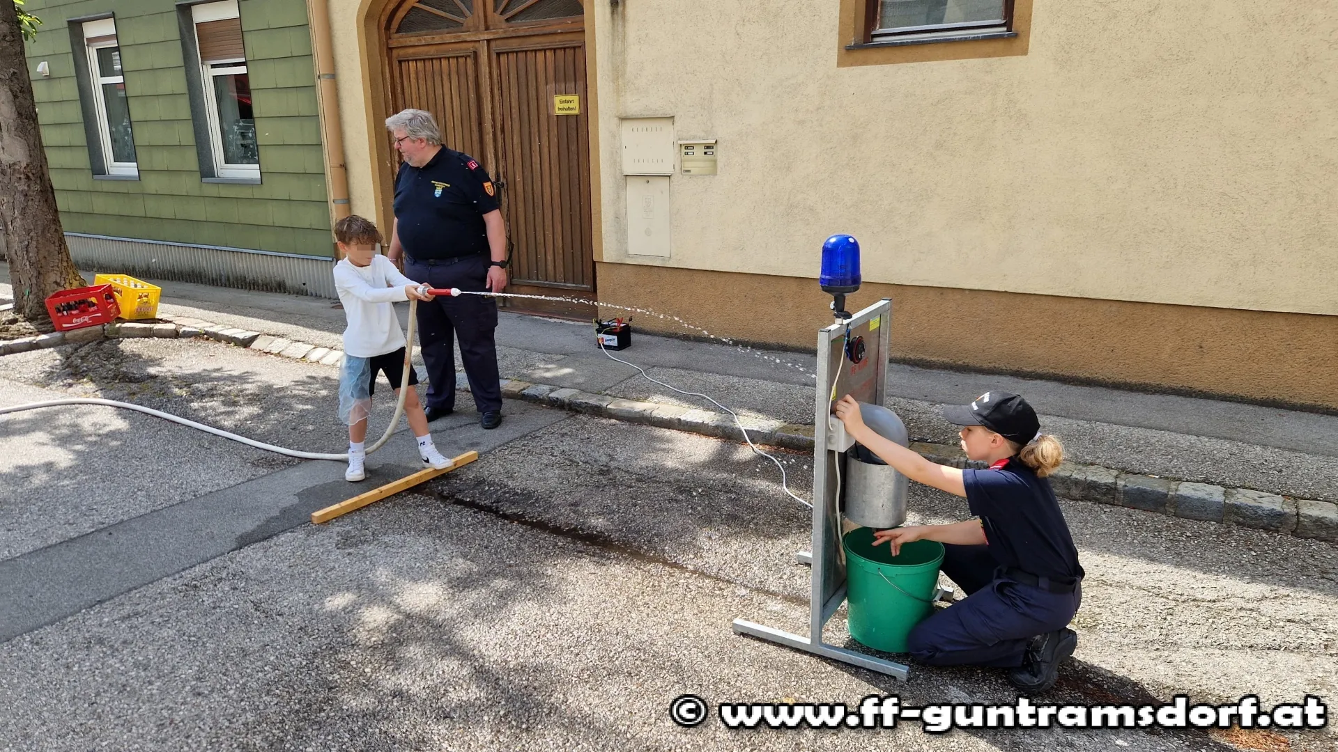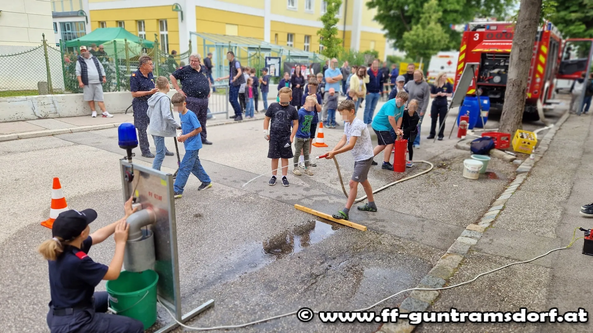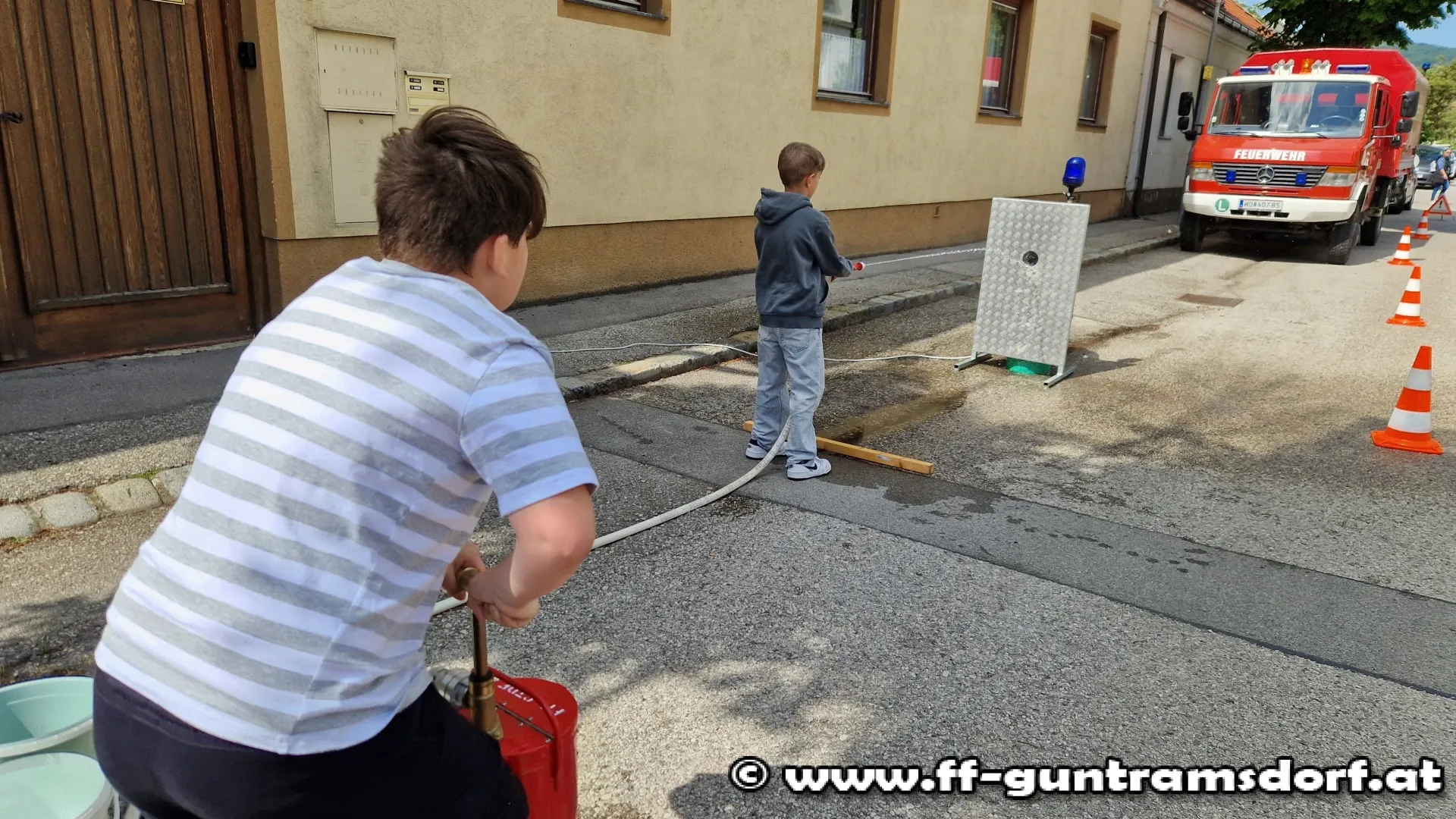 Die Feuerwehr organisierte vor dem Eingang in der Schulgasse einen Wettbewerb im Zielspritzen. Dabei ging es darum, in möglichst kurzer Zeit Wasser aus einer Kübelspritze zielgerecht in einen Behälter hinter einer Spritzwand zu pumpen, wobei beide Teammitglieder durchaus gefordert waren. So erforderte die Pumparbeit Kraft und Kondition während der „Strahlrohrführer“ ins Ziel treffen musste, was sich oft als schwieriger herausstellte als gedacht.