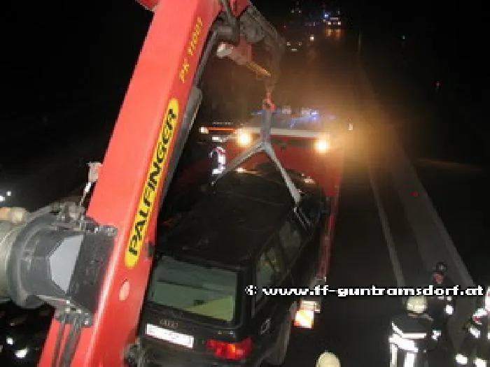Zunächst wurde der Audi aus Baden auf den Last verladen. Dabei stellten wir fest, dass der PKW-Tank mehrere lecke Stellen aufwies, aus welchen eine relativ große Menge Treibstoff ausfloss. Hier half rasch und wirkungsvoll ein Dichtungspulver, welches mit Wasser vermischt solche Lecks hervorragend verschließt. Anschließend wurde das Wrack auf einem geeignet Platz abgestellt. Ebenso wurden die beiden anderen Unfallwagen mit der Abschleppbrille des SRF von der Unfallstelle verbracht.