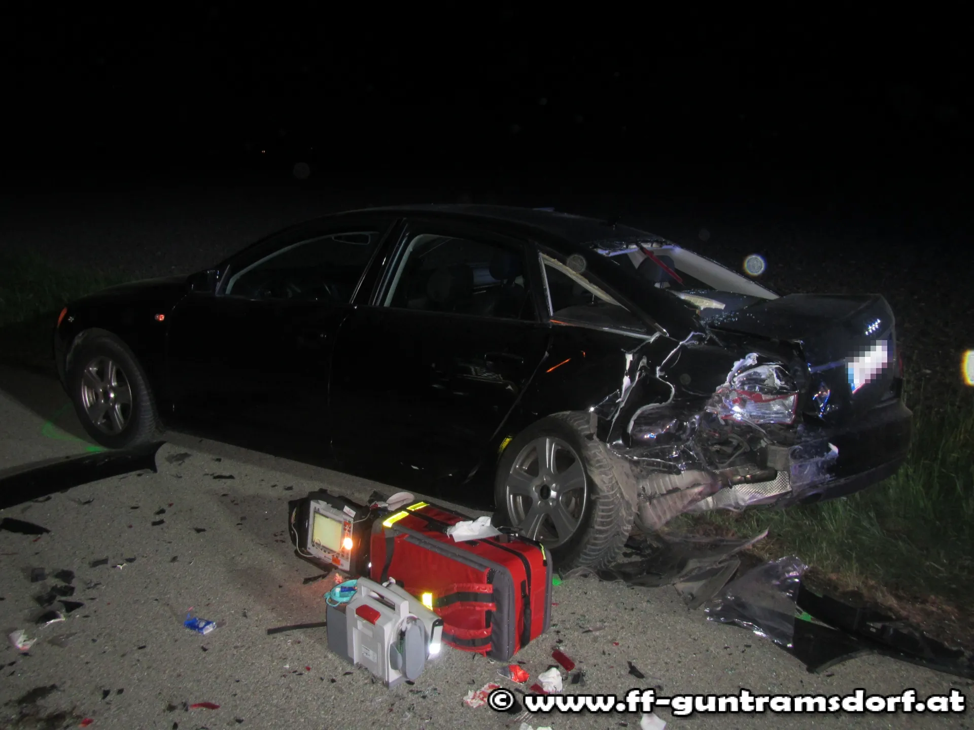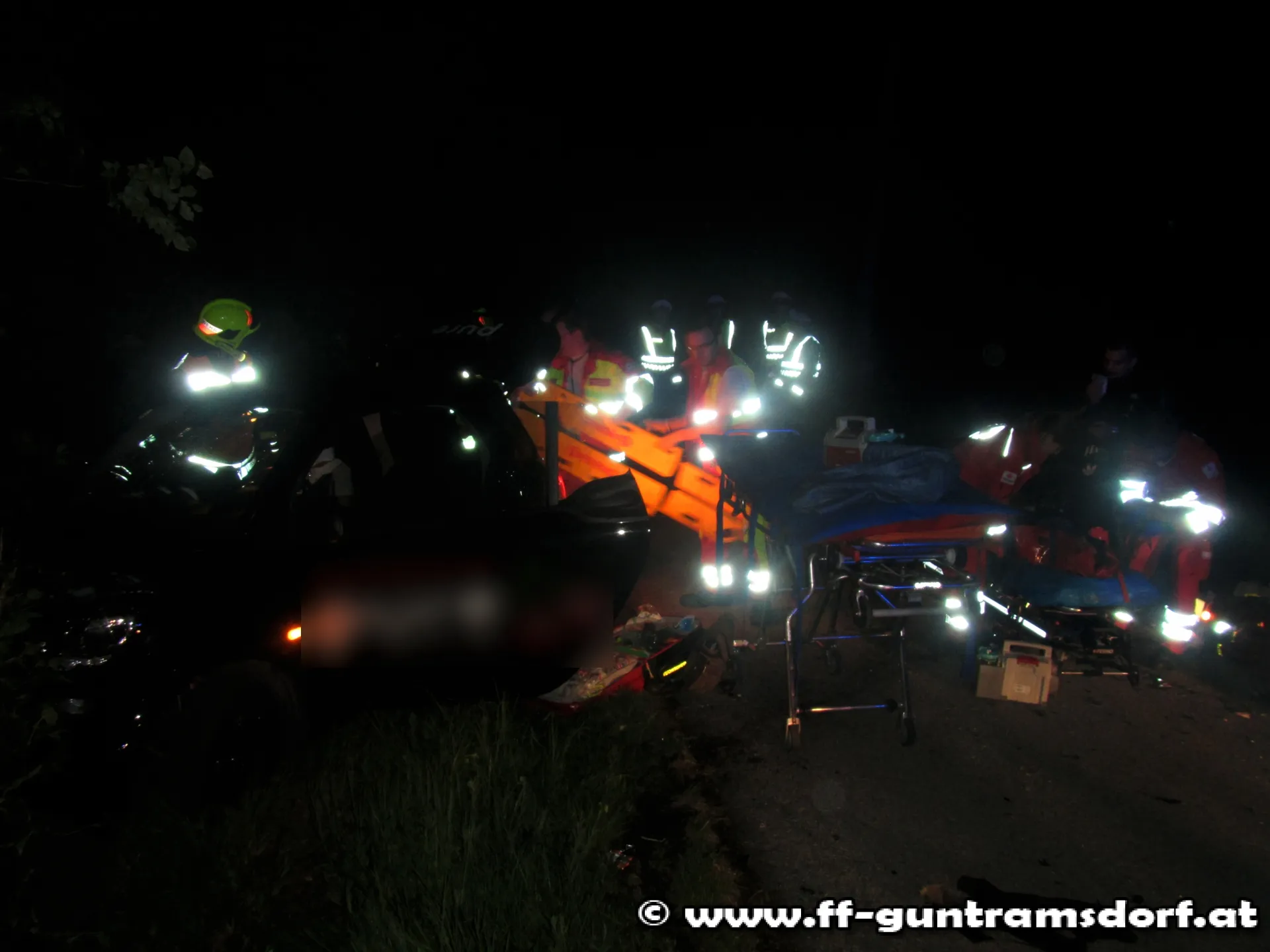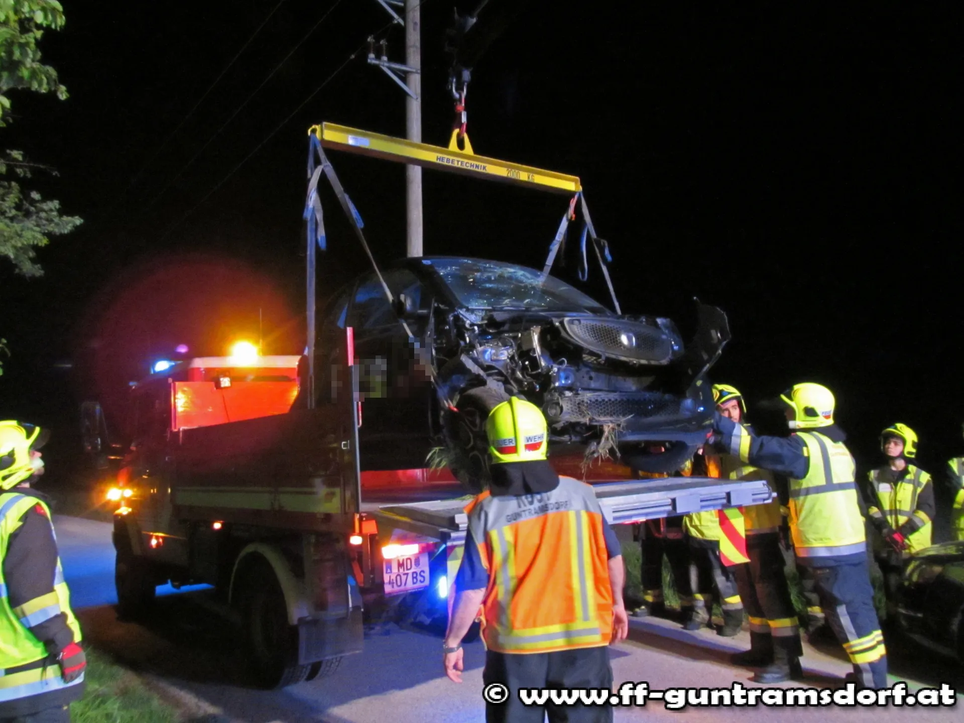 Um 23,10 Uhr wurde die FF Guntramsdorf zu einer Fahrzeugbergung nach einem Verkehrsunfall mit zwei beteiligten PKW auf der L2085 (Münchendorferstraße) alarmiert. Beim Eintreffen an der Unfallstelle (kurz nach dem Kreisverkehr Richtung Münchendorf) teilte der an der Unfallstelle bereits anwesende Rettungsdienst der Feuerwehr mit, dass sich noch eine verletzte Person in einem Fahrzeug befinde, sich jedoch die Türe nicht öffnen ließe. Nach Entfernung eines Gebüsches mit Hilfe einer Motorsäge, konnte nach wenigen Minuten die Türe geöffnet und die Person vom Rettungsdienst übernommen werden. Bei diesem Unfall wurden drei Personen verletzt.