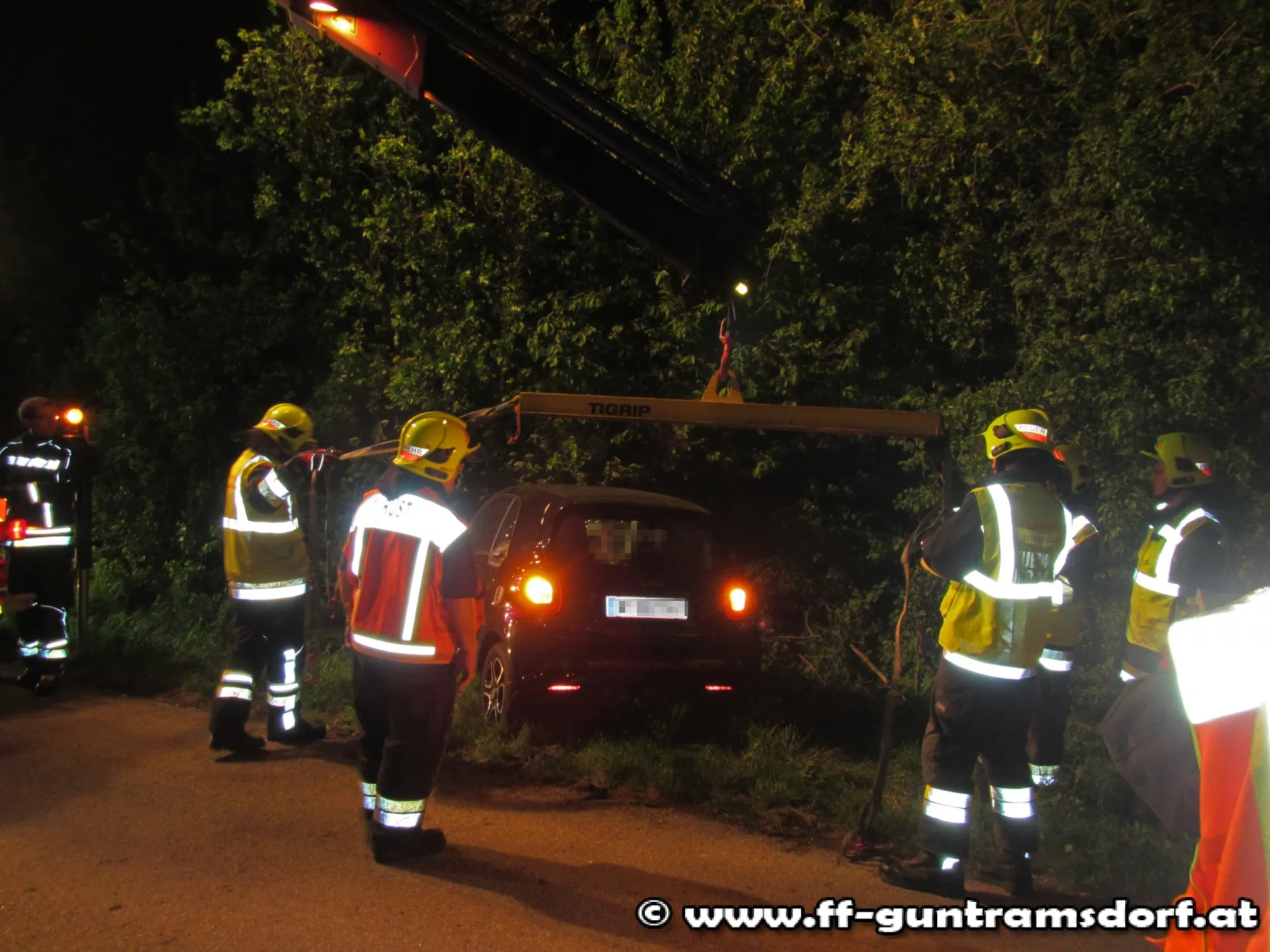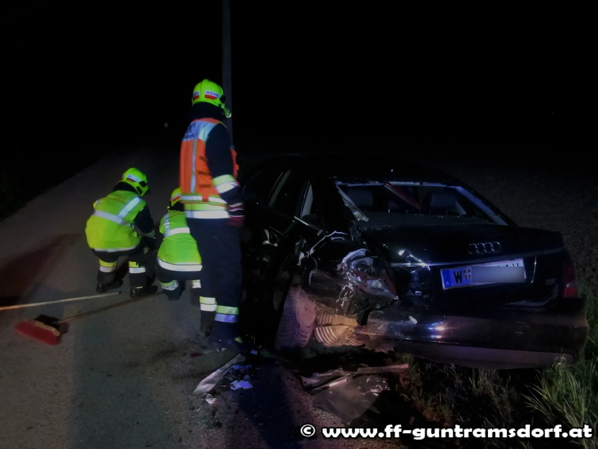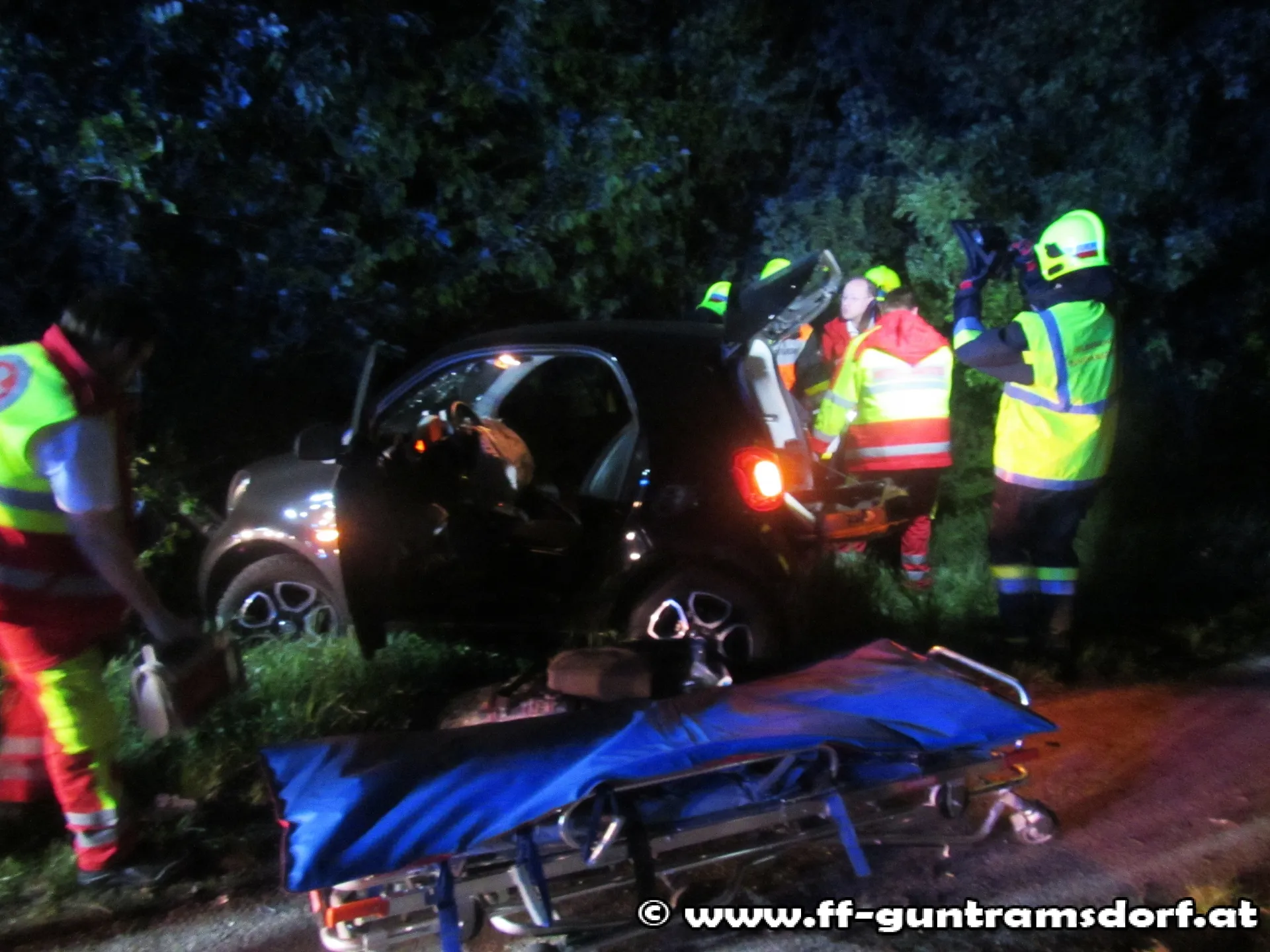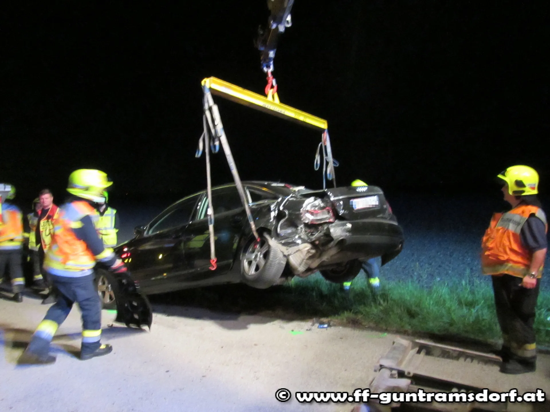 Um 23,10 Uhr wurde die FF Guntramsdorf zu einer Fahrzeugbergung nach einem Verkehrsunfall mit zwei beteiligten PKW auf der L2085 (Münchendorferstraße) alarmiert. Beim Eintreffen an der Unfallstelle (kurz nach dem Kreisverkehr Richtung Münchendorf) teilte der an der Unfallstelle bereits anwesende Rettungsdienst der Feuerwehr mit, dass sich noch eine verletzte Person in einem Fahrzeug befinde, sich jedoch die Türe nicht öffnen ließe. Nach Entfernung eines Gebüsches mit Hilfe einer Motorsäge, konnte nach wenigen Minuten die Türe geöffnet und die Person vom Rettungsdienst übernommen werden. Bei diesem Unfall wurden drei Personen verletzt.